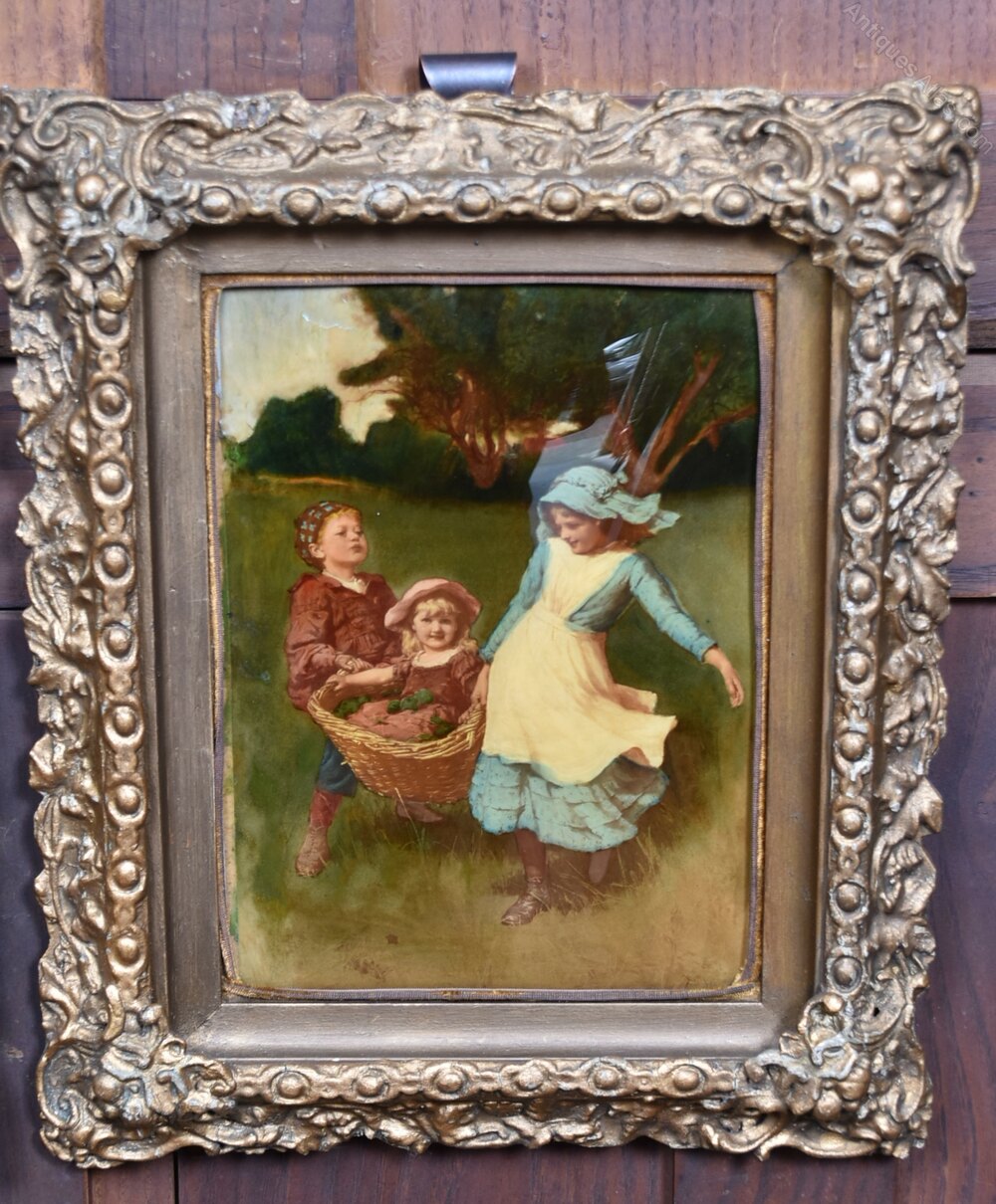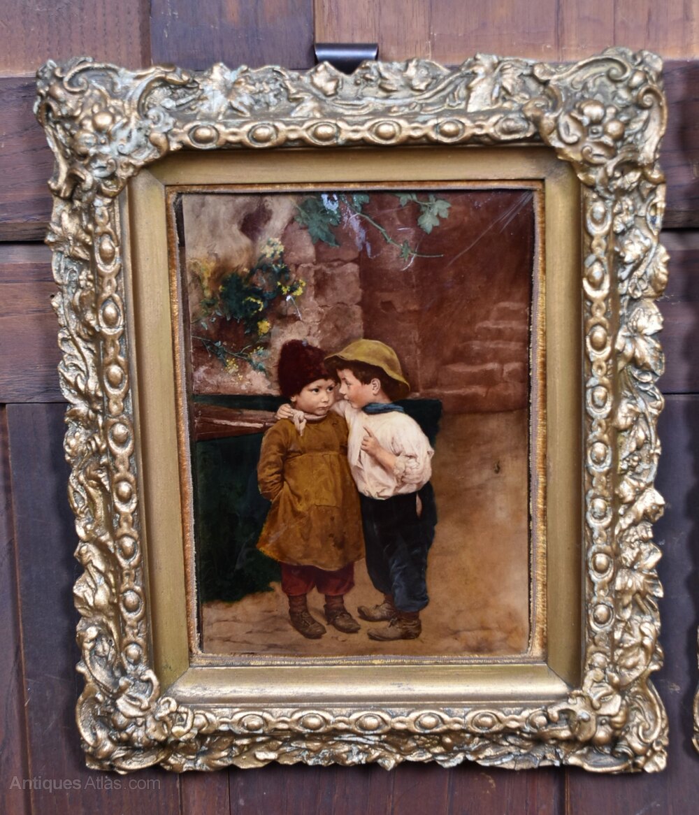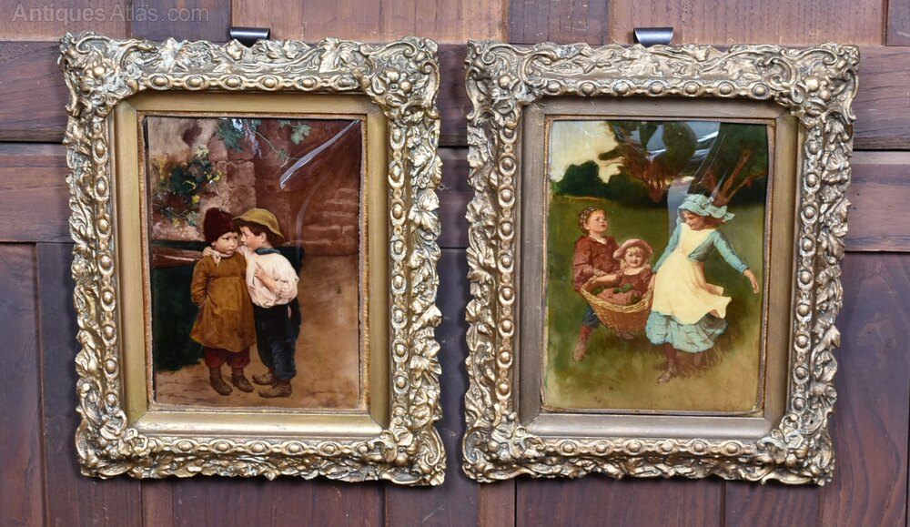 A magnificent pair of Crystoleums depict charming children at play, originating from the distinguished Victorian era. These fine artworks are created by applying paint to delicate, curved glass panels, which are then set in ornately carved, original gilt frames. Typical of antiques, they possess some imperfections that serve to augment their distinctive character and charm. As Christmas approaches, they would make an exquisite gift for a cherished woman in your life.