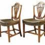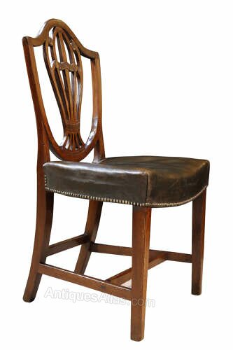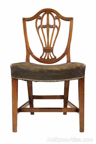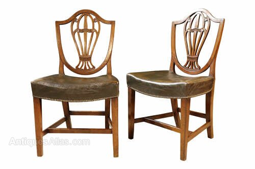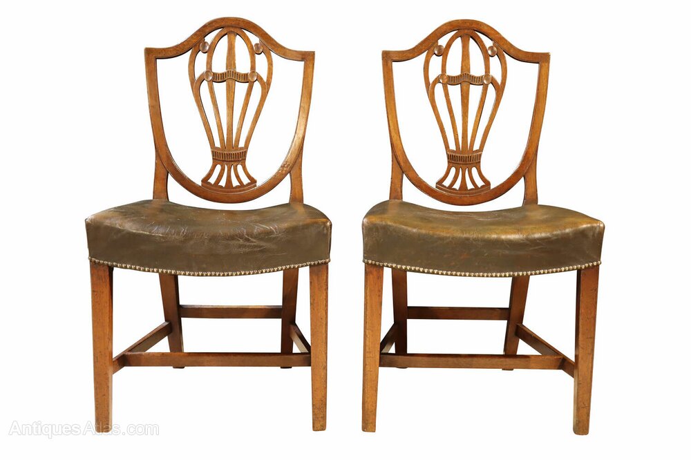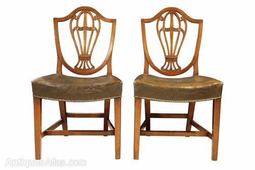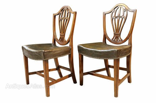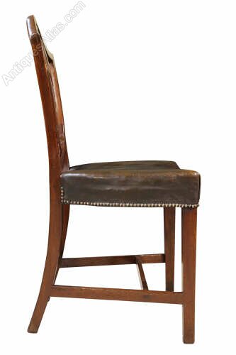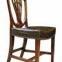 This elegant pair of Georgian mahogany shield back chairs, dating circa 1820, showcases the refined craftsmanship typical of early 19th-century English furniture. The chairs feature intricately carved shield backs with classical urn motifs, a hallmark of Georgian design. Constructed from solid mahogany, they offer both durability and timeless appeal.