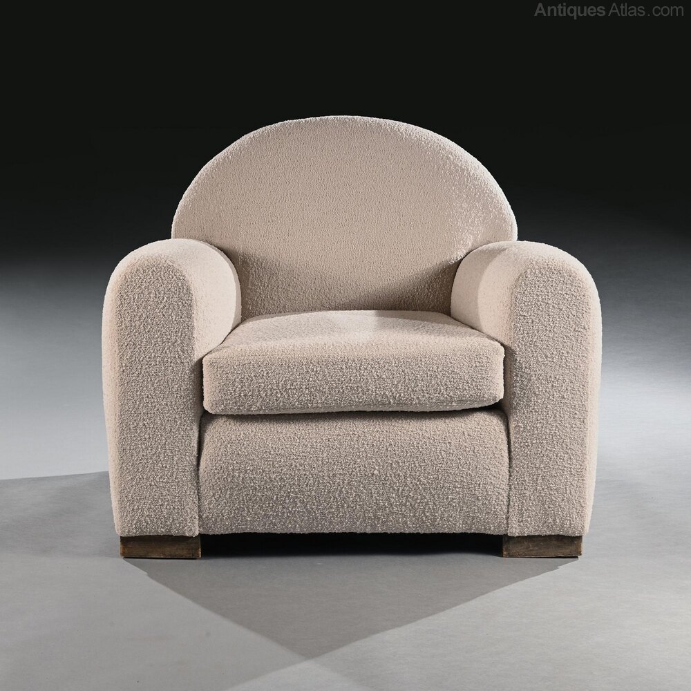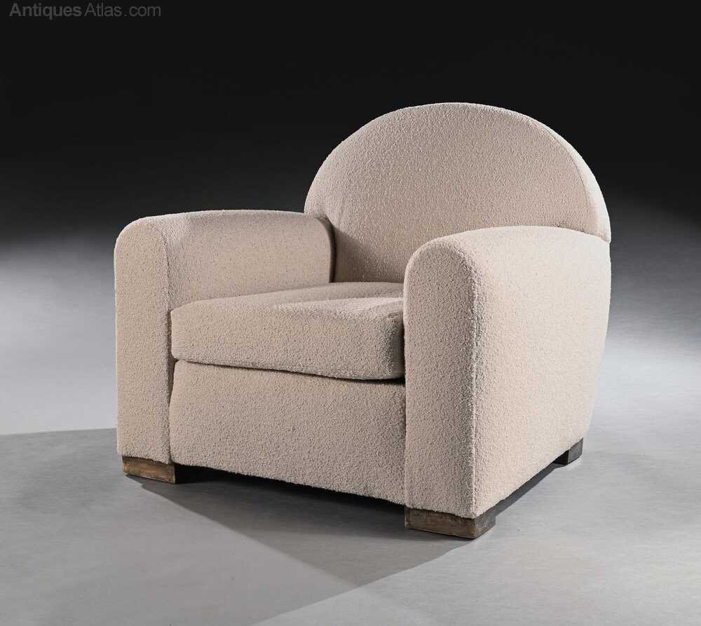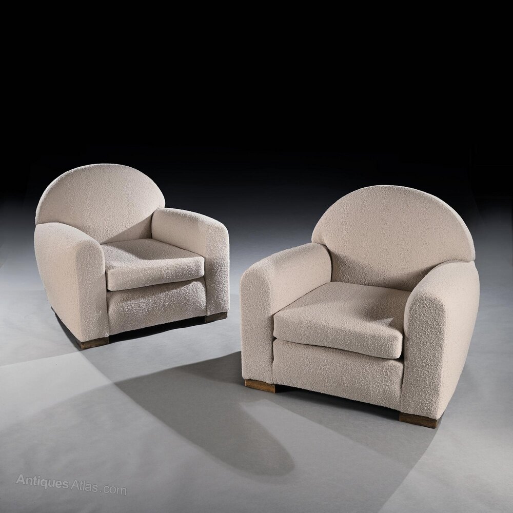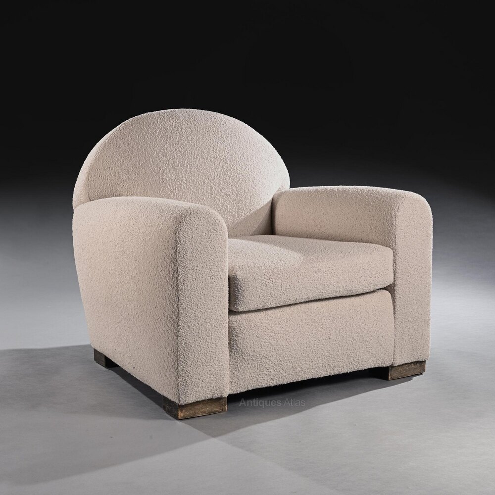 These chairs are of a peculiarly French form known as the club chair. Chairs of this sort were designed by many of the great French designers of the Art Deco period and later and the present chairs incorporate stylistic elements which relate to designs from two the 20th century's greatest furniture designers, Jean Royère and Jean-Michel Frank. Royère's Ours Polaire or Polar Bear chair is a design classic of the late 1940s and there are certainly elements in common between that landmark design and the present pair of armchairs. Equally relevant however and Frank's designs. One of those, still in production via luxury brand Hermès today, is known as the "comfortable club" chair and, barring the straight back to the seat rail and the arm supports, our chairs are remarkably similar to this design. Although it is not possible to say with certainty who might have designed these fine chairs, they would certainly have been made in Paris by one of the major makers of the period.