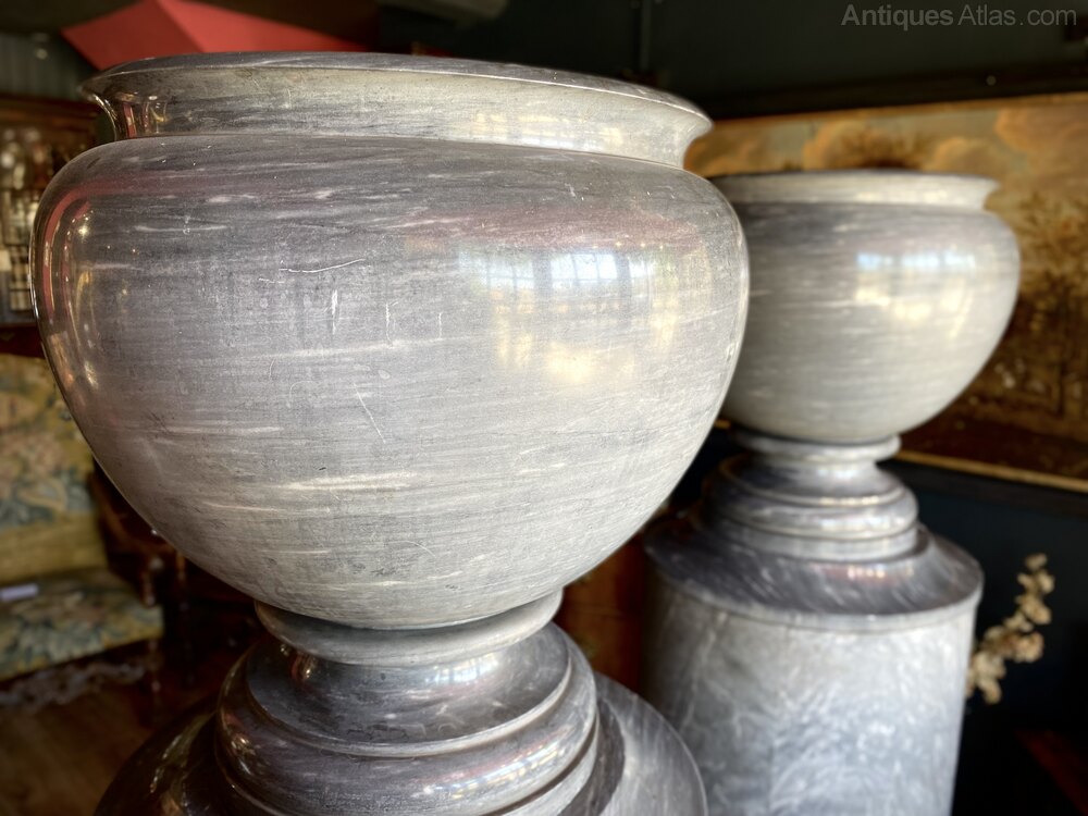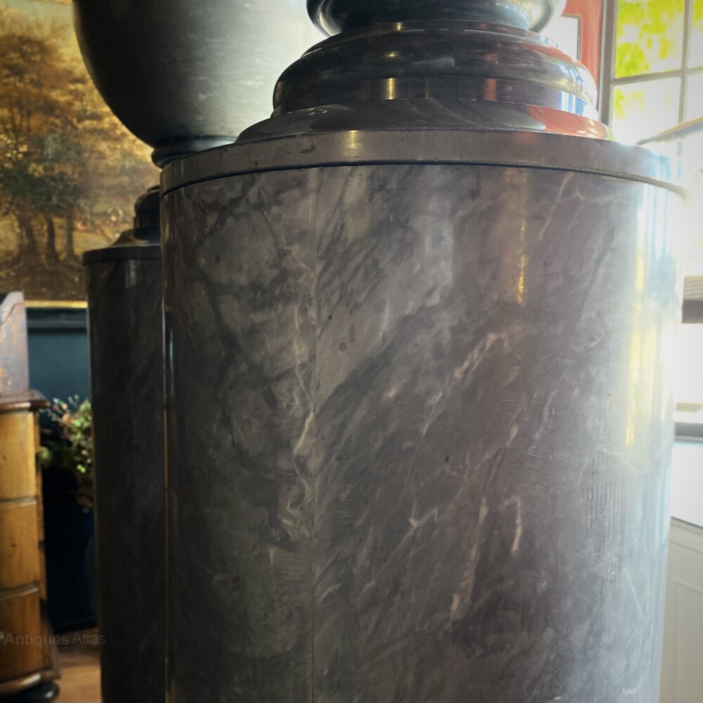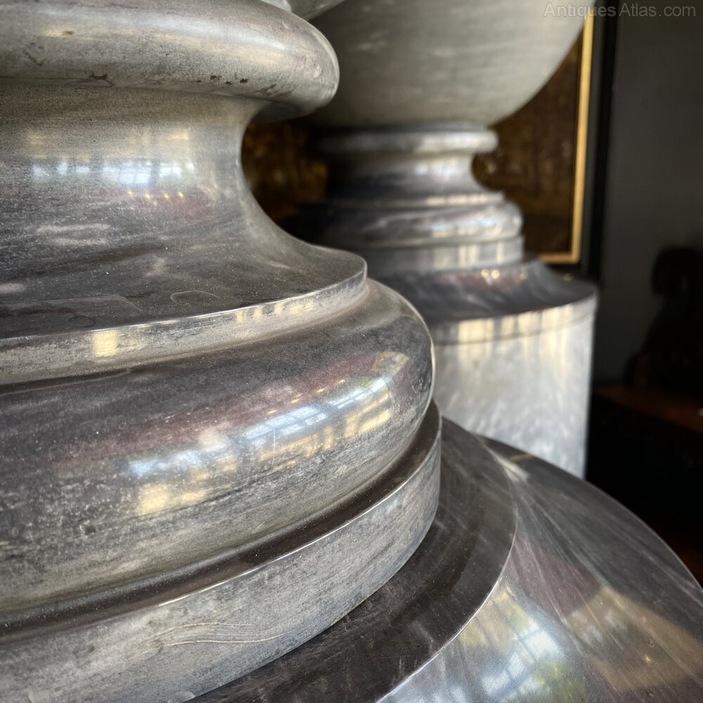 This imposing pair of Neoclassic Urns are formed from finest Italian Grey Marble, and were imported to the UK around the turn of the 20th Century.