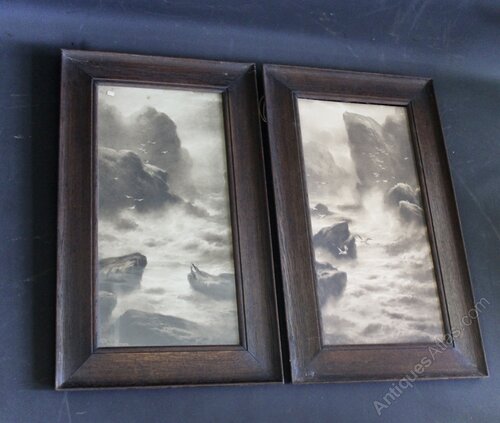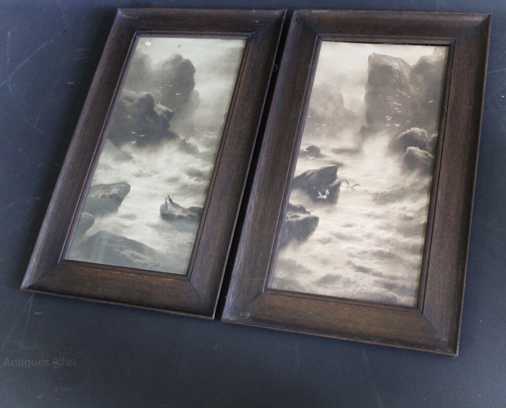Pair of oak arts and crafts period frames with coastal scenes, one with glazing. Measures 77 cm high x 44.5 cm wide x 2.5 cm deep. the width of the frame is 8cm