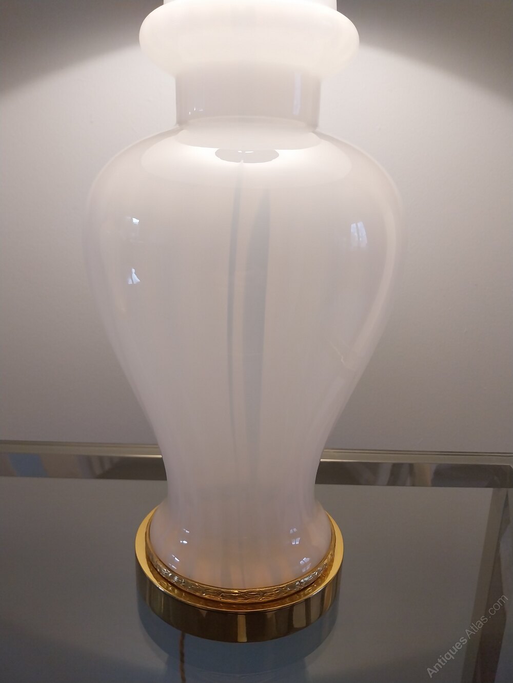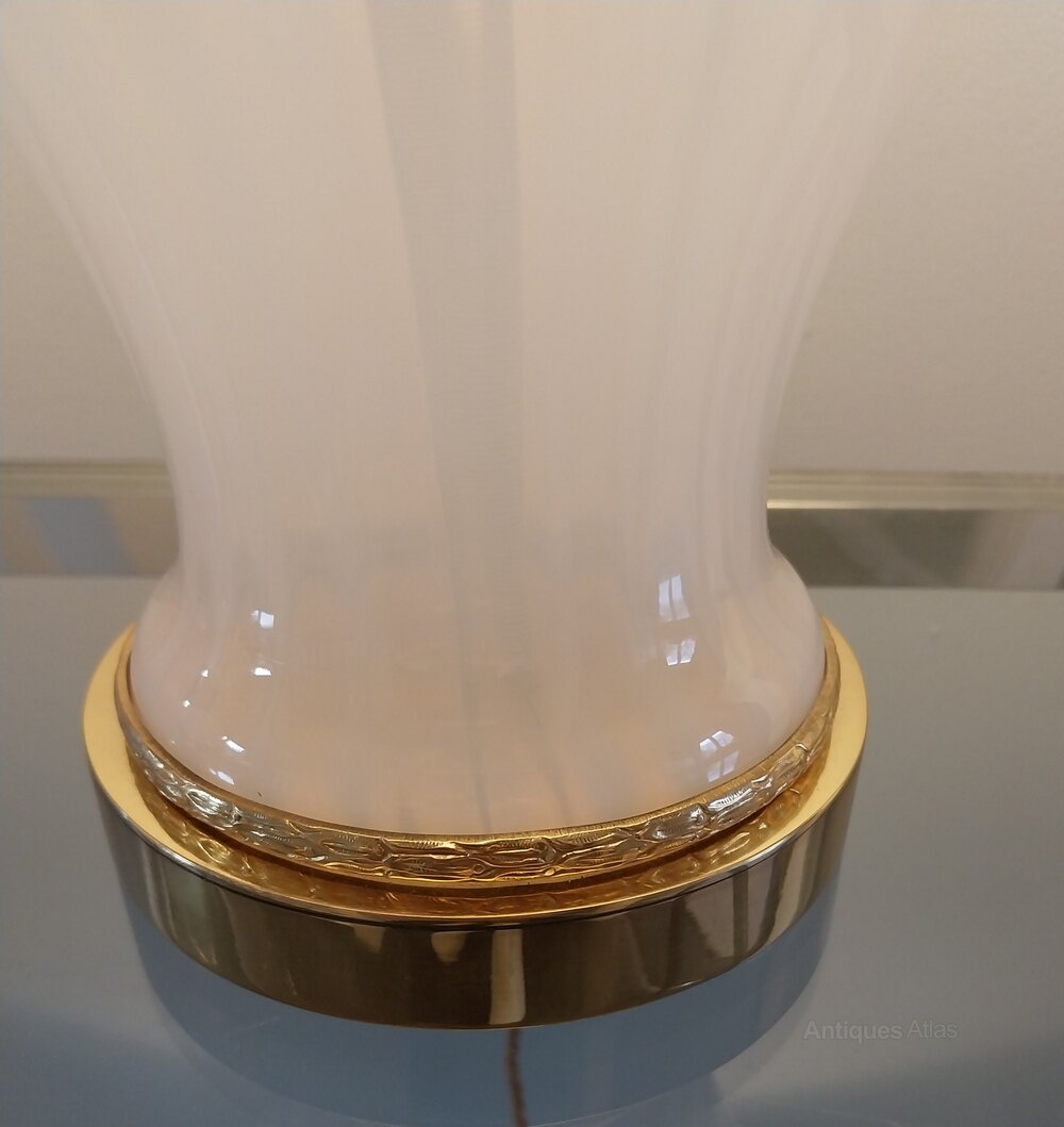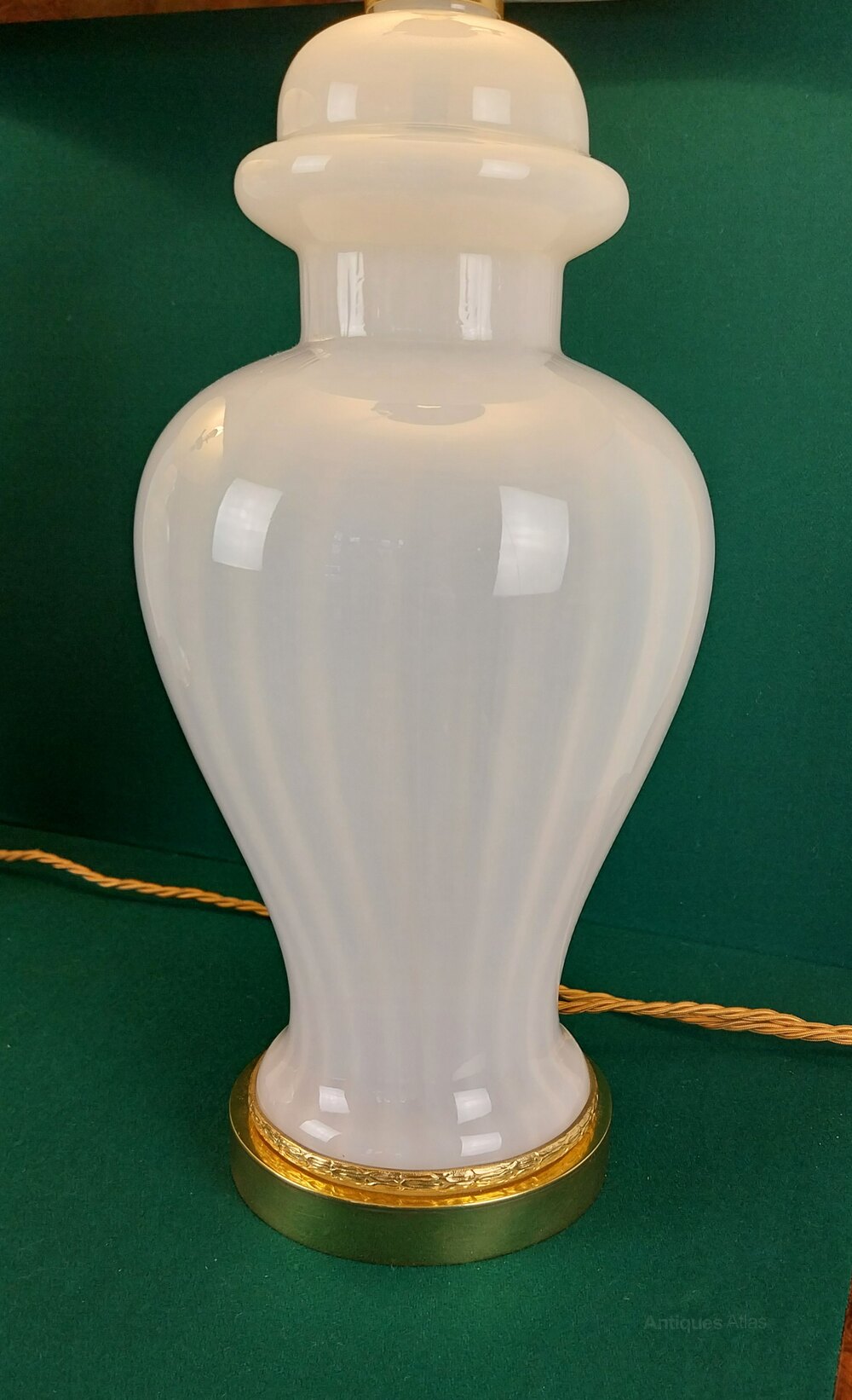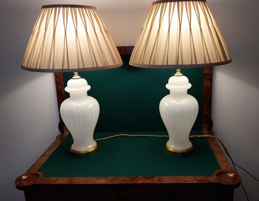 A very fine Pair of white Opaline glass Table Lamps, circa 1920 with hand-blown opaline glass with ribbed interior gives luminous milky-white surface that subtly shifts in tone under light. The superb quality bases are cast in bronze and gilded. These beautiful Pair of Lamps reflect early 20th-century design sensibilities, combining graceful curves with understated elegance.