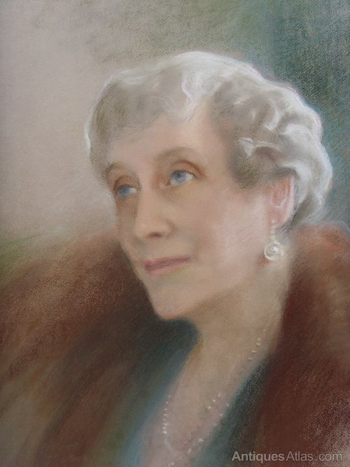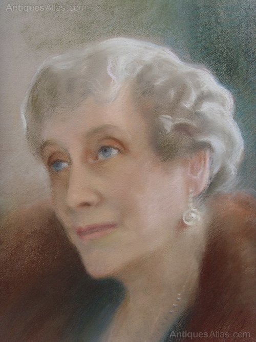 The portrait depicts a lady in her later years, with a very kind face and wonderful blue eyes. She is wearing a sea-green dress with a fur coat over it and has on a pearl necklace and pearl drop earrings.