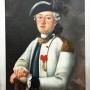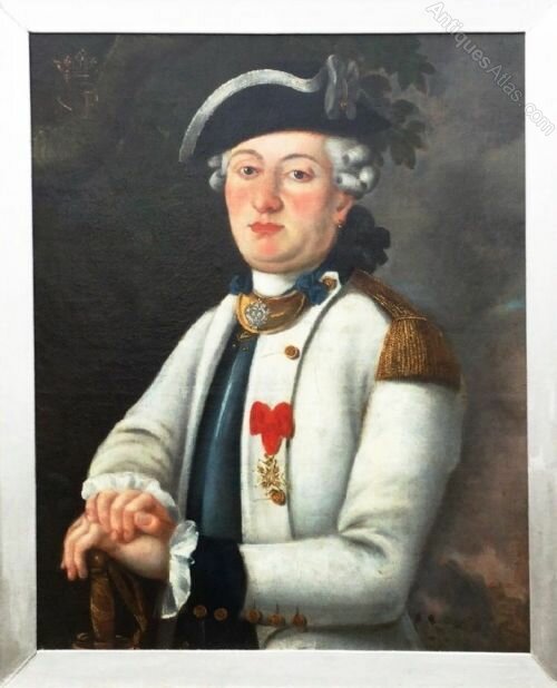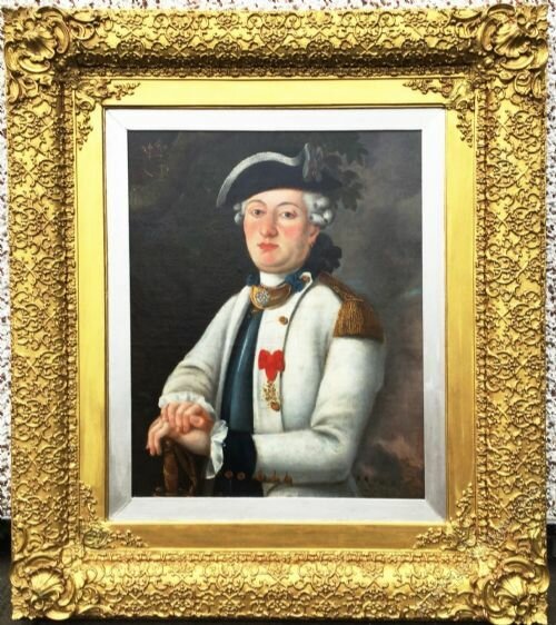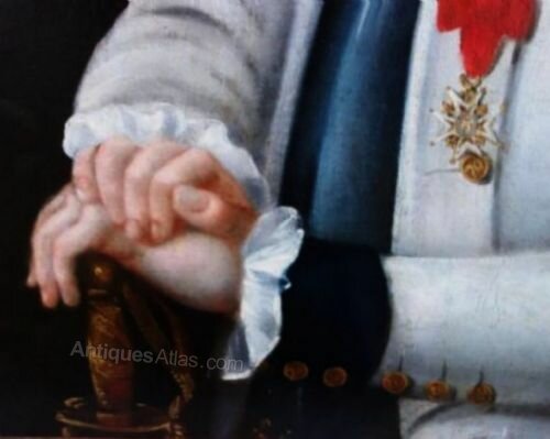 He wears an officers white long coat with matching lapels, his sleeves decorated with multiple brass buttons and gold braided epaulettes dress his shoulders.Below his chin he wears a gold silk cravat held in situ by two small blue velvet bows tied either side and finished with a silver decorative broach.His shirt is a blue silk under garment of quality.