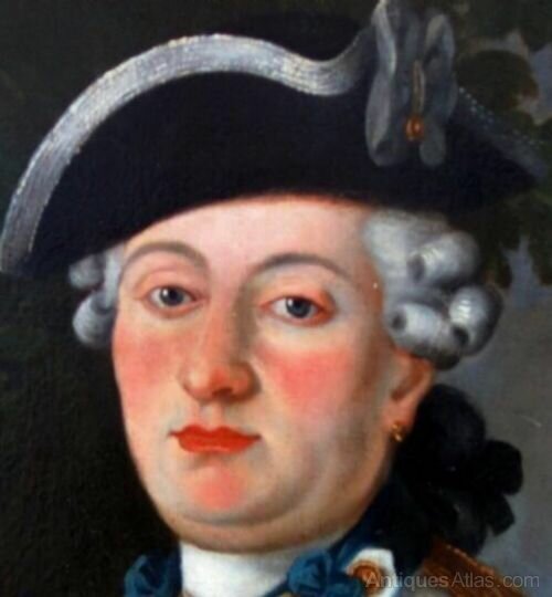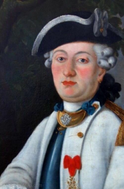 The officers hands are extremely well defined and his appearance is of nobility, his grey powdered hair held in perfect curls and with a gold ear ring pierced through the lobe of his ear.