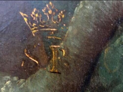 The portrait has been signed with initials S.R below a crown in the top left corner of the canvas.