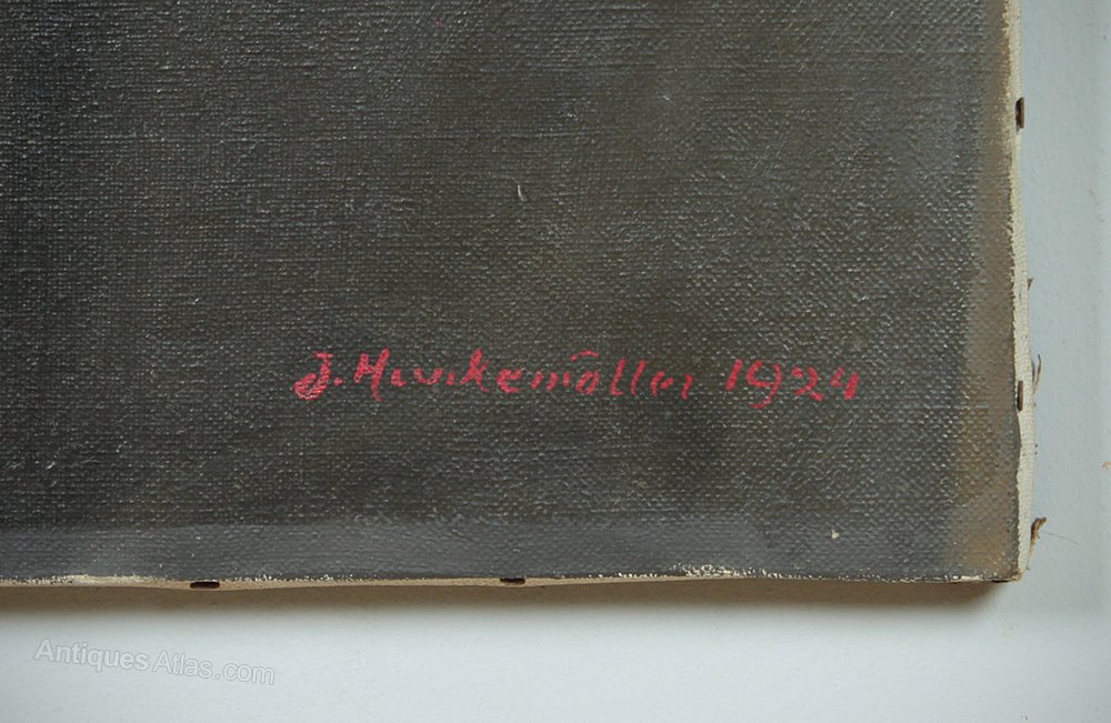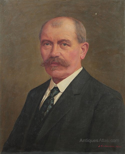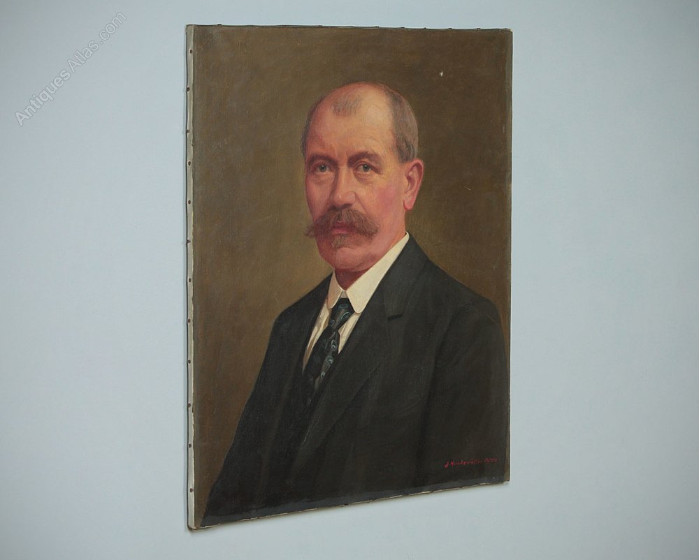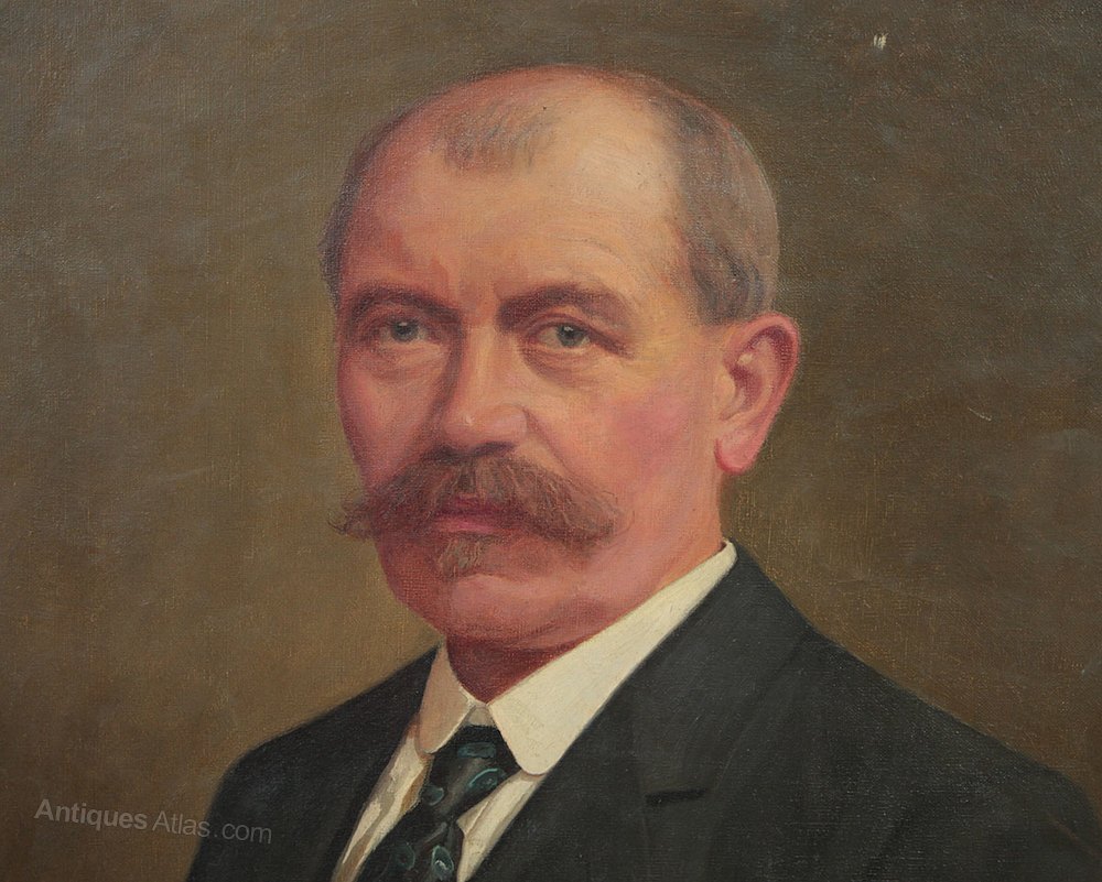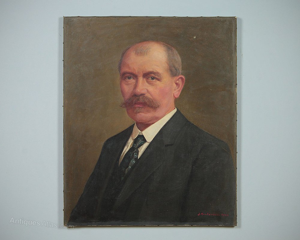 Portrait of a gentleman in oil on canvas dated 1924. Half length portrait of a serious looking gent with a large bushy moustache, dressed in a dark suit and silk tie. Signed in the lower left right corner (J.Hivikemoller?) and dated 1924. Very good condition, presented unframed on the original stretcher.