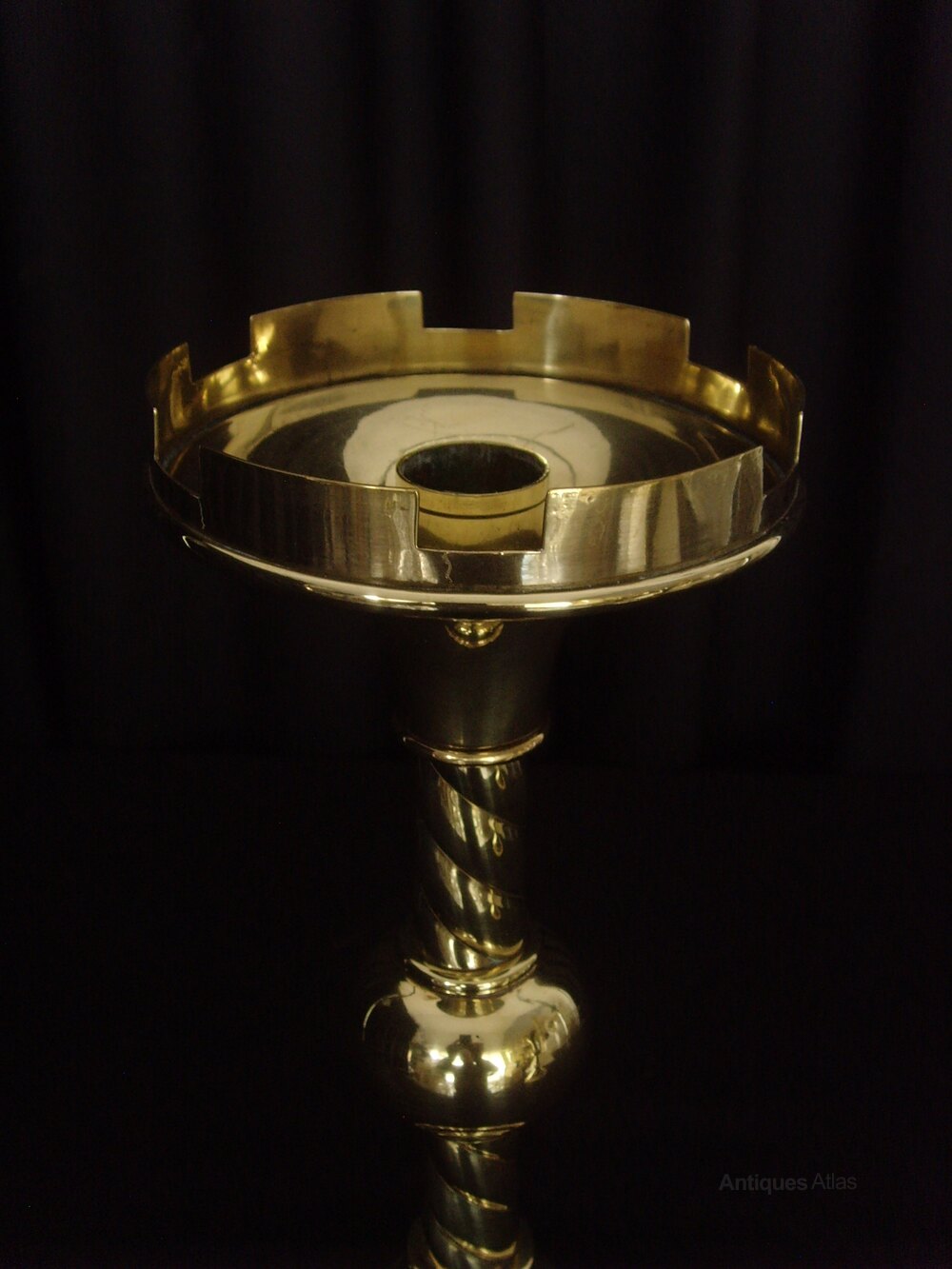 We are offering this heavy and fine quality pair of 19th Century Gothic Revival Candlesticks. They have stepped, conical bases, with three circular feet, two twist columns between the central socle and the flared, castellated drip pan with a hidden sconce.