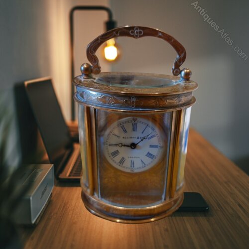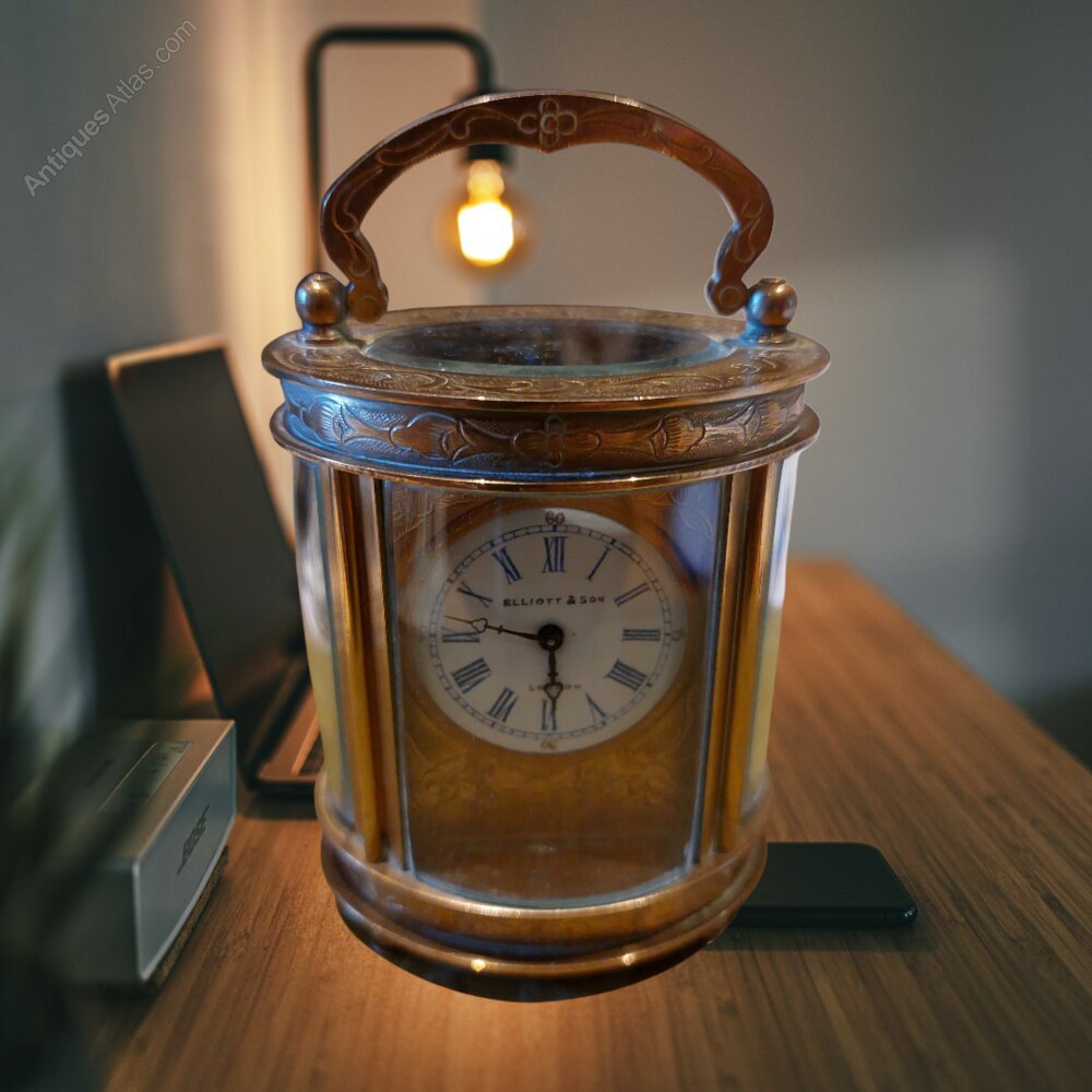 Fabulous quality antique early 1900s miniature carriage clock. By Elliott & Son London. Beautiful oval engraved case with bevelled edged glass panels all round. No cracks or chips to the glass. White enamelled dial with Roman numerals. 8 day French movement in working order keeps good time. Includes double sided key. Dates to the early 1900s. 4 1/4" high to top of handle x 2 3/4" wide x 2 1/4" deep.