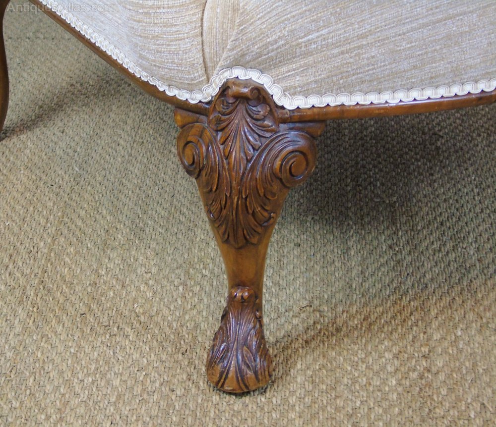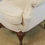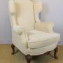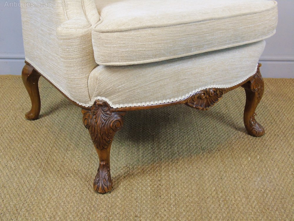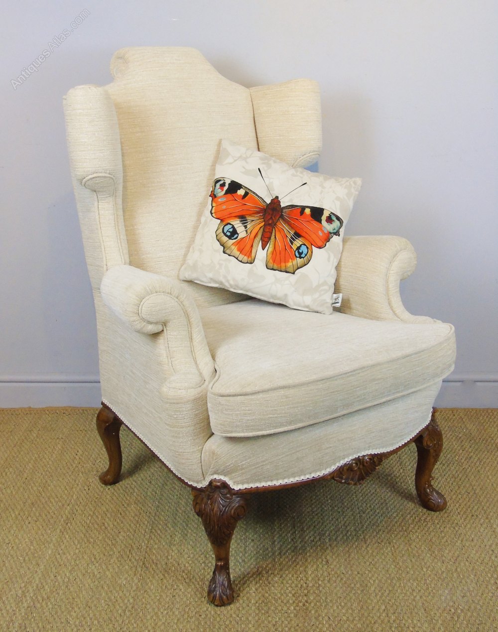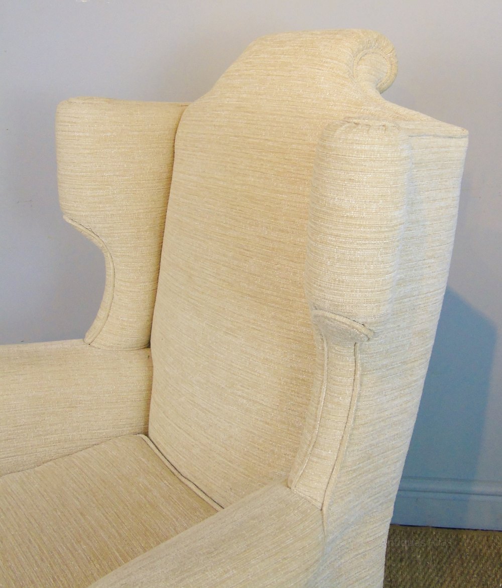 This is a good quality early 20th century wing arm chair beautifully reupholstered to a very high standard in a light oatmeal fabric. The chair has a great shape, with substantial Regency style scroll out wings and roll arms. The stout, solid cabriole legs are attractively carved with acanthus detail and the frieze to the centre is similarly carved to the exposed wood.