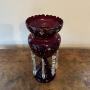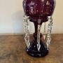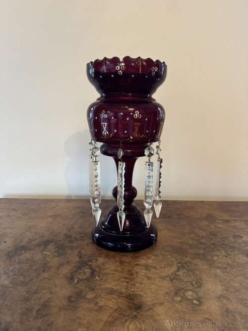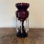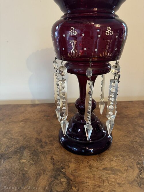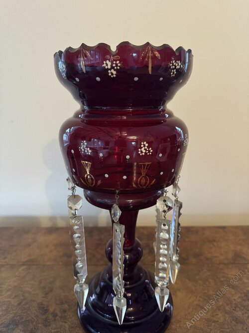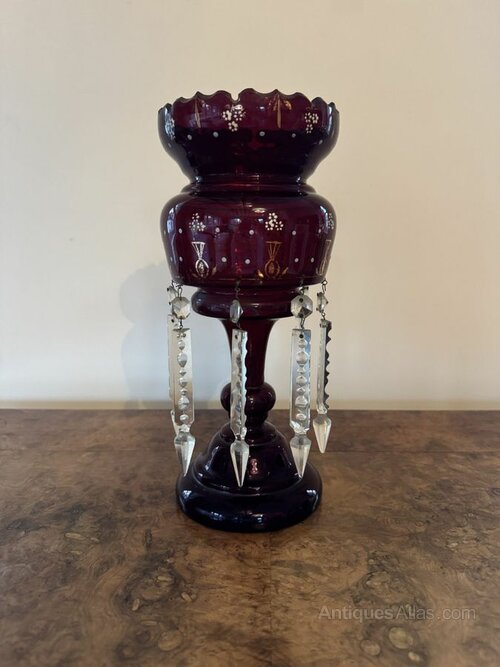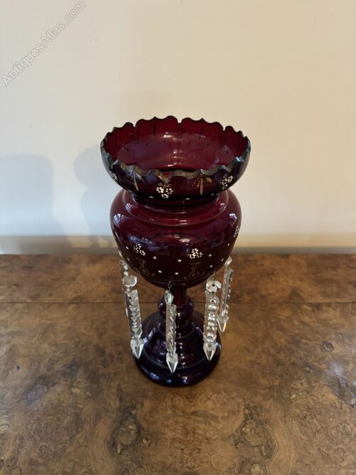 Beautiful quality large antique Victorian ruby glass lustre, decorated with white enamel floral detail and gold assets, having the original hanging prismatic glass drops, raised on a circular shaped base.