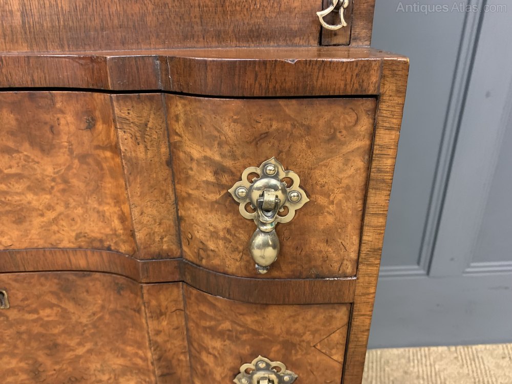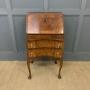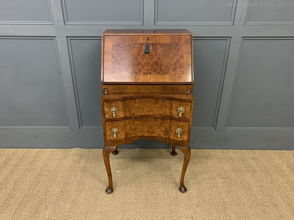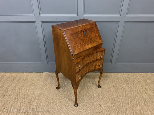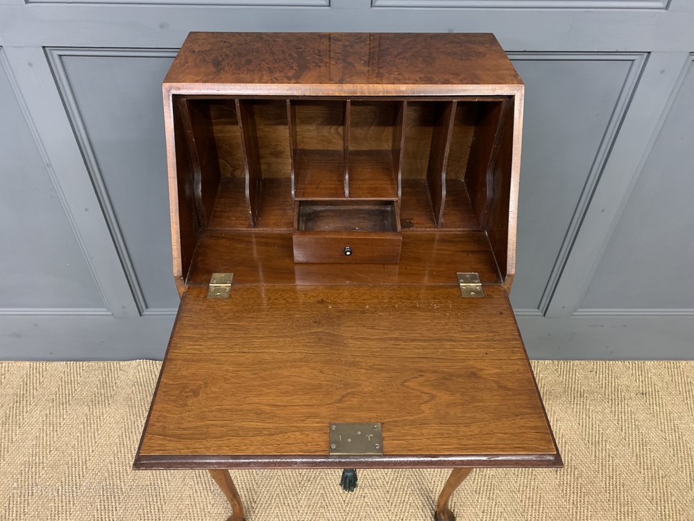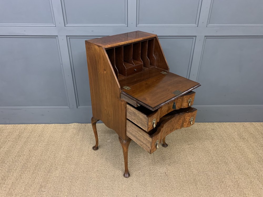 A charming burr walnut bureau in the queen Anne style. Well made in walnut with attractive burr walnut veneers. The fall front is cross banded and opens to reveal a fitted interior with pigeon holes and a small stationary drawer. Beneath the fall are two drawers, fitted with their original brass handles. The whole piece stands on elegant cabriole legs which terminate in pad feet. We have had this lovely bureau sympathetically repolished to a very high standard. It is now offered for sale in excellent condition, with a great colour and patina, ready to go straight into the home.