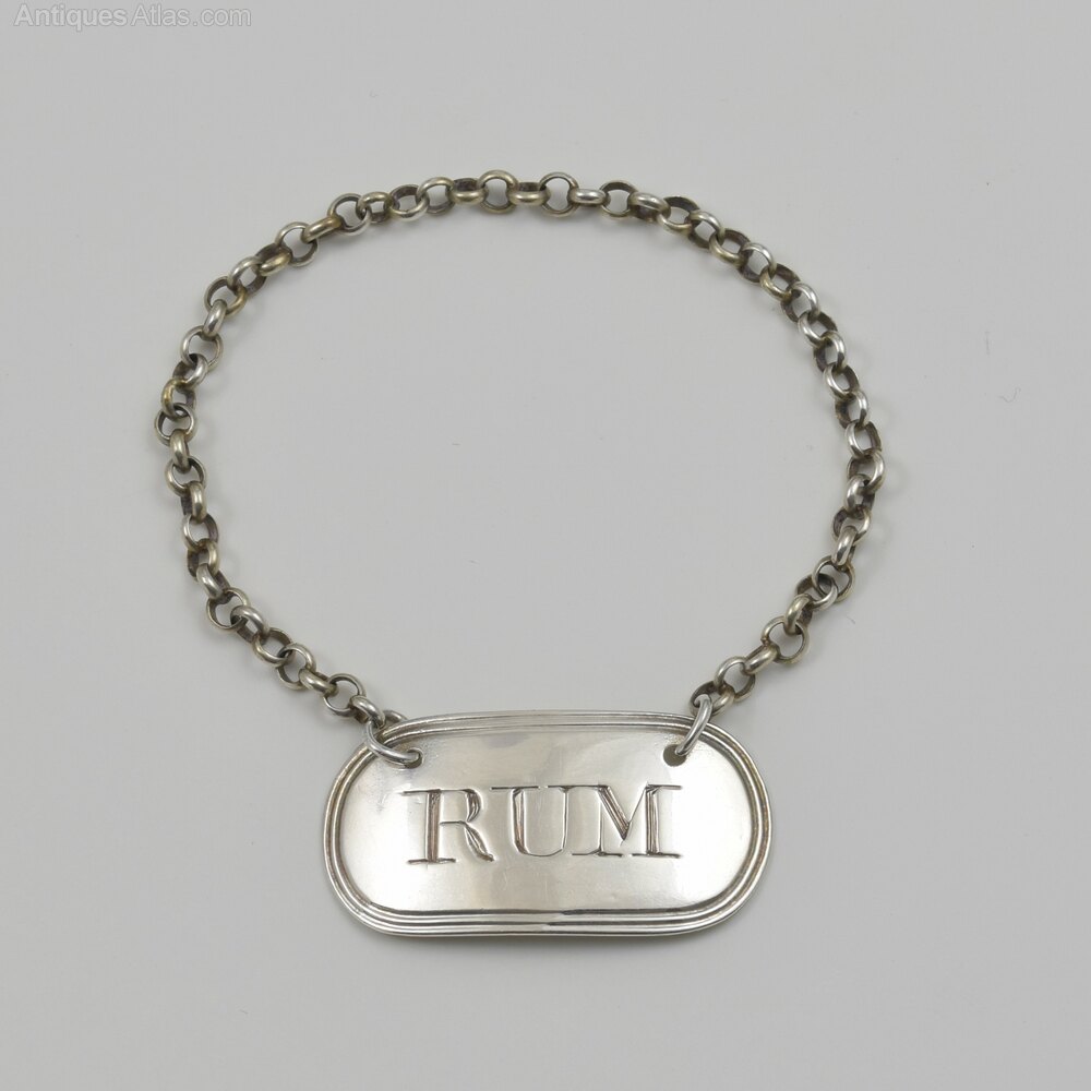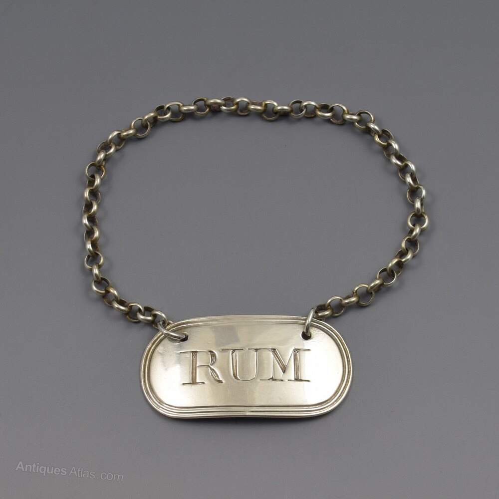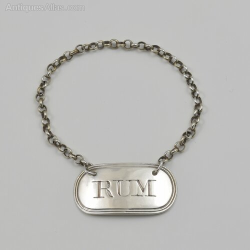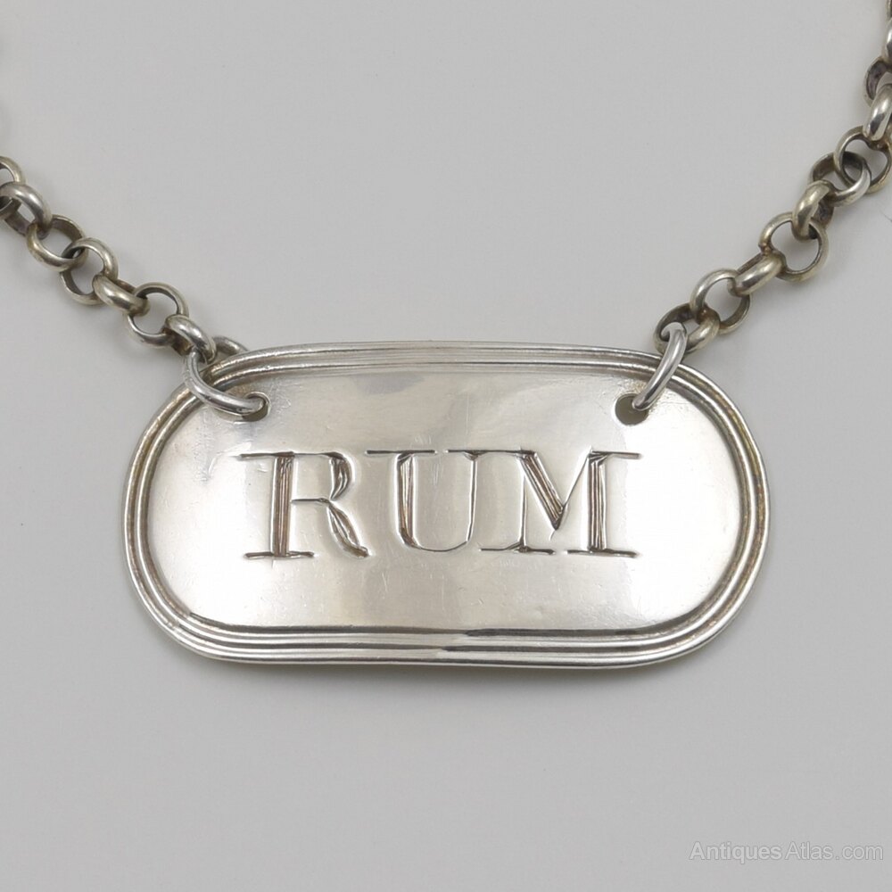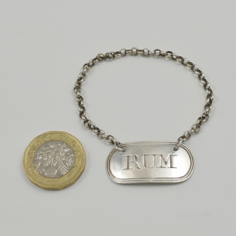 A rare 18th century silver decanter label of very small size, made for a small individual decanter known as "one go" decanter that would have been taken up to bed in the evening holding a nightcap. It is a simple oval shape with double reeded edge and engraved for Rum. Made by the highly collected female silversmith Elizabeth Morley, an early example of her work, stamped with her maker initials and hallmarked with the lion passant, the head of King George and the London date letter for 1797.