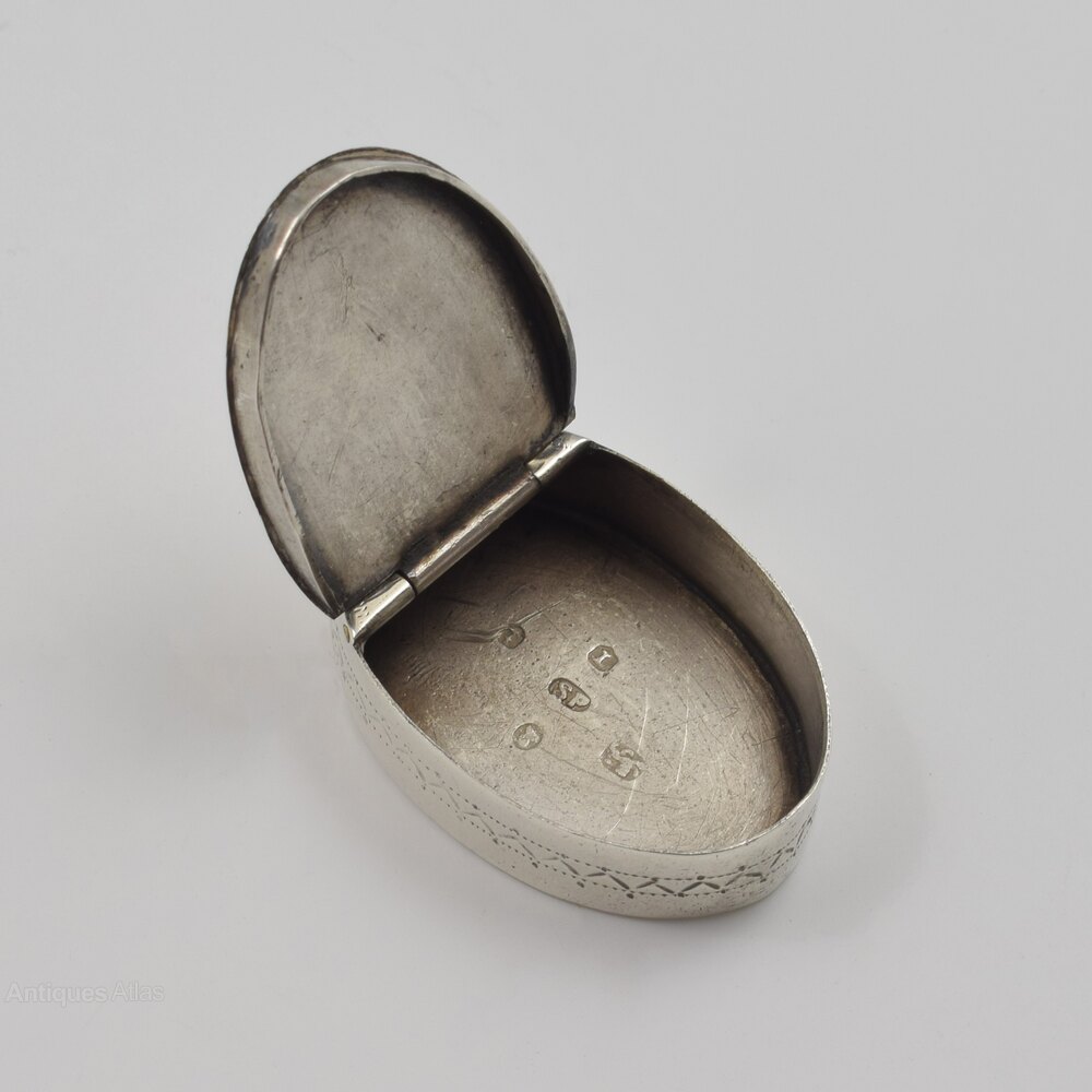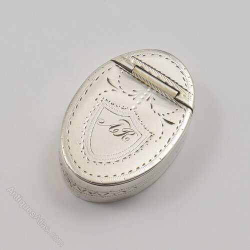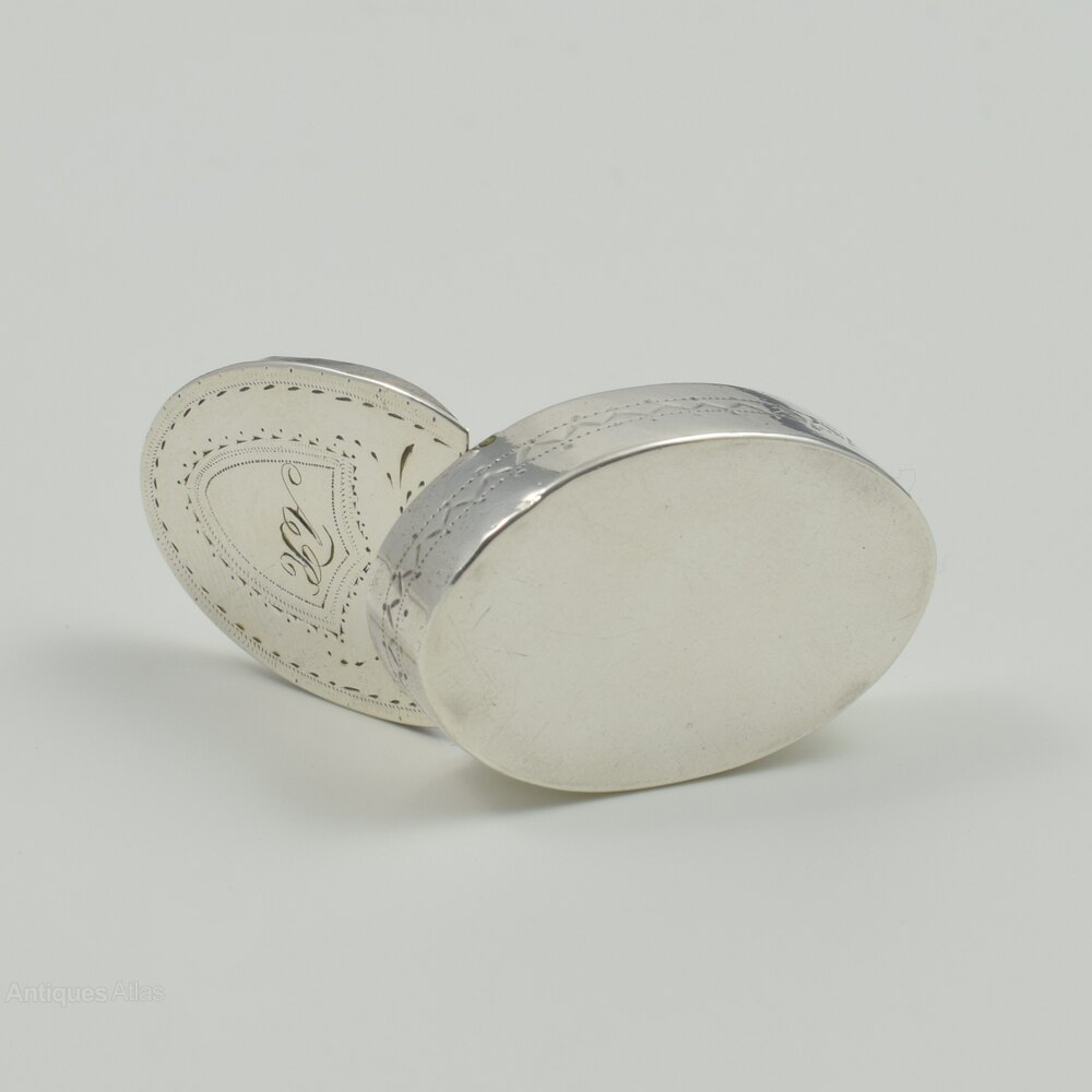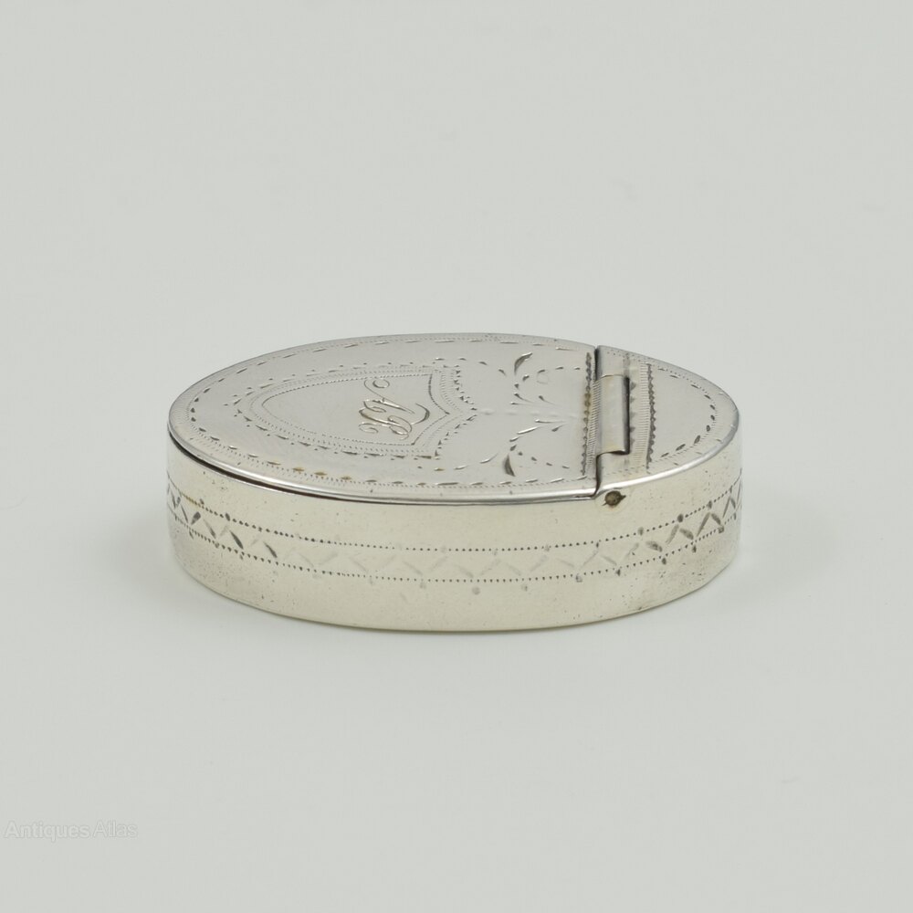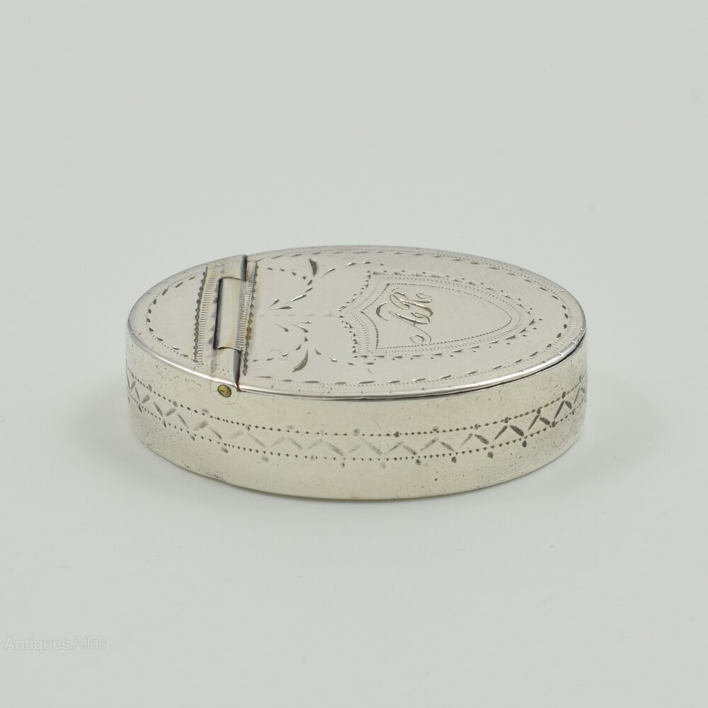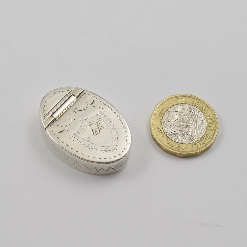 A very sweet, unusually small 18th century silver pill or snuff box of oval shape with hinged cover with inset hinge. The cover and sides with bright cut hand engraved decoration and a small shield shaped cartouche to the cover engraved with the original owner's initials AR. Hallmarked inside for Birmingham 1791, maker Samuel Pemberton, a specialist maker of very fine quality small pieces such as nutmeg graters, caddy spoons, vinaigrettes, etc.
