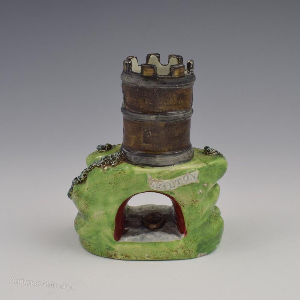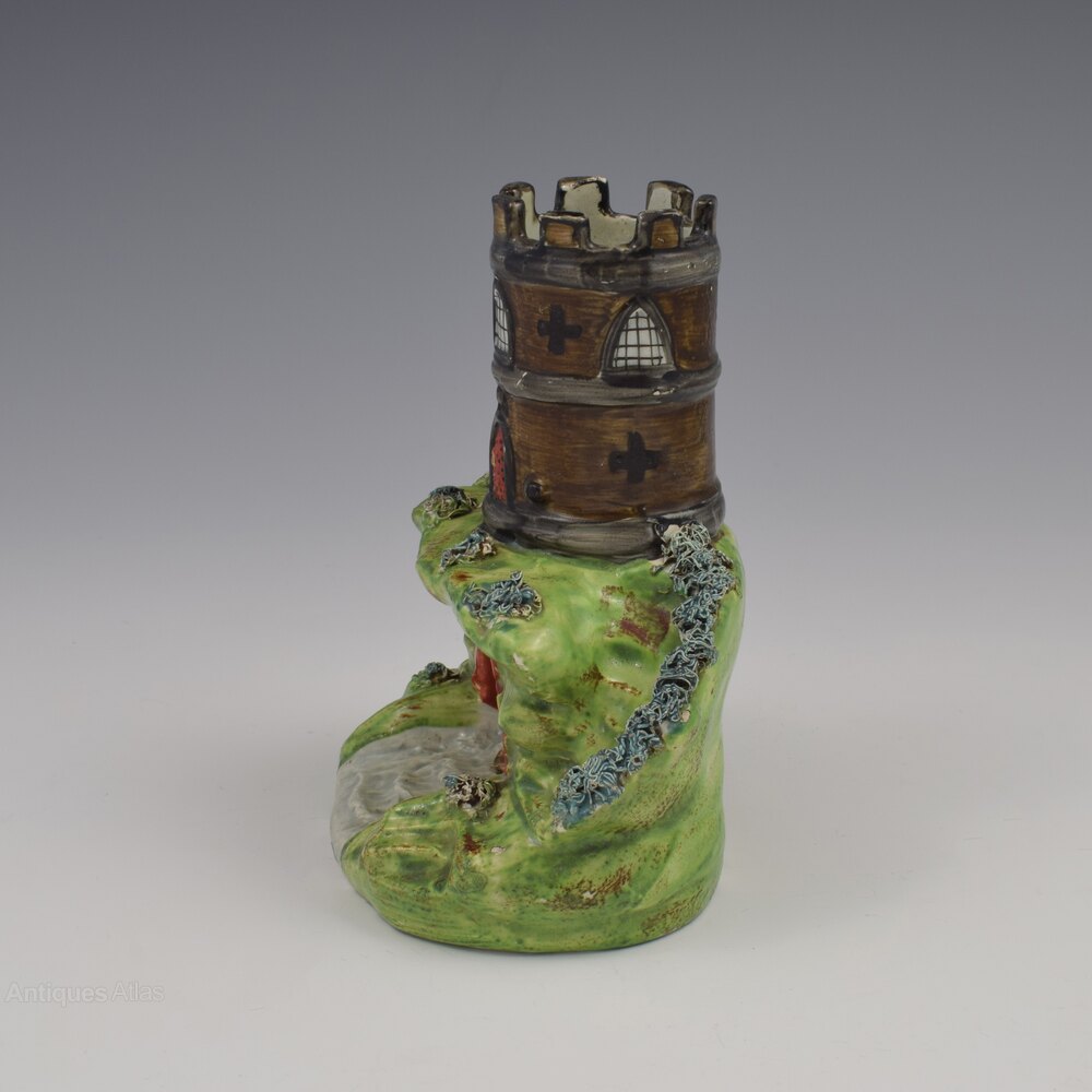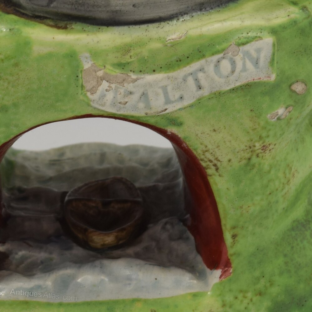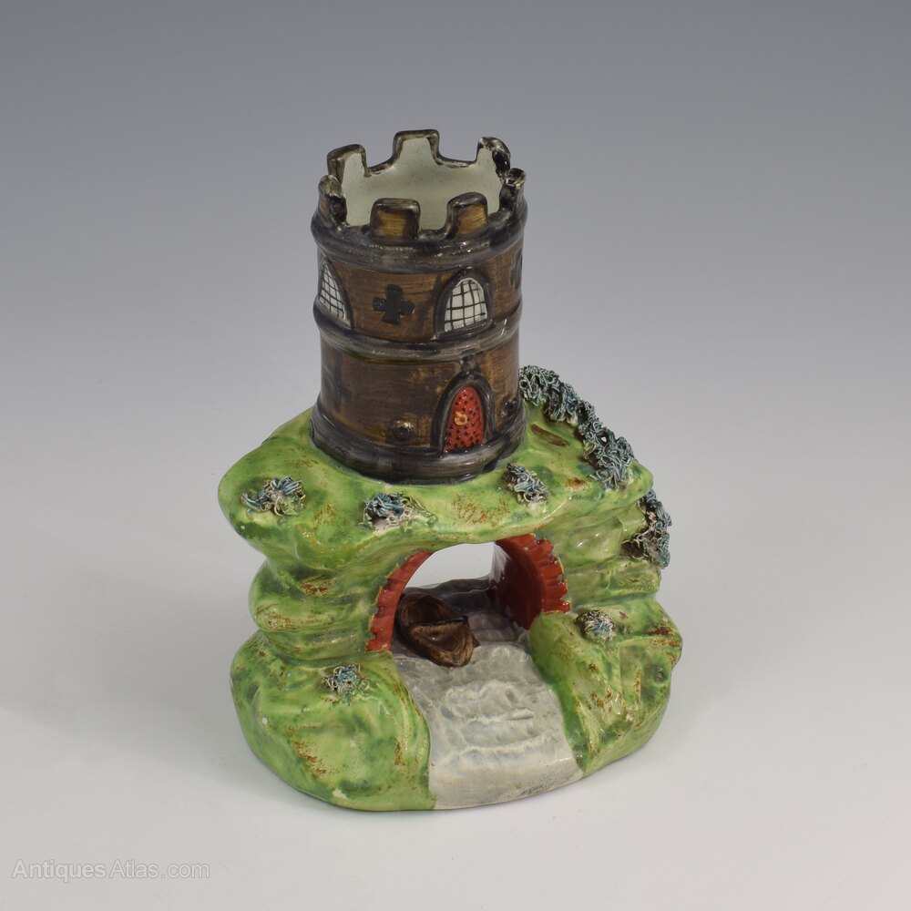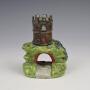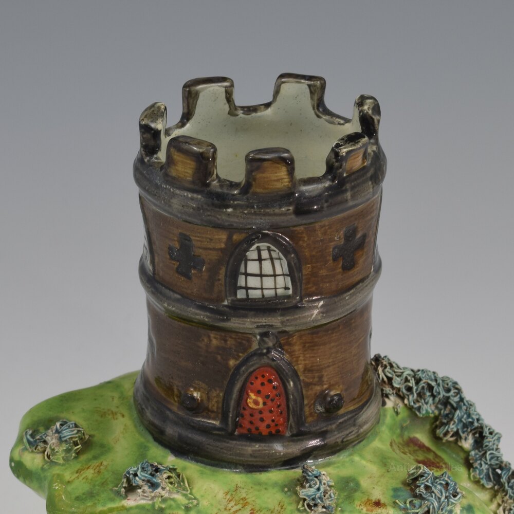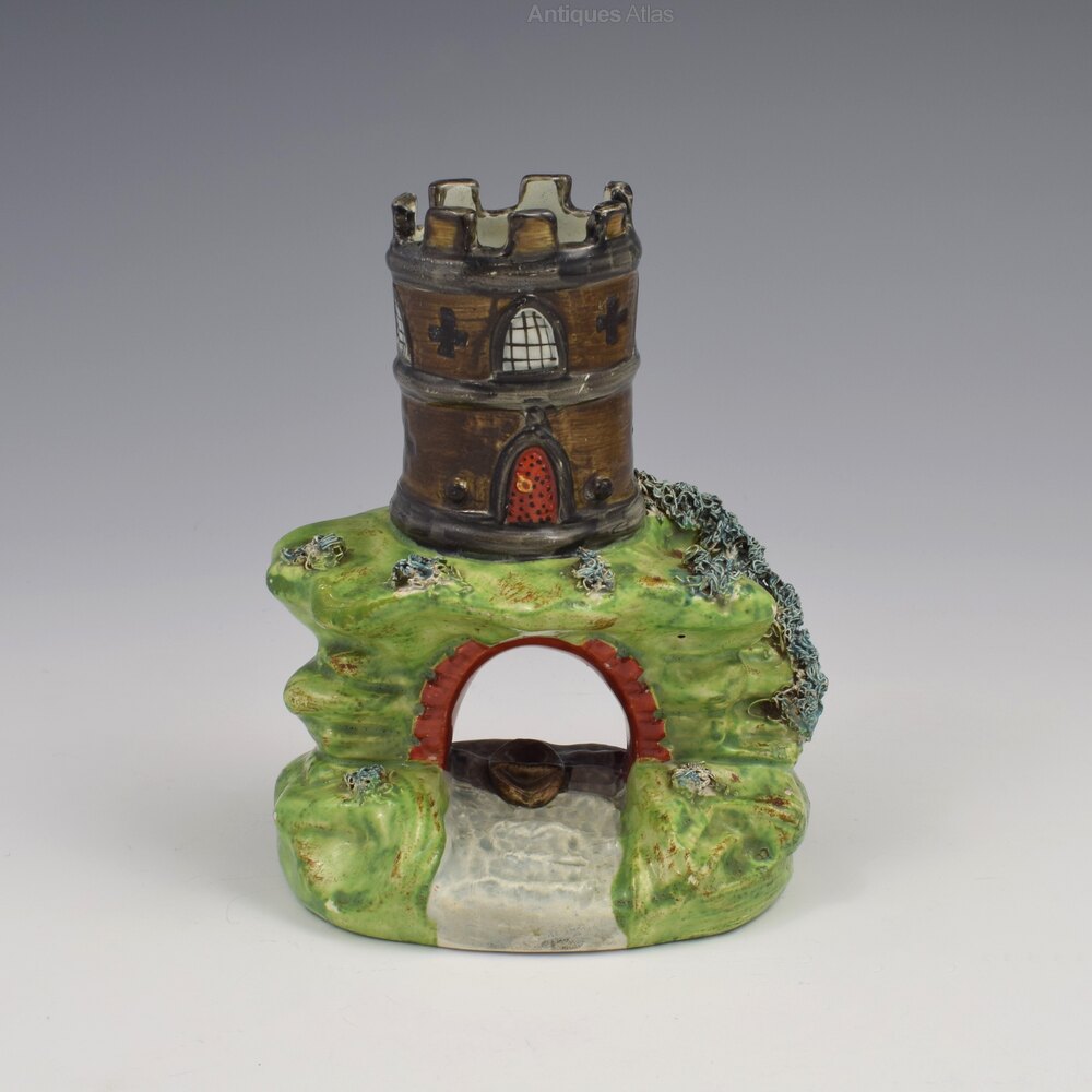 A fun and quirky pearlware Staffordshire pottery spill vase by John Walton, c.1820. Formed as a castle turret set on a large grassy mound atop a red brick bridge. A babbling stream runs underneath with a little rowing boat moored up. Decorated in the round with shredded clay vegetation. The "Walton" banner mark is to the reverse.
