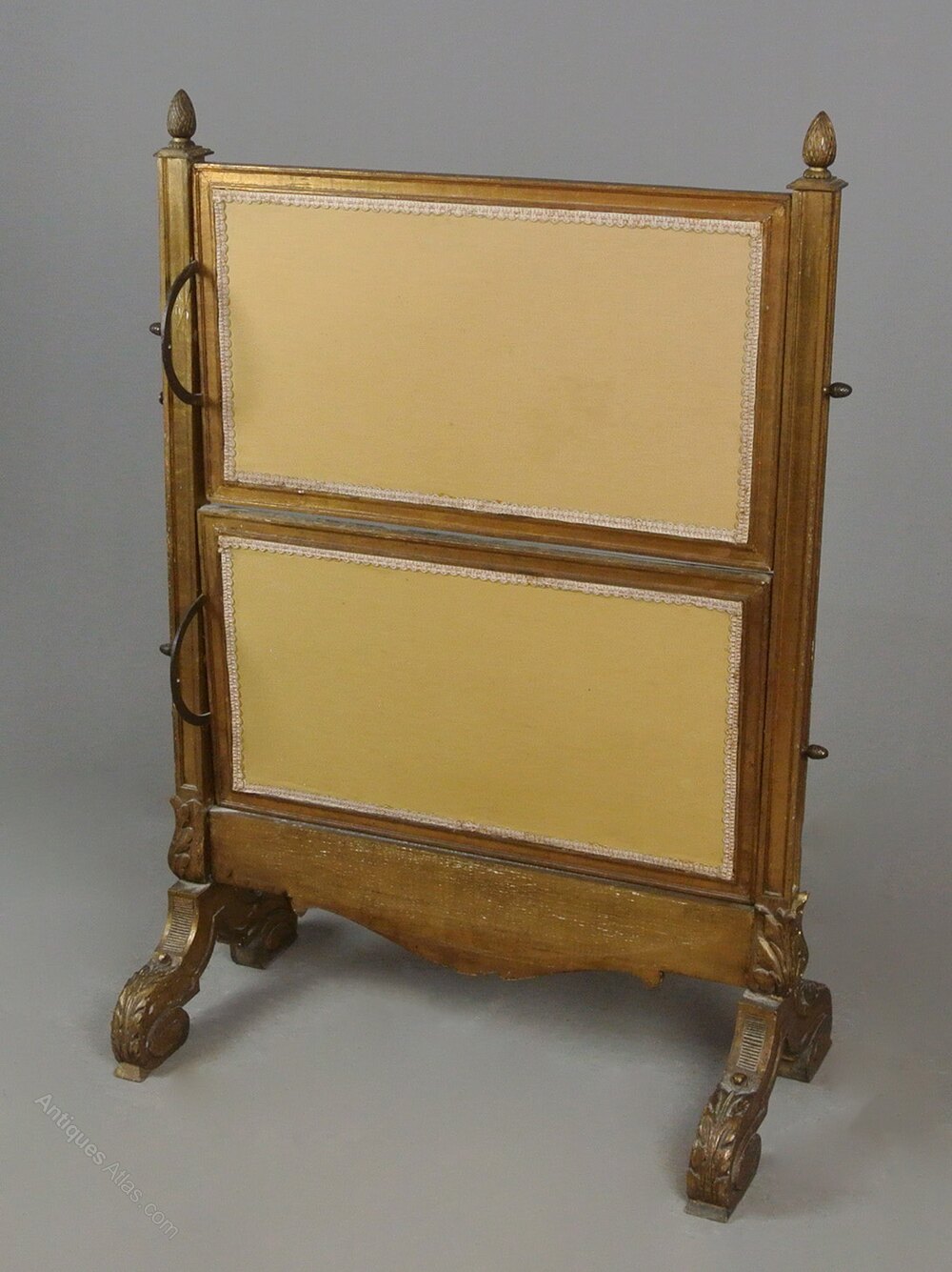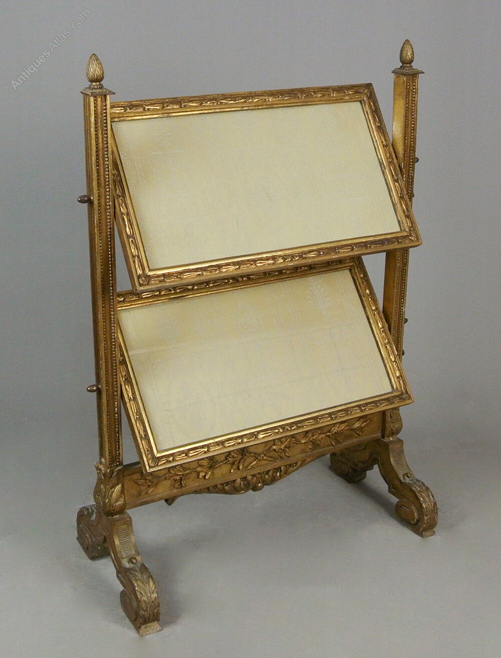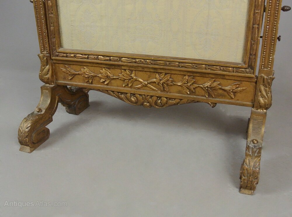 A superb quality original Regency gilt wood fire screen in wonderful condition and retaining twin silk embroidered panels on a pale yellow ground with cream embroidery set behind the original glass. The solid timber frame hand carved with acanthus and running sprigs of laurel with beaded borders and acorn finials. The whole accentuated with gesso and covered in pure gold leaf. Both panels rotate and can be angled independently. The upper acorn finials are mirrored with smaller acorns on the thumb turns which adjust each screen, the feet are finely carved with foliate scrolls.