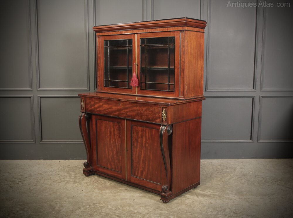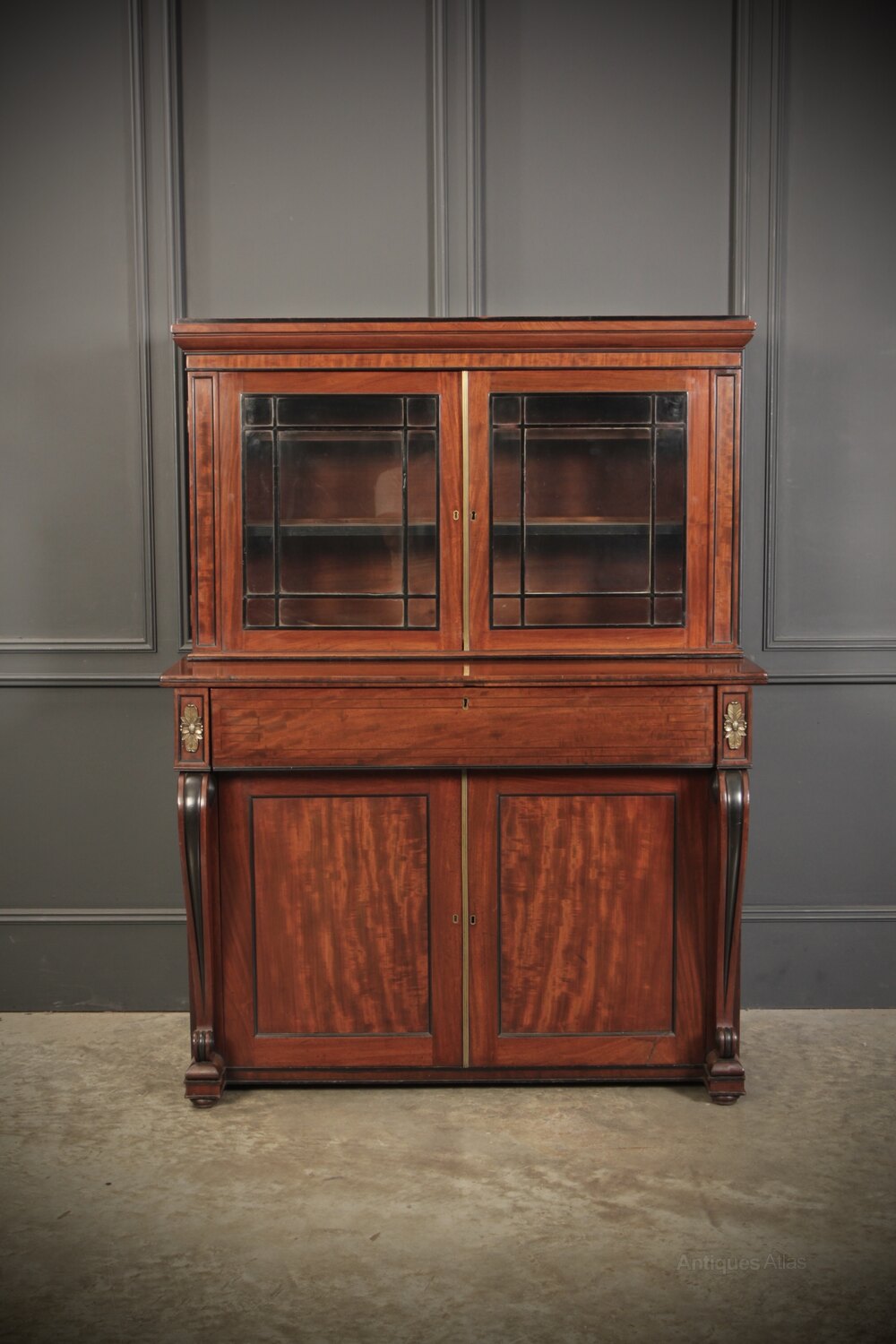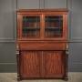 A charming Regency mahogany dwarf bookcase with 2 glazed doors in the top section, with working lock and key and 2 height adjustable shelves inside. Beautiful colour mahogany with brass closing strip.