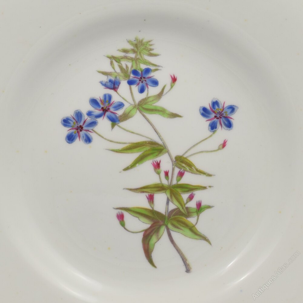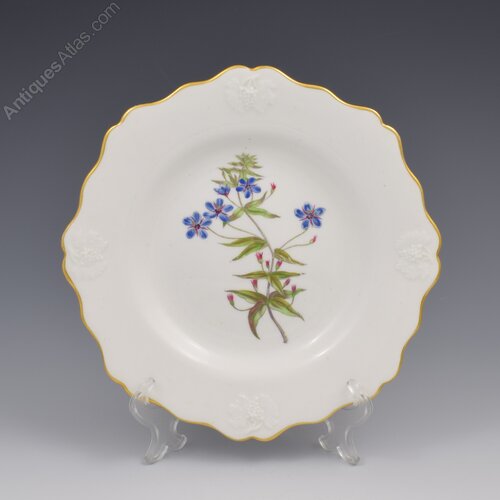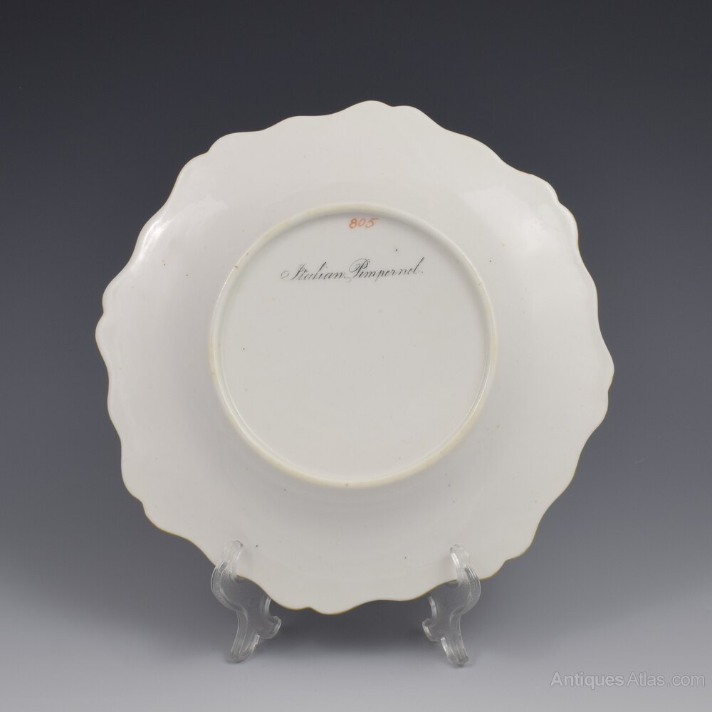 A pretty Georgian dessert plate with shaped gilded rim and relief moulded decoration of grapes and vine leaves around the edge. The centre is decorated with a botanical specimen or an Italian Pimpernel, the delicate outline printed, and then hand painted in enamels over the top. The reverse printed with the specimen name and painted pattern number 805. Ridgway, c.1810.