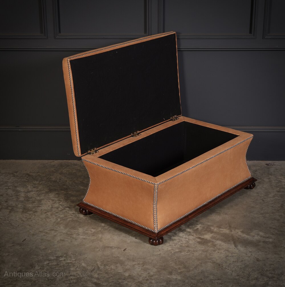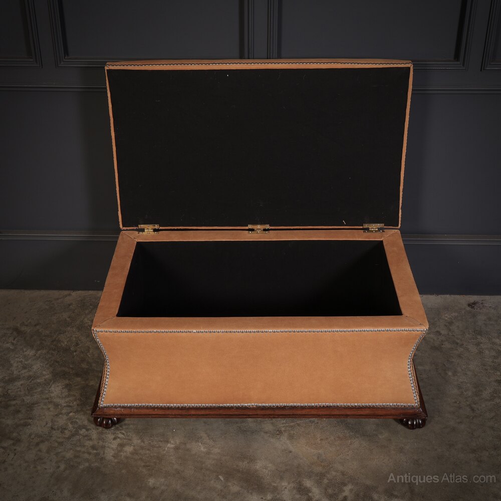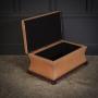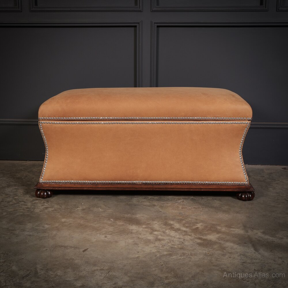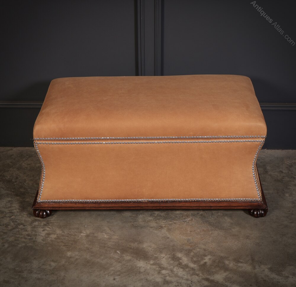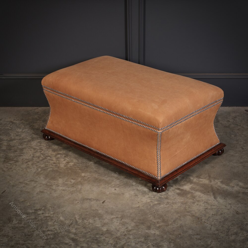 A superb box ottoman professionally upholstered in a high quality genuine nubuck leather, the light tan colour contrasts beautifully with the rosewood frame. Finished with individual chrome studs.