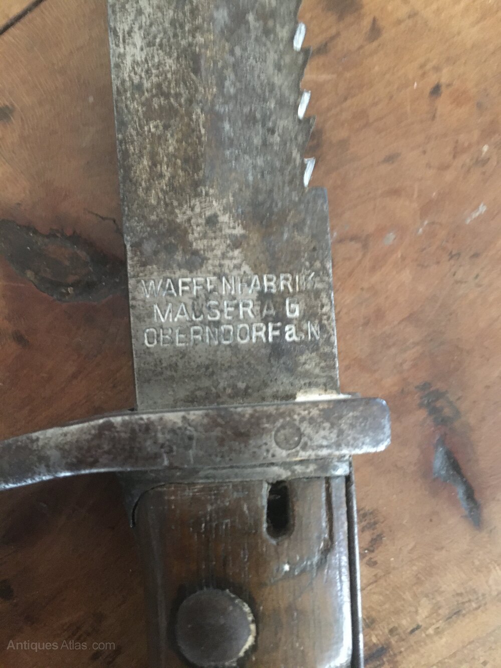 Saw back Mauser butcher as it came to us unrestored ,press stud works fine blade straight saw still sharp no edge nicks well marked. Good example