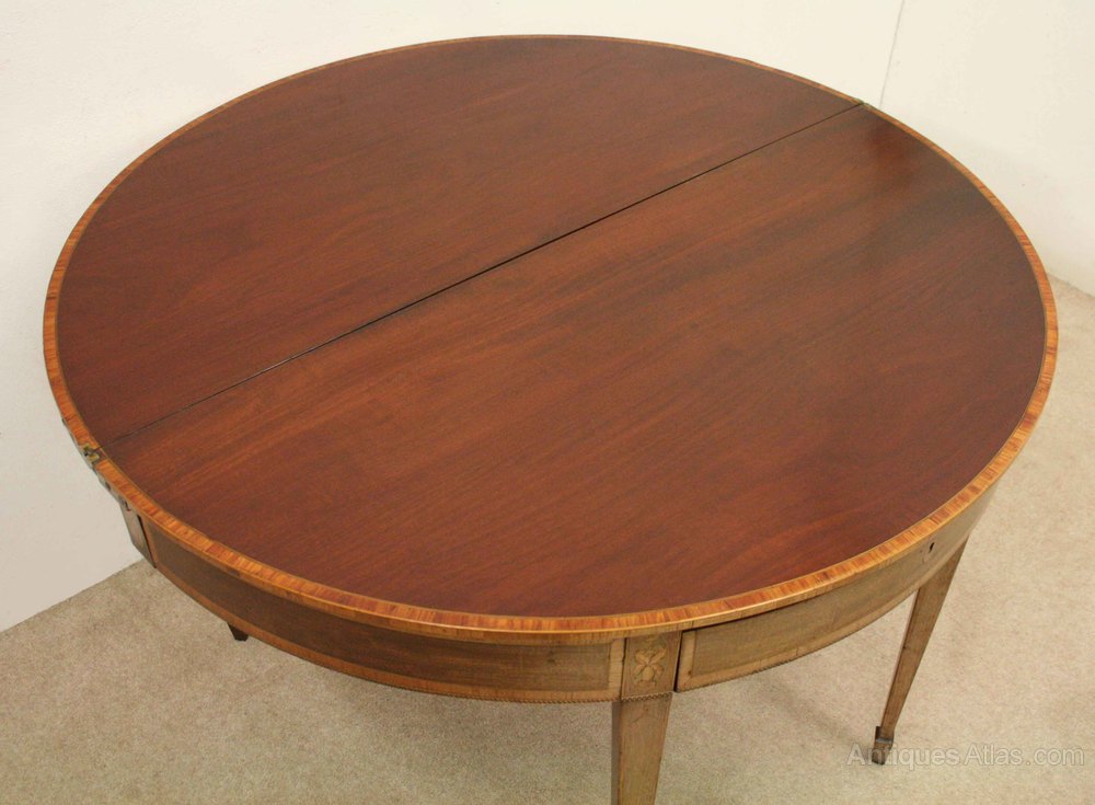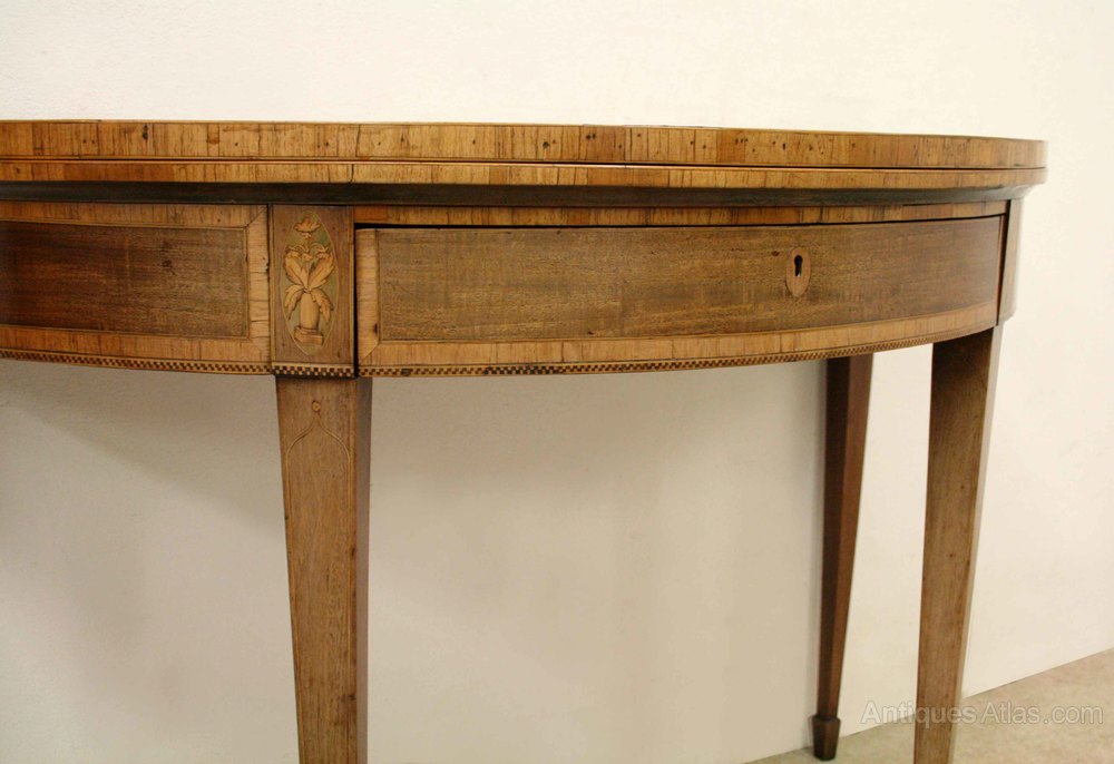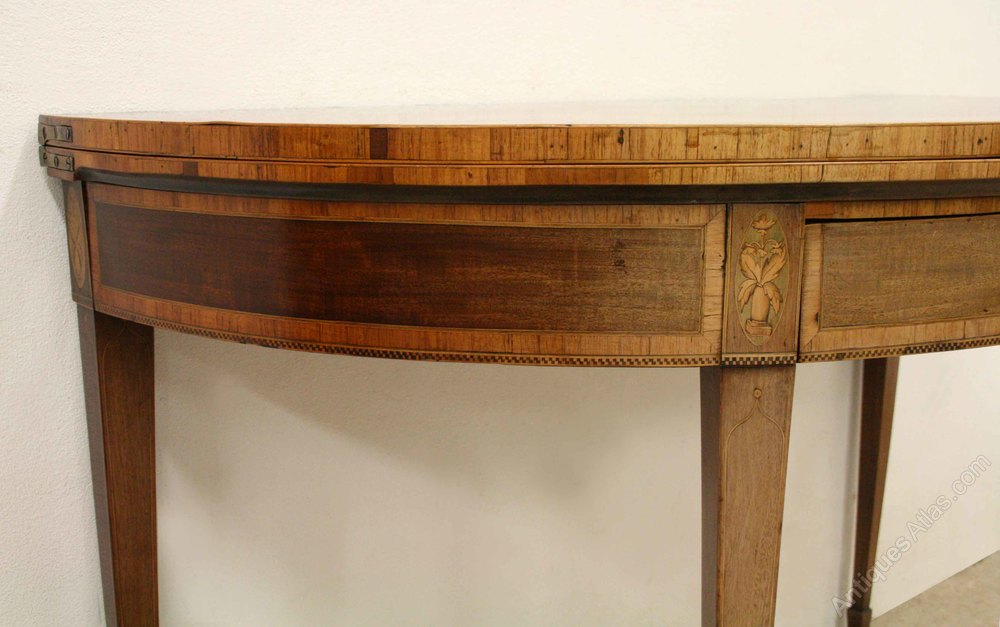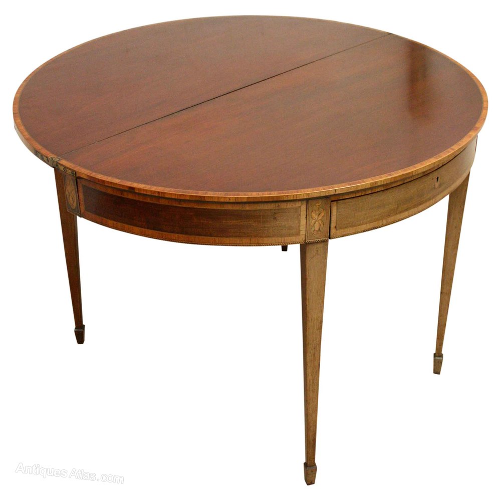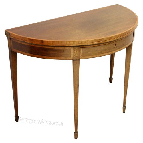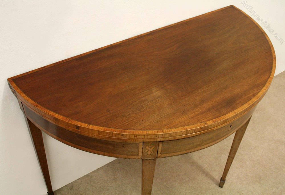 Circa 1790, rare and desirable Scottish George III mahogany fold over tea table. The D shaped table has an inlaid and crossbanded fore edge on top, which continues onto the front. It opens to reveal the interior with wonderful warm colour and similar banding to that of top. Beneath the top is a single drawer incorporated into the apron at the front with a simple flush escutcheon in the form of an oval heraldic shield, and banded with multiples of different styles of inlay. The table stands on four square tapering legs with an inlaid vase at the top and the classic Edinburgh Gothic arch and dot pattern. The front of the table has been bleached out by the sun and retains a warm faded colour. Fine example of Scottish George III antique furniture.