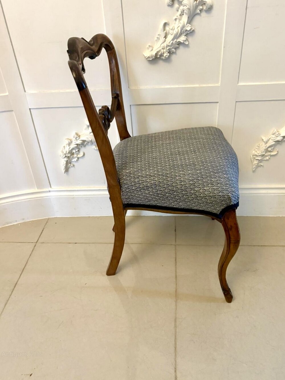 Outstanding quality set of six antique Victorian rosewood dining chairs having fabulous quality rosewood shaped backs with carved centre splats, newly reupholstered serpentine shaped seats in a quality fabric standing on shaped cabriole legs to the front and out swept back legs.