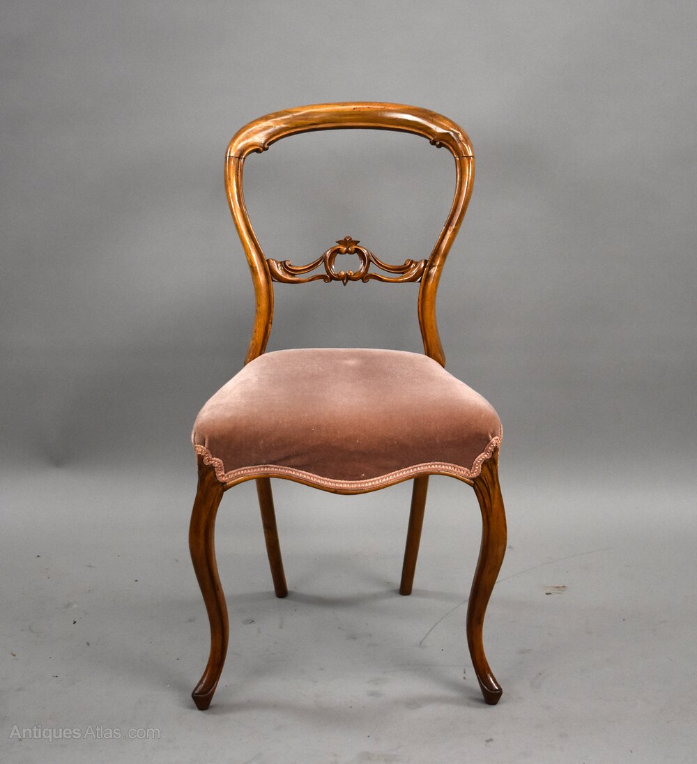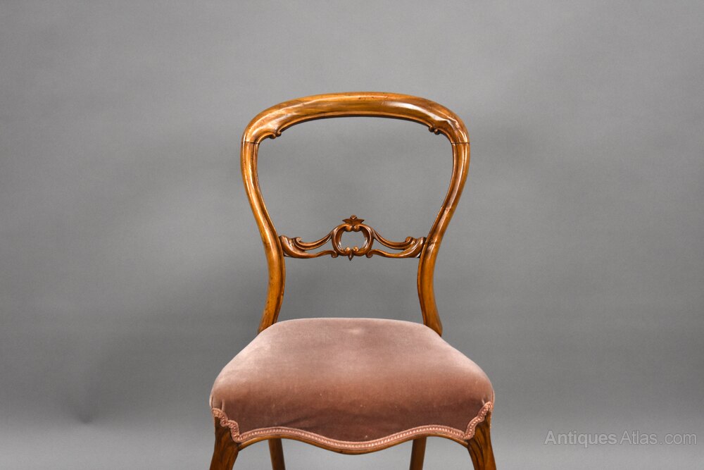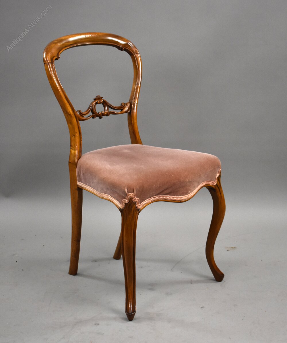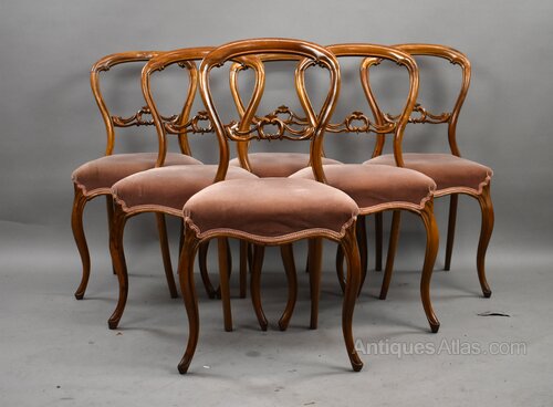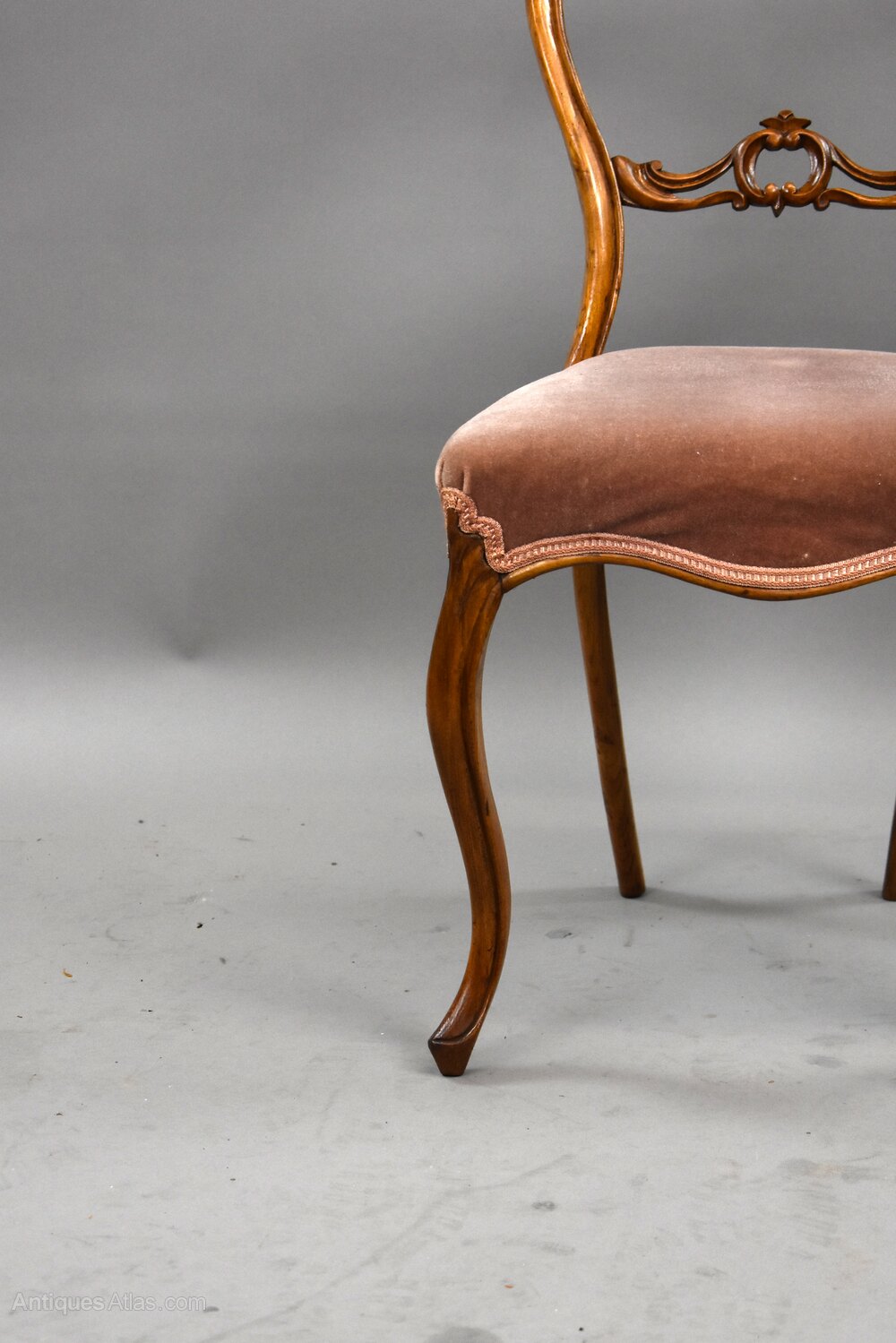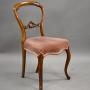 Set of six Victorian dining chairs. Crafted from warm-toned walnut, these chairs feature the classic balloon-back silhouette with delicately carved floral detail to the lower back rail, an elegant hallmark of 19th-century furniture design. The Seats are upholstered in a pink fabric.