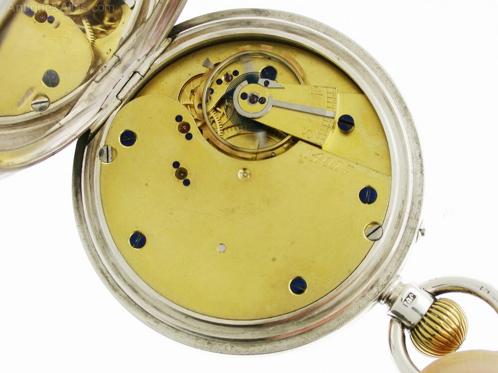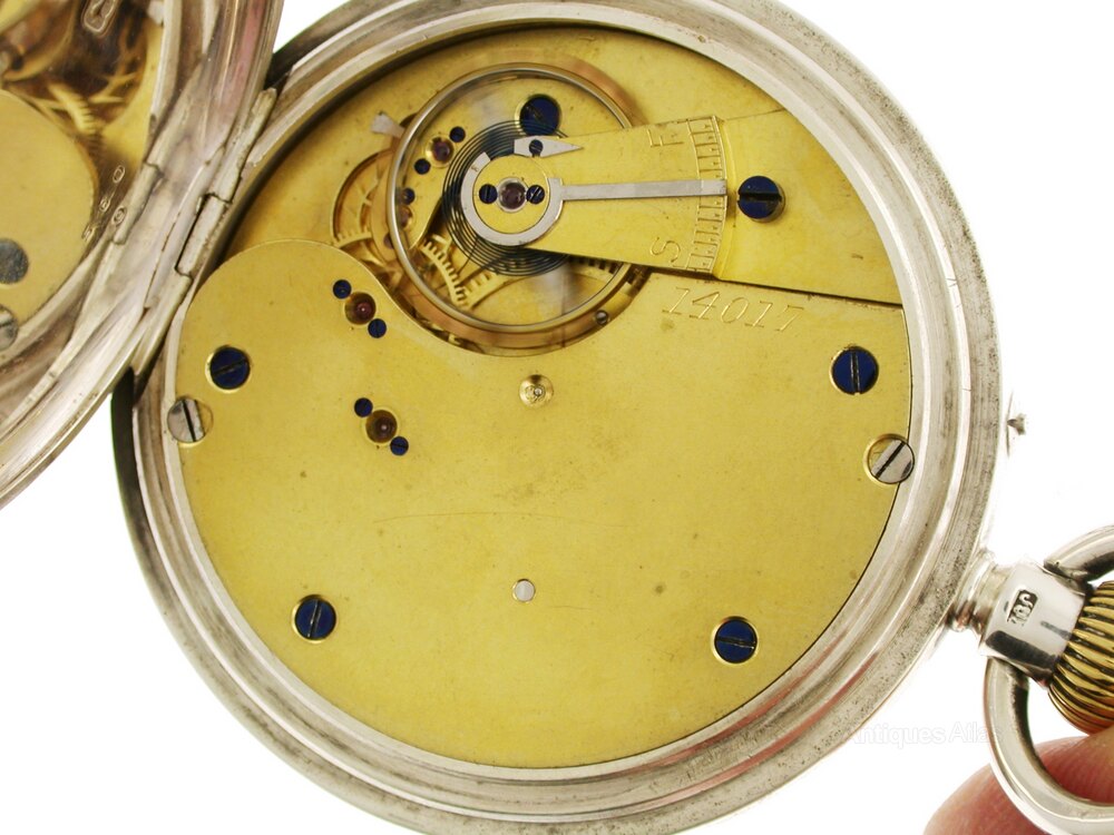 MOVEMENT: The high-grade anchor movement, with a 3/4 plate, has blued screws and works well. However, we cannot guarantee the complete accuracy of any antique pocket watch. The movement is numbered 14015. It is protected by a silver dust cover.