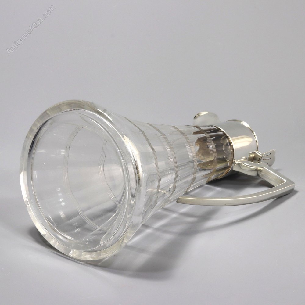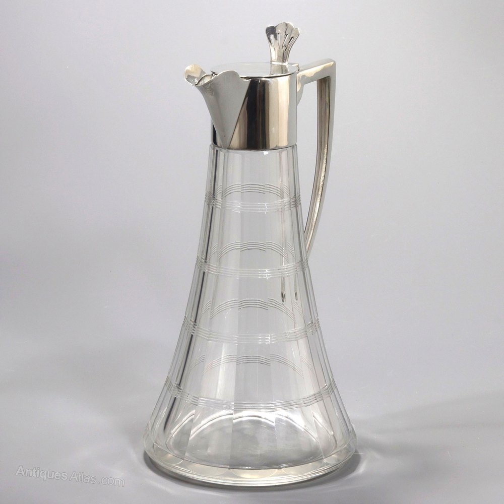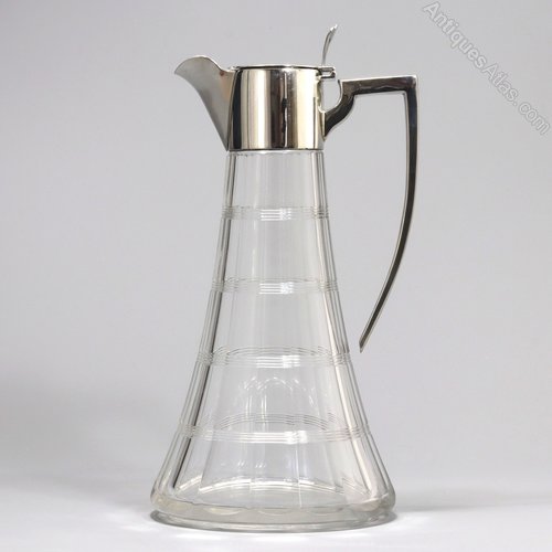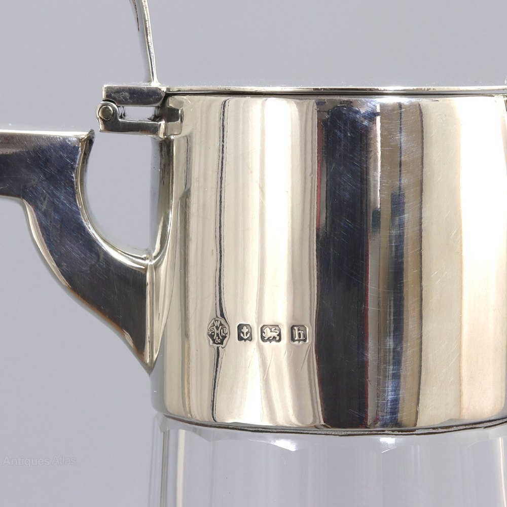 A simply elegant silver mounted and cut lead-crystal claret jug by William Hutton, Birmingham 1907. Attractively shaped silver mount. Hinged lid with shaped thumbpiece. Flared, faceted body with simple cut design encircling the body. Full hallmarks to collar for renown William Sutton & Sons, and partial to lid for the Birmingham 1907. The claret jug measures 24 cm to the top of its lid and 26.5 cm to top of thumb-piece.