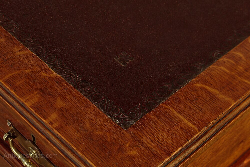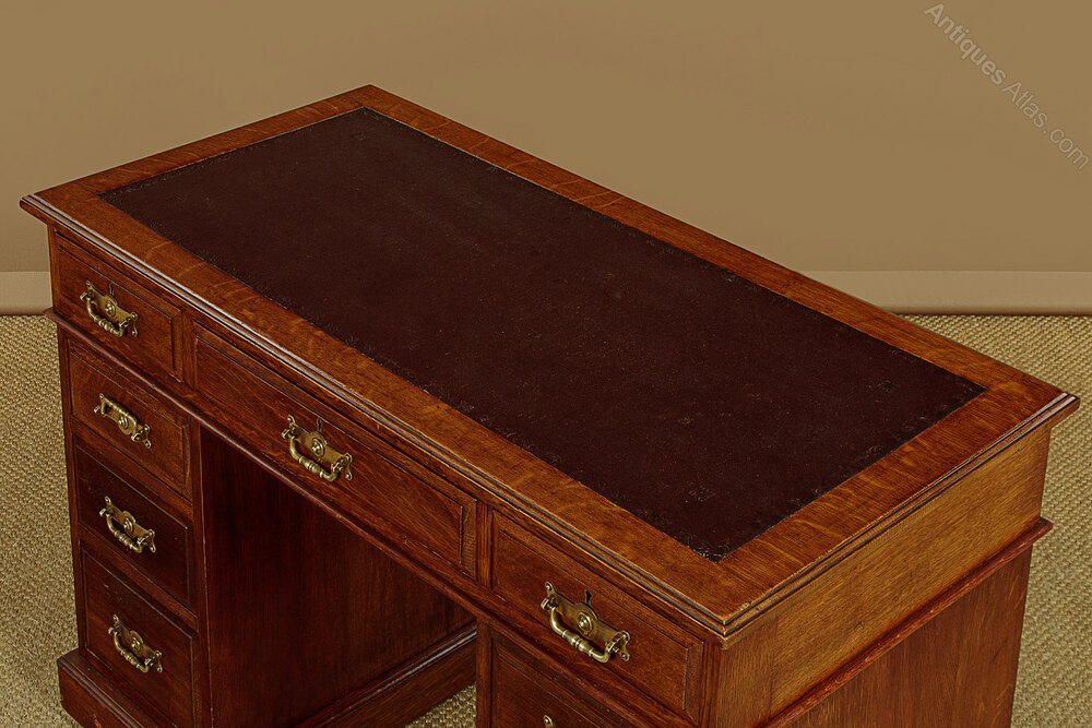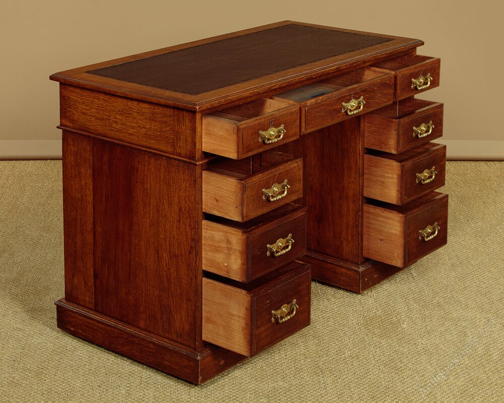 Small late 19th.c. oak pedestal desk c.1890. 42″ x 21″ top with original tooled leather skiver and a moulded edge over three drawers. On twin pedestals, each with three drawers of graduated height, either side of a good sized kneehole (width 17½", height 23½"). Moulded drawer fronts with the original and good quality brass handles. Slim moulded plinth, raised on castors below. Solid oak sides and back, mahogany drawer linings. Very good colour and condition, cleaned and waxed in our workshops. Key supplied.