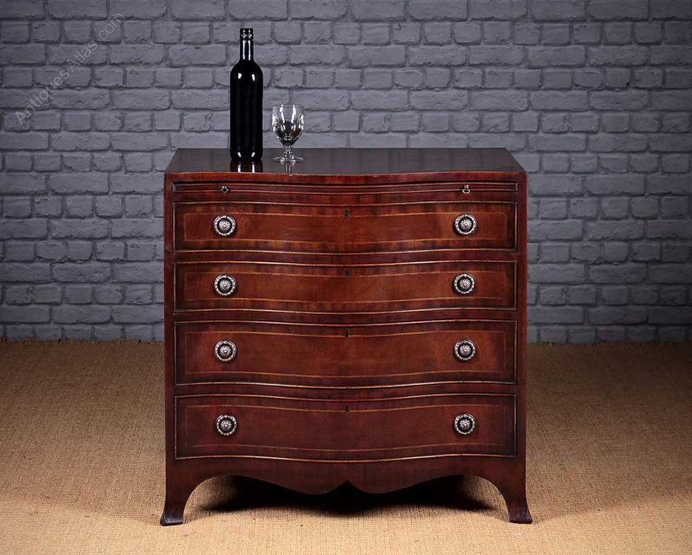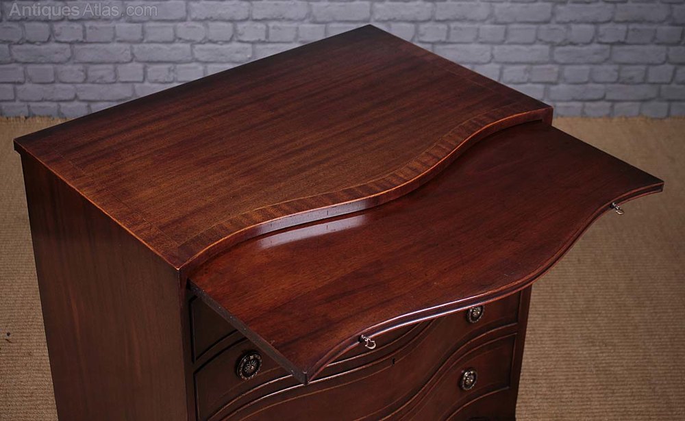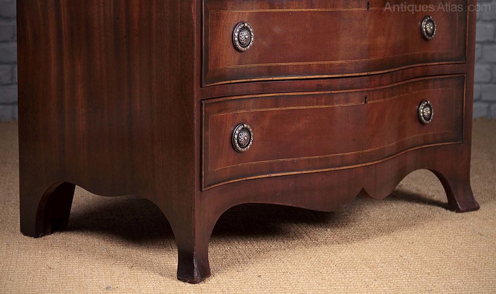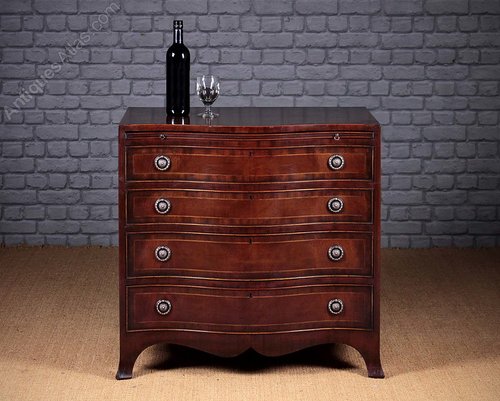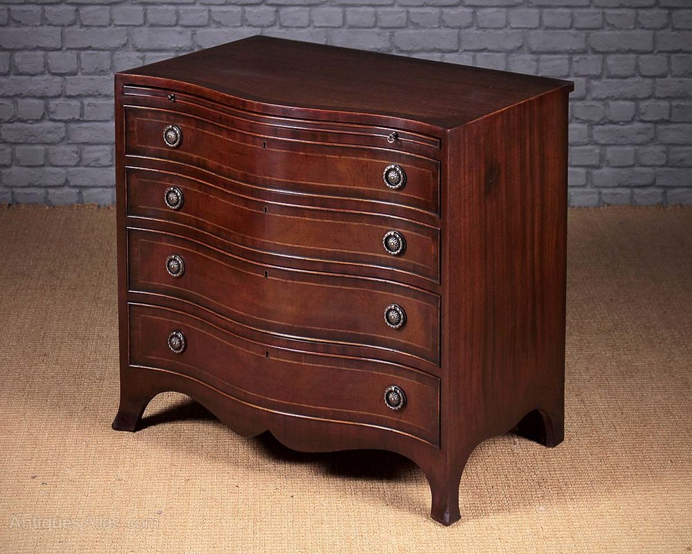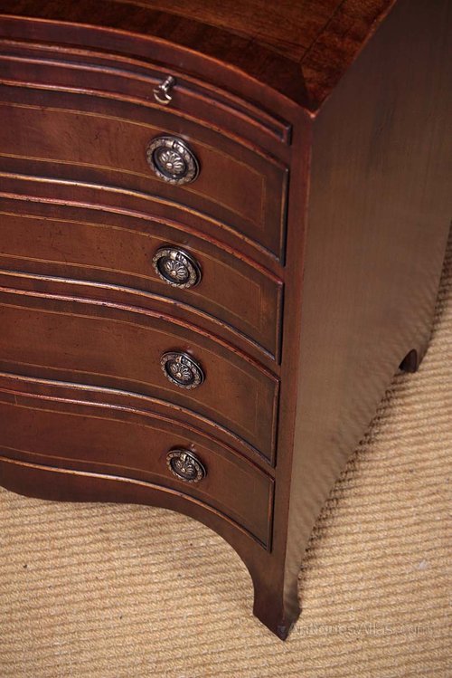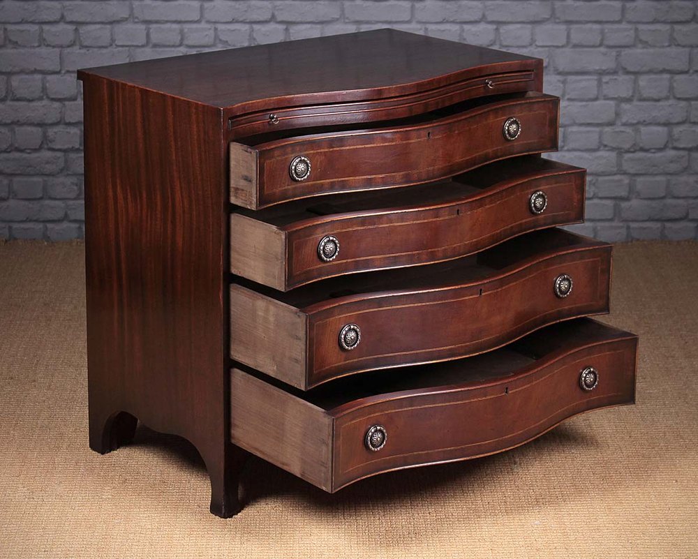 Good looking little Georgian style mahogany chest of drawers c.1960. Just 30″ wide, serpentine fronted, with four drawers of graduated depth plus a brushing slide. Crossbanded top, inlaid drawer fronts, good brass handles and shaped apron and feet. Excellent colour and condition, cleaned and polished in our workshops.
