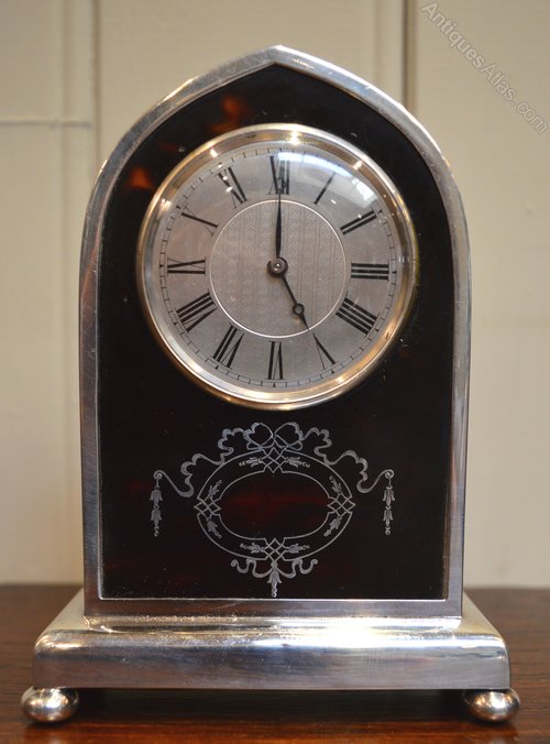 A small silver and tortoiseshell mantel antique clock in a lancet shaped case. It has an inset tortoiseshell panel having fine silver inlaid detail, an engine turned silvered dial with Roman numerals and a Swiss 8 day lever movement. The case is stamped by the makers Goldsmiths and Silversmiths Company and is Hallmarked Birmingham 1923.
