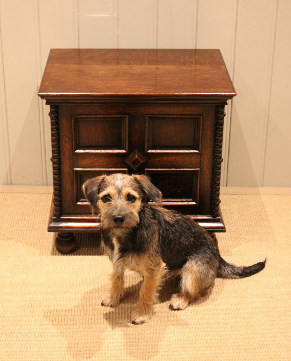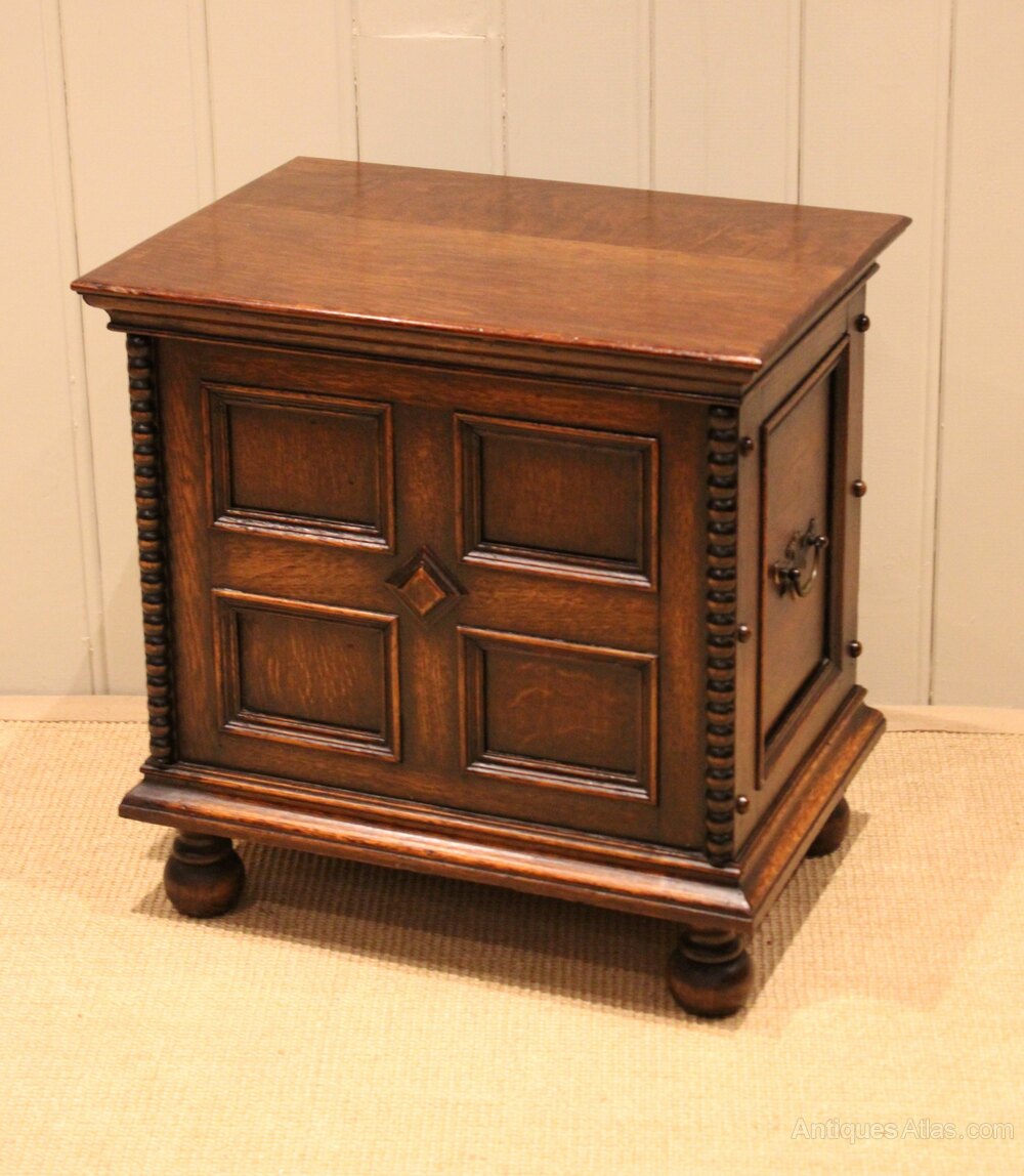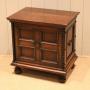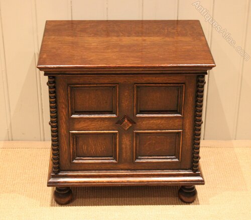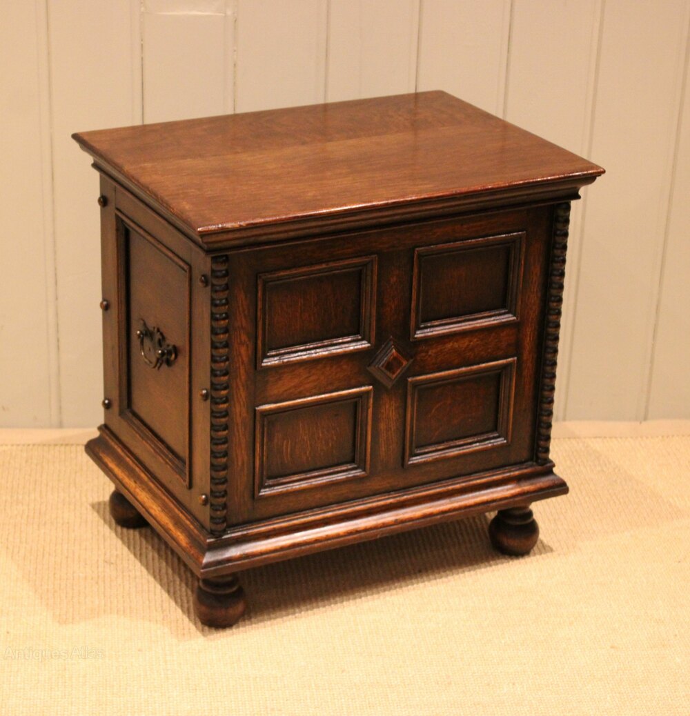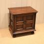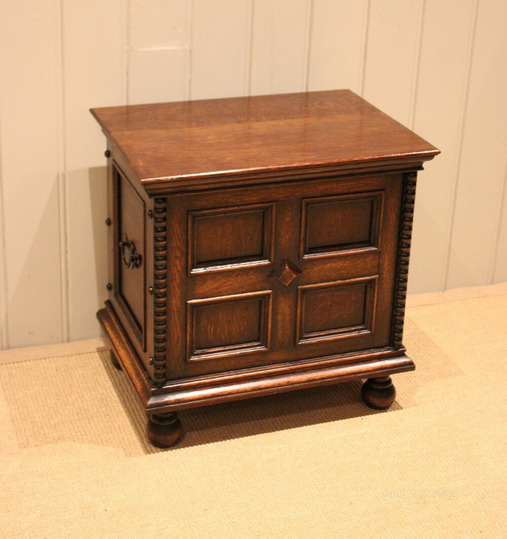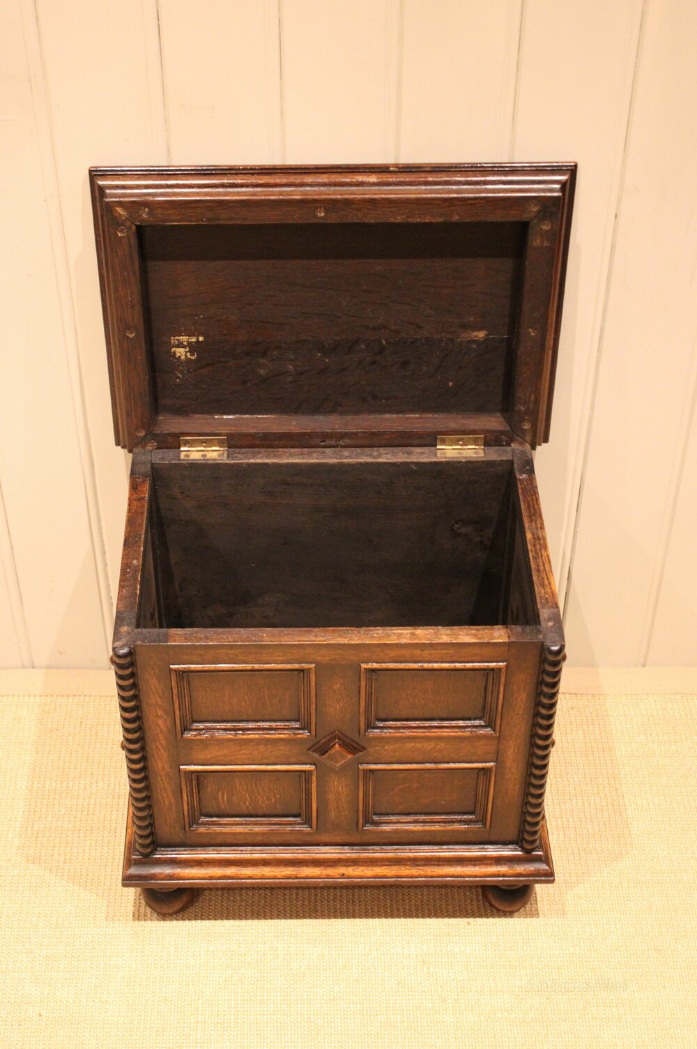 Small oak storage trunk having a panelled front and sides with handles to each side , raised on bun feet .