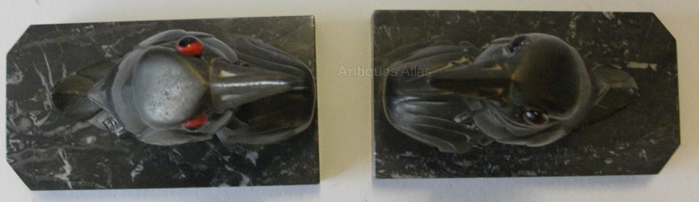 ART DECO 1930’s French patinated pewter Bird bookends on black veined marble bases