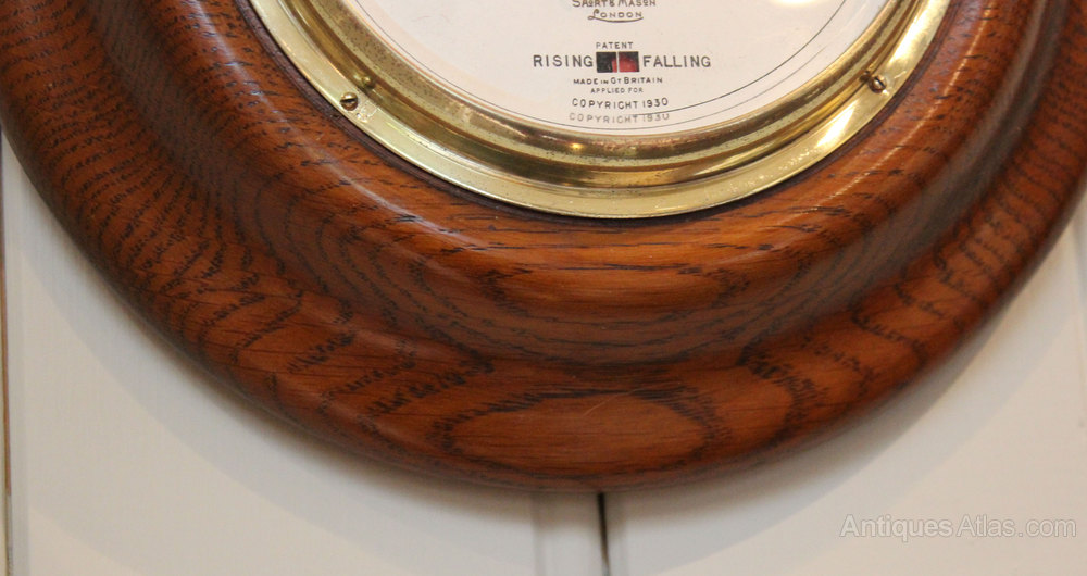 A circular barometer, contained in a turned oak case, made by Short and Mason of London. It has a thick bevel edge glass and an engraved silvered dial with storm guide comments. Below the dial is a patent window device, showing a red flag that denotes if the weather is worsening or improving.