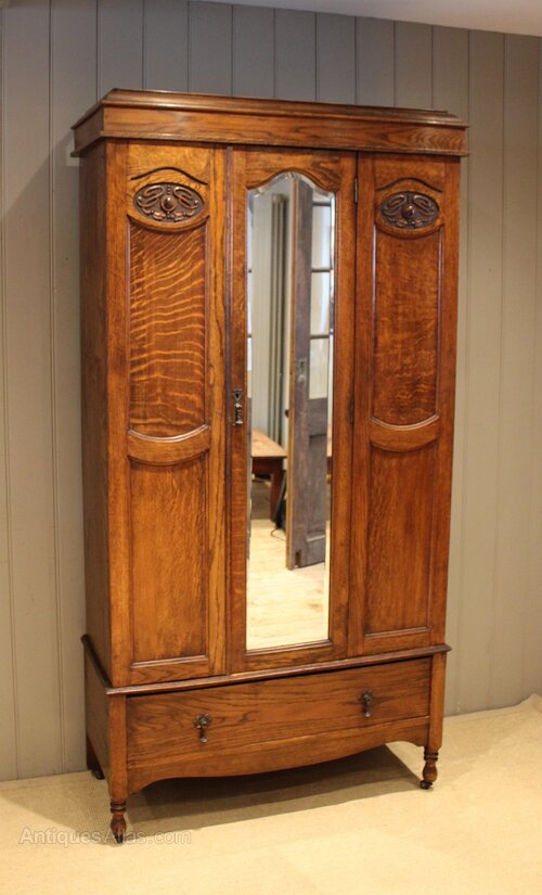 Edwardian solid oak wardrobe with panelled sides , a central door having a bevel edge mirror with carved decoration to either side opening to reveal a central hanging rail and arrangement of hooks .With a single base drawer , raised on tuned short legs terminating in the original castors. The wardrobe dismantles into three pieces for ease of movement . The internal dimensions are 35 cm deep and 130 cm high .