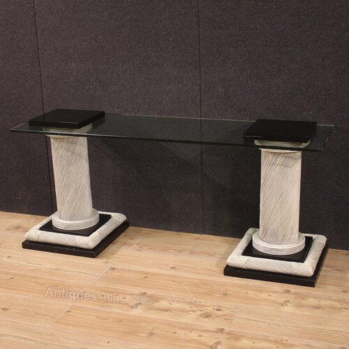 Particular design console, Spain from the 70s/80s. Furniture composed of two columns adorned with wicker with black lacquered wooden elements and glass top. Glass top equipped with special holes to be fixed to the columns (see photo). Console that can be completely disassembled to facilitate its movement and placement in the home. Furniture of interesting construction, for antique dealers, interior decorators and design collectors. Console of fine workmanship and pleasant furnishings, which can be easily placed in different parts of the house. Structurally sound, it has small signs of wear. Overall in good state of conservation.