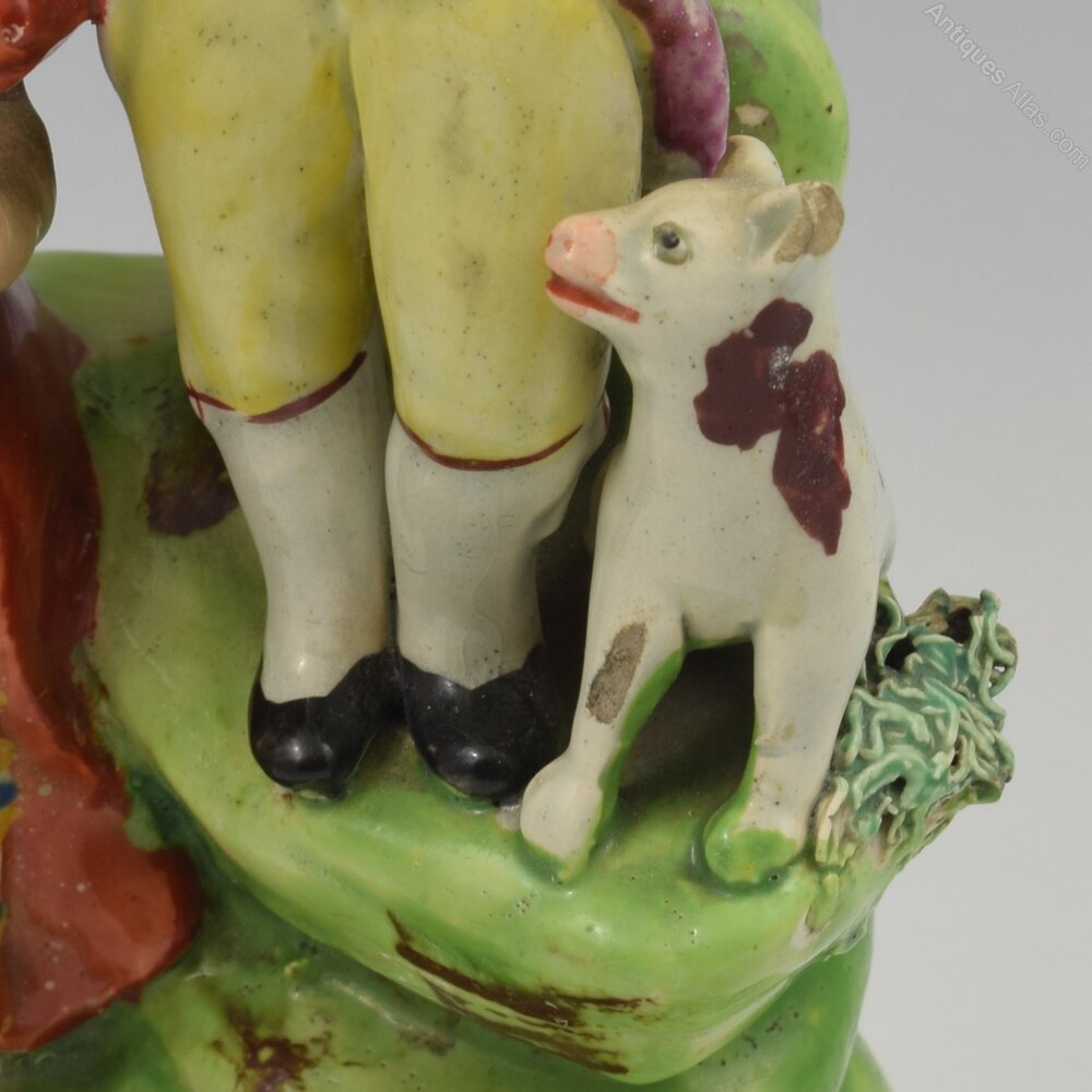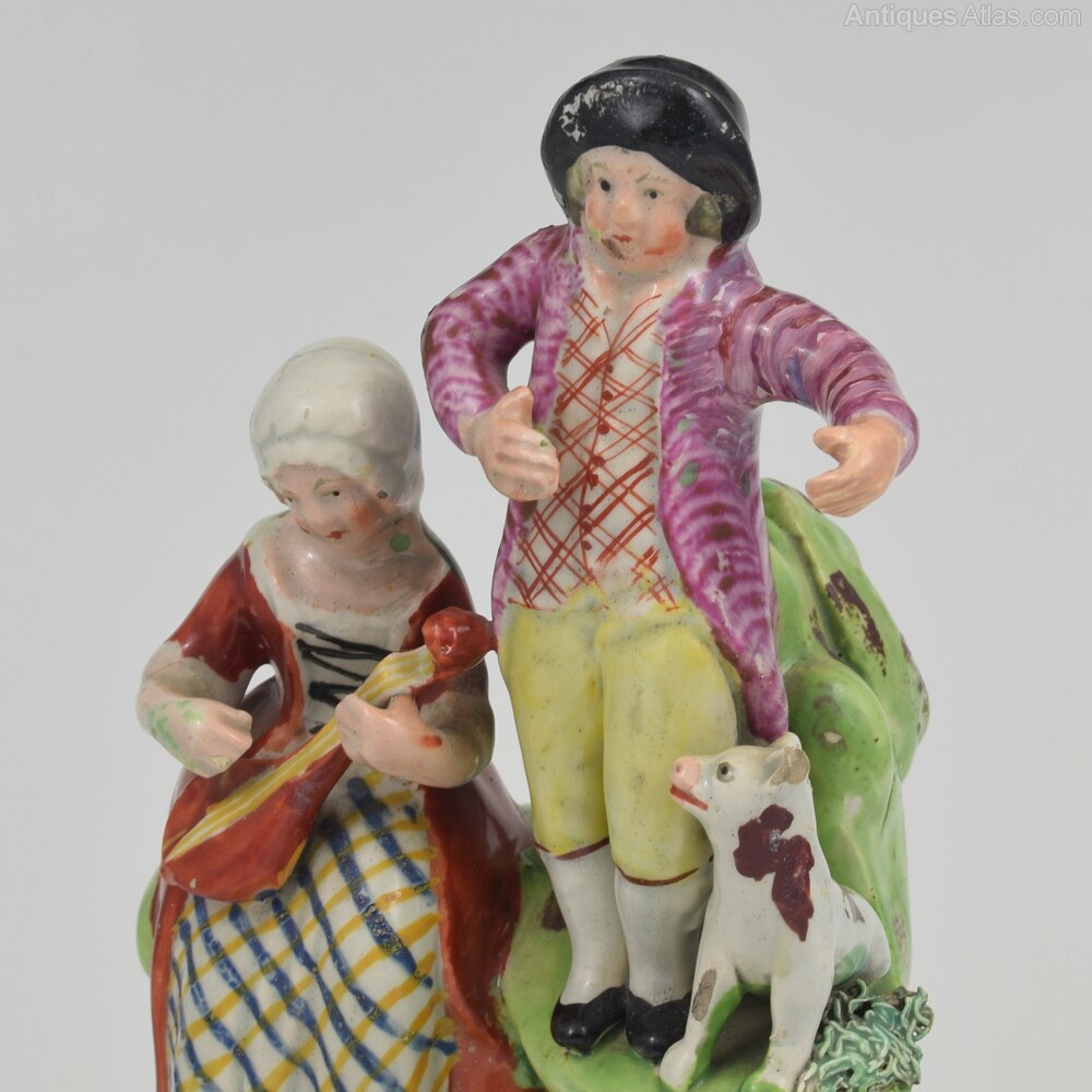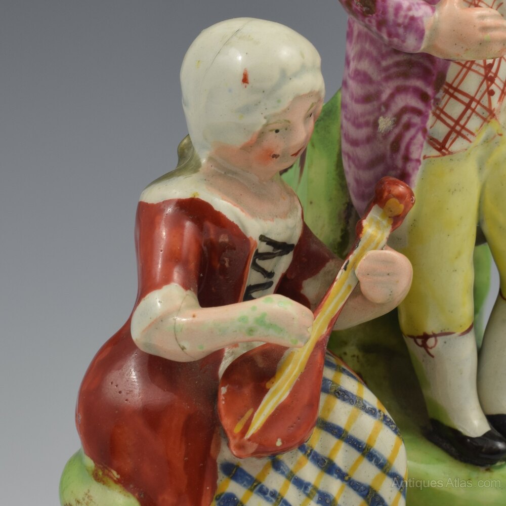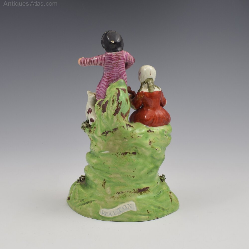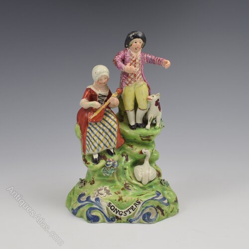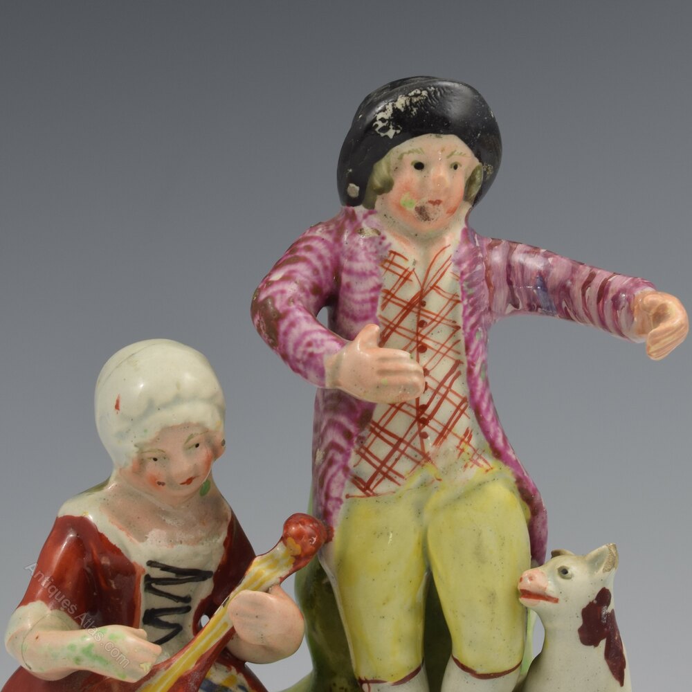 Early 19th century Walton pearlware figure group, the "Songsters" with 2 musicians standing on a grassy mound with a dog by the side of the man and a swan nestled further down. the lady plays a guitar and the man would have had a horn but this has been lost and his left arm restored in association with that loss. Named with the title to the base at the front amongst blue scrolls and with the "Walton" scroll on the back. Decorated in the round in bright enamels.