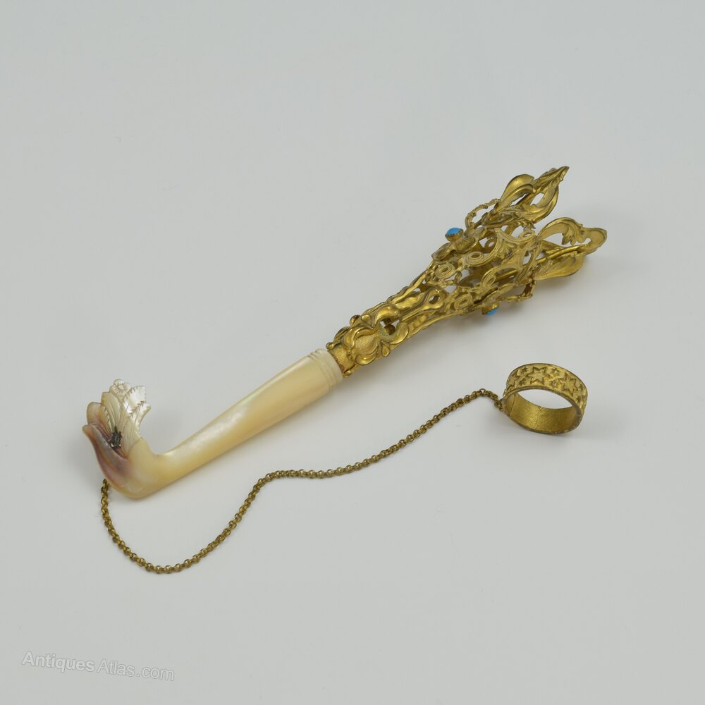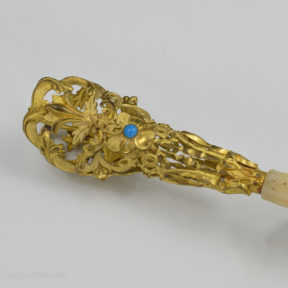 A stunning mid-19th century French tussie mussie with a highly intricate gilt metal posy holder with delicate, shaped, embossed and chased scrolling leaves, stylised flowers and fine pierced detailing and filigree wirework. In the centre of each side is a formed pansy flower, each set with a brilliant blue turquoise as the heart. The handle is mother of pearl with a hooked end, superbly carved on both sides with a flower rising from a clump of leaves and carved reeded bands just below the join with the ormolu. Pinned through the end is a delicate gilt metal chain ending with a small finger ring with striking raised star pattern. c.1860.