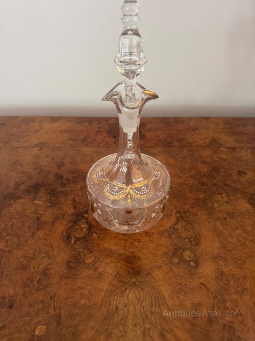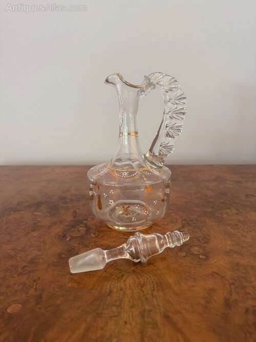 Stunning quality antique Victorian ewer, having a stunning quality antique Victorian ewer with a shaped crimped handle to the back, a slender neck with gold banding and the original stopper with '3' to the base, a bulbous shaped body decorated with hand painted floral decoration with hand enamelled daisy sprigs with raised white jewel dots and gilded garlands.