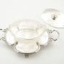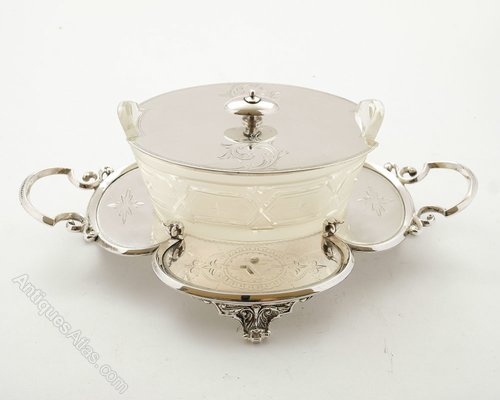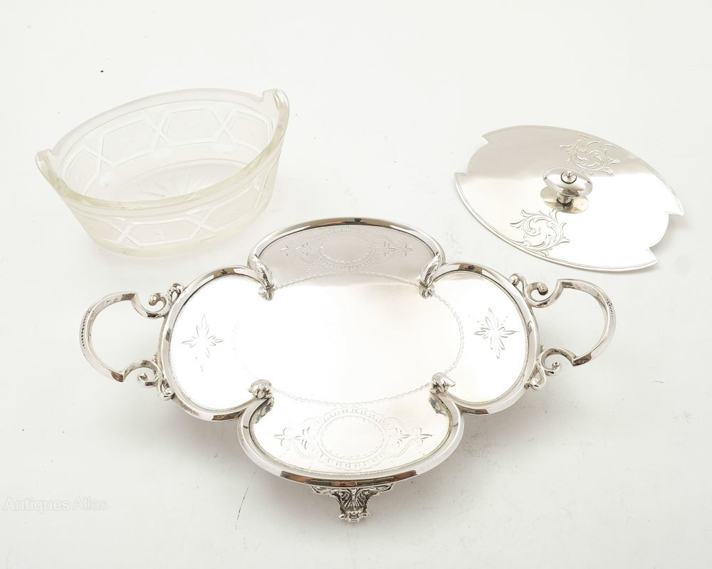 A Stunning Victorian Butter Dish comprising oval shaped frosted cut glass liner and silver plated lid. Sits on decorative two handled base with four scroll feet - circa 1880