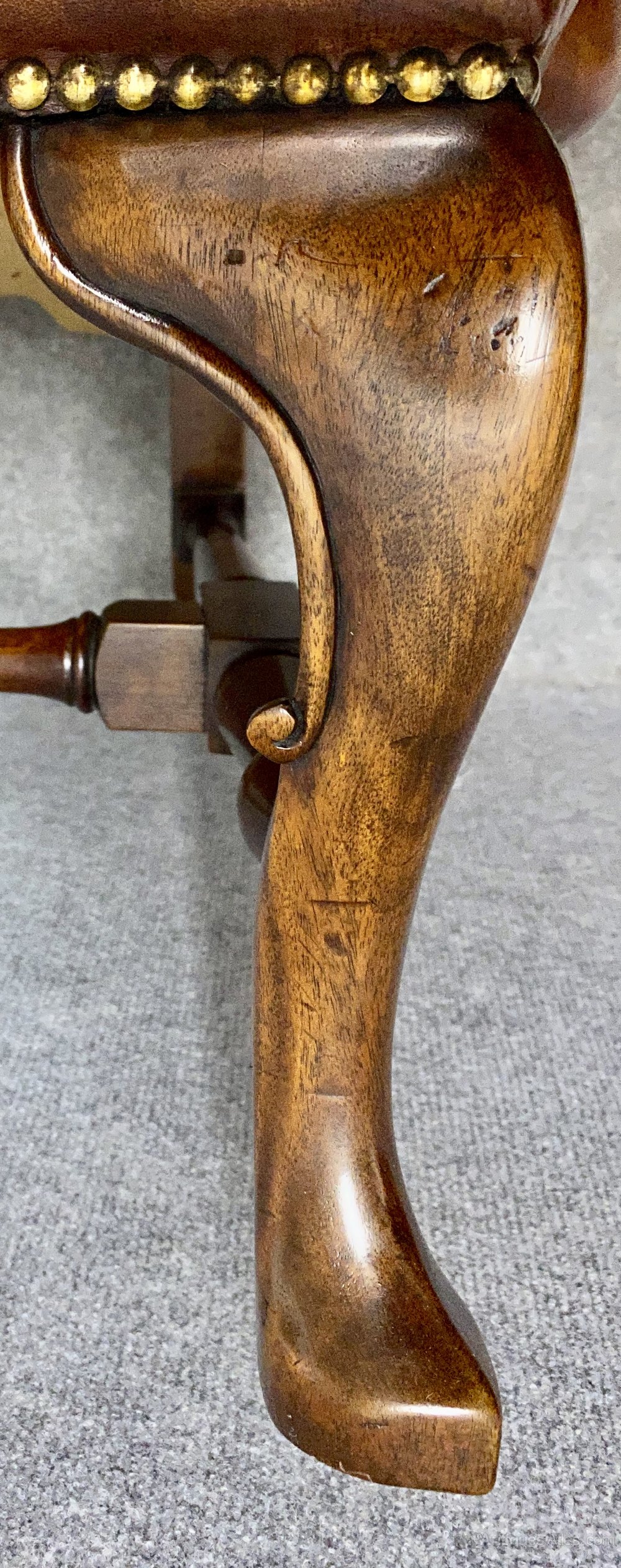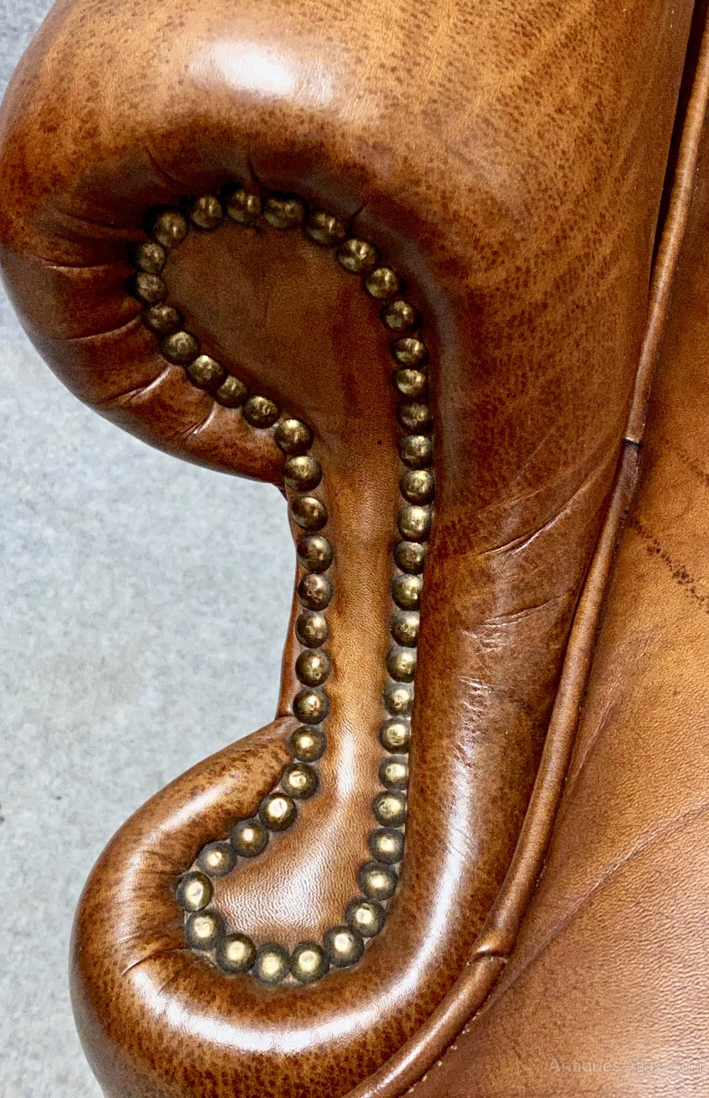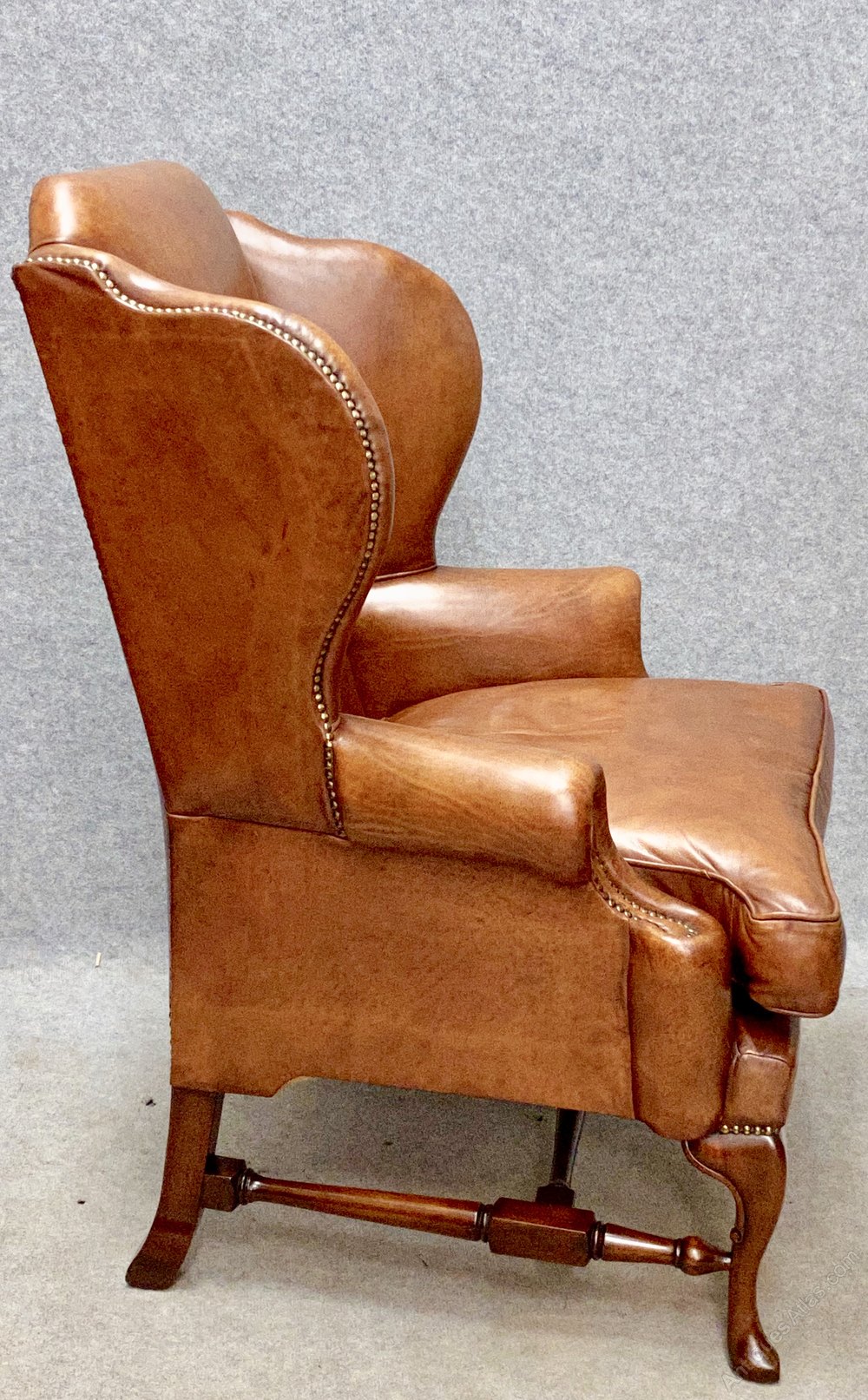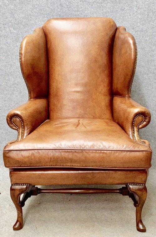 A superior quality George I style winged armchair. The chair retains the original good quality hand dyed leather upholstery with lose cushion and brass studded detail. This fabulous chair stands on short front cabriole legs with subtle carved detail and pointed toes with turned strengthening cross stretchers and outswept back legs. Condition very good, fully cleaned and waxed in our own workshops. Dimensions:- Height…46.5''/ 118cm. Width...34''/ 86.5cm. Depth...32''/ 81.5cm. Seat Height…19''/ 48.5cm. Delivery to most of U.K. mainland £55.