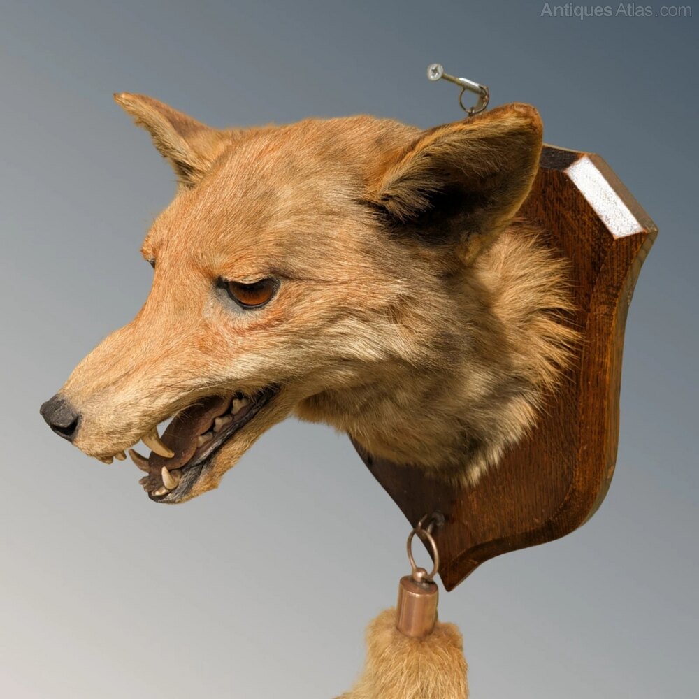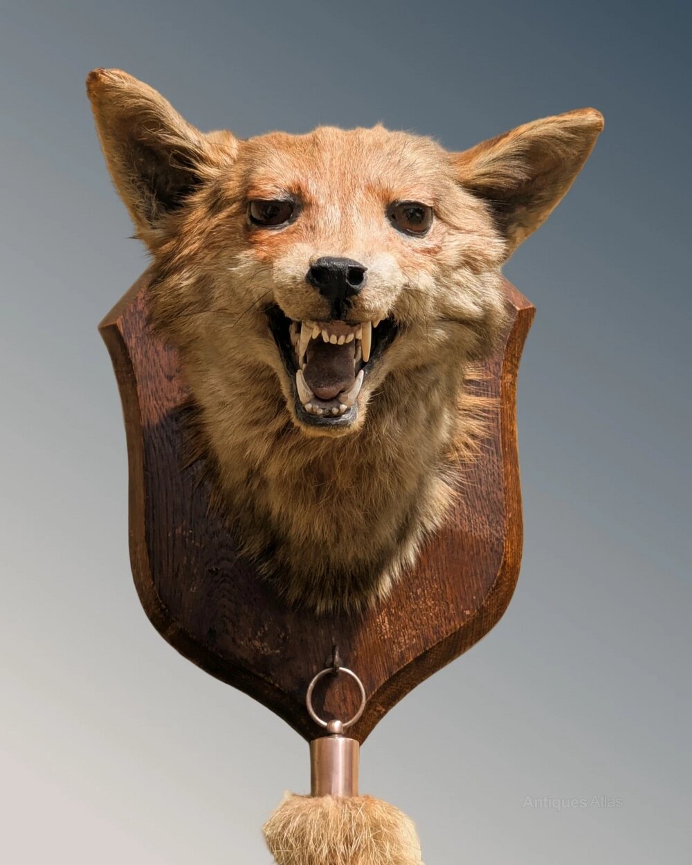 An early 20th century taxidermy fox mask by renowned taxidermists E. F. Spicer 58 Suffolk Street Birmingham. This is an adult fox mask looking straight ahead, mouth agape, with piercing glass eyes. It has the original prepared brush with brass mount and the fox is mounted upon a typical solid oak shield, taxidermist's partial trade label to verso.