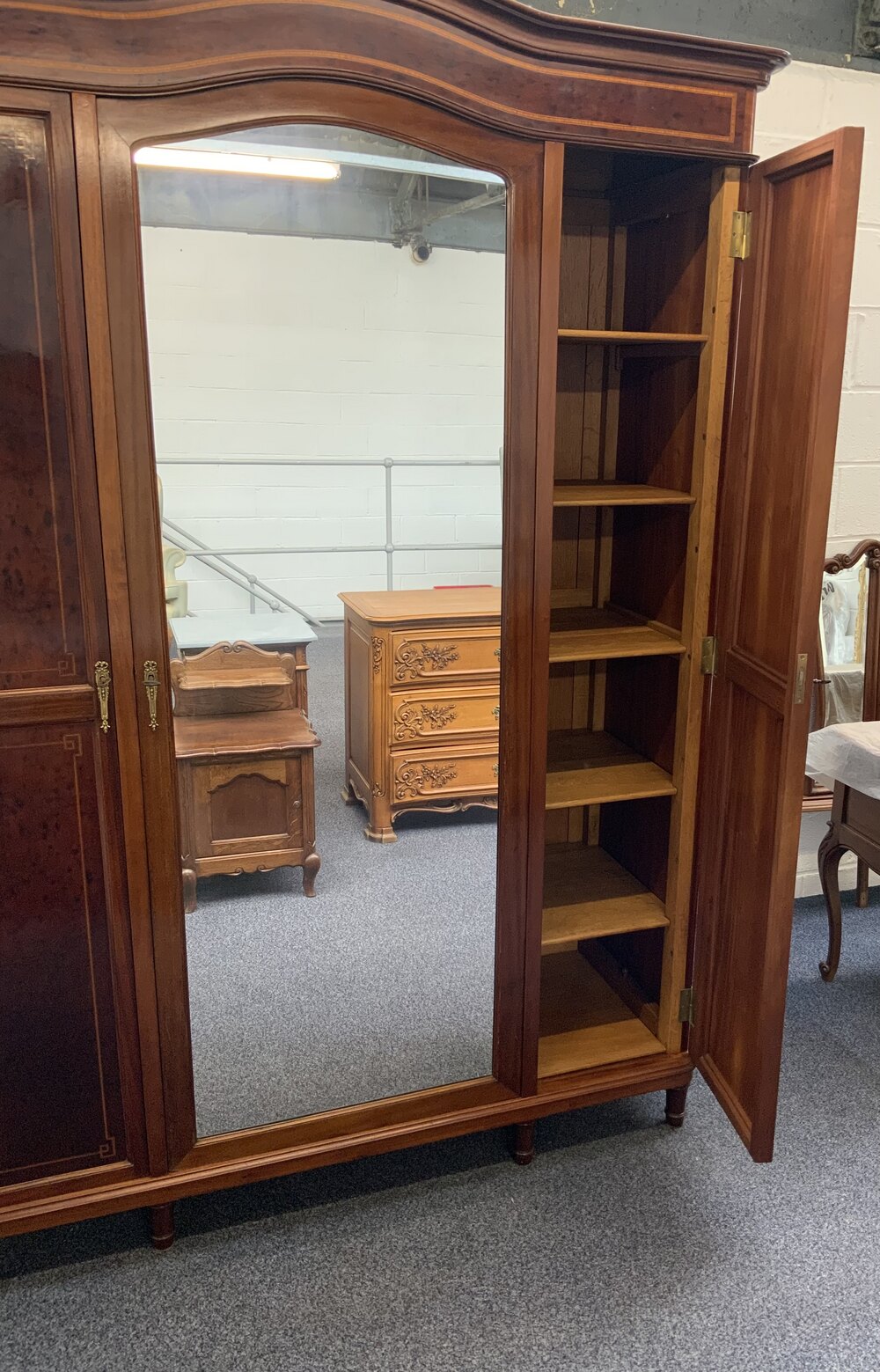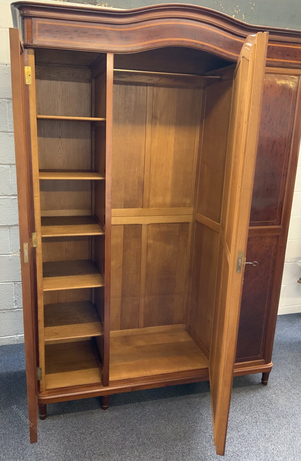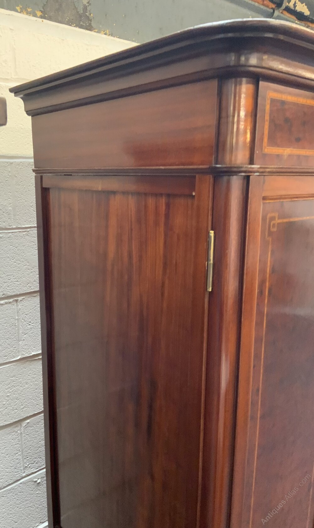 The armoire stands on turned mahogany legs and has an inlaid swept canopy.