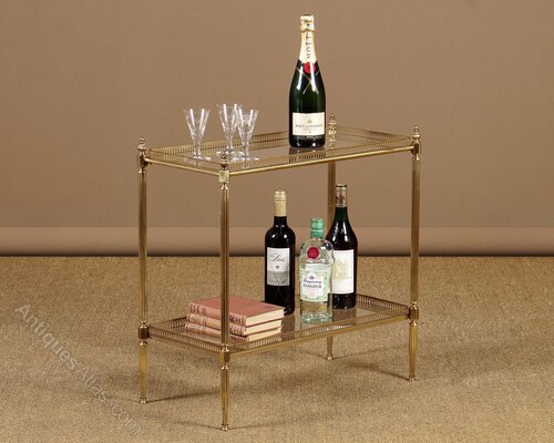 Smart little brass and glass two tier side table c.1960. Two 11" x 23" glass shelves, each with a pierced brass gallery around the edge. On a brass frame with fluted column uprights with shaped finials, tapering legs and turned feet. The upper shelf lifts off the frame to be used as a separate tray. Excellent condition.