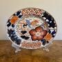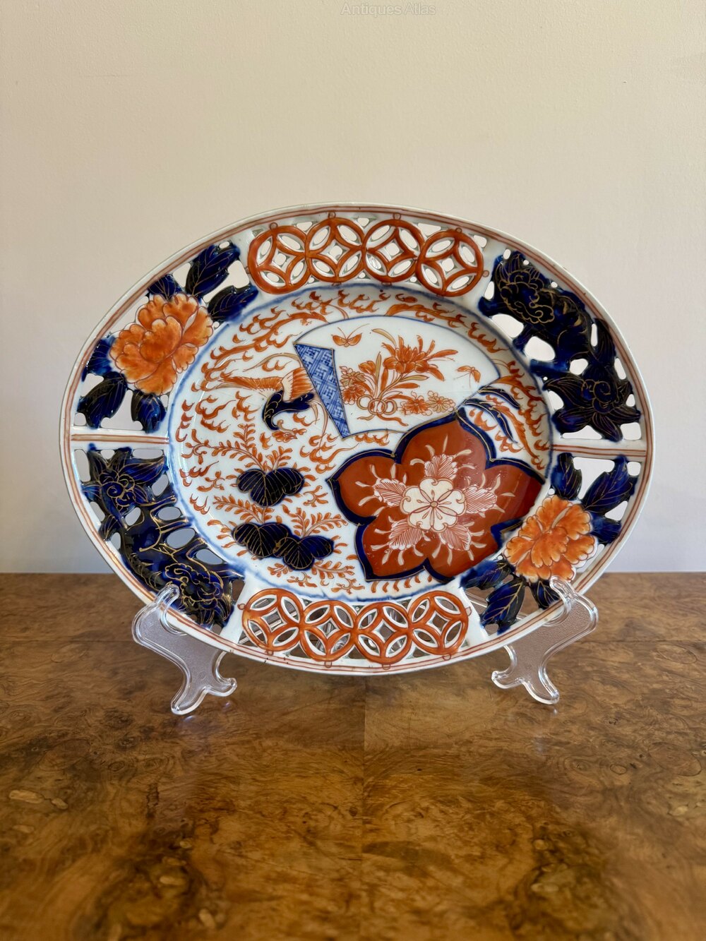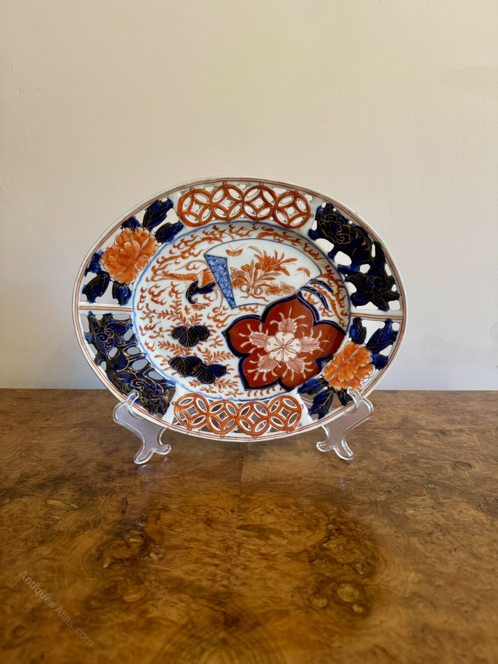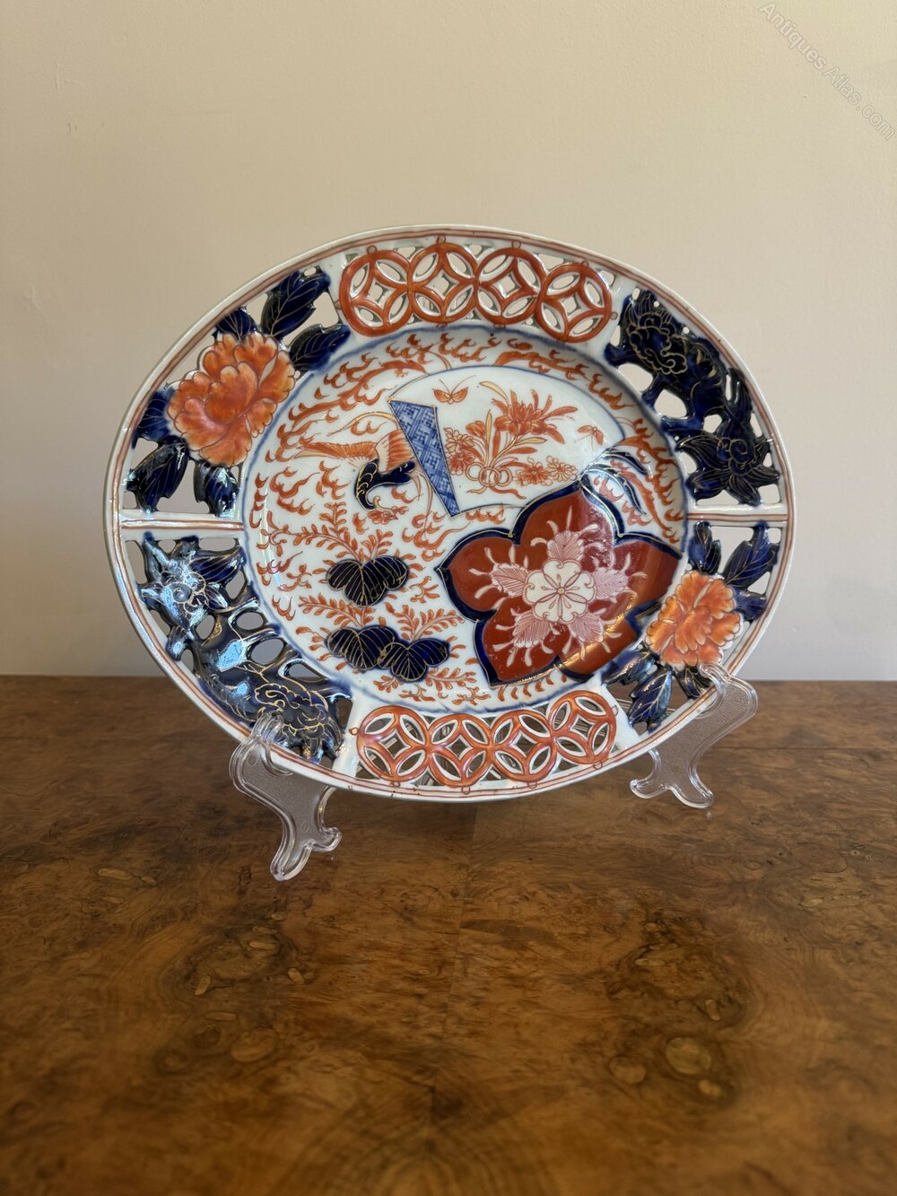 Unusual quality antique Japanese imari oval plate, having an unusual quality antique Japanese imari plate with a pierced border, decorated with flowers, leaves, a bird hand painted in fantastic red, blue, gold and white colours.