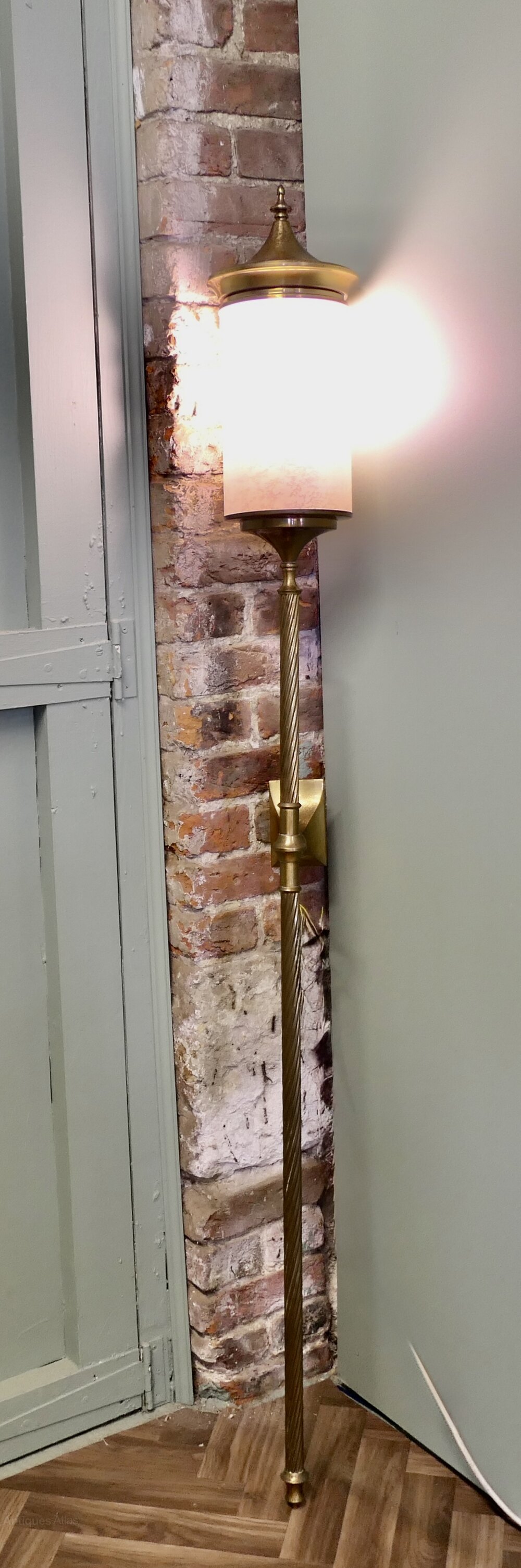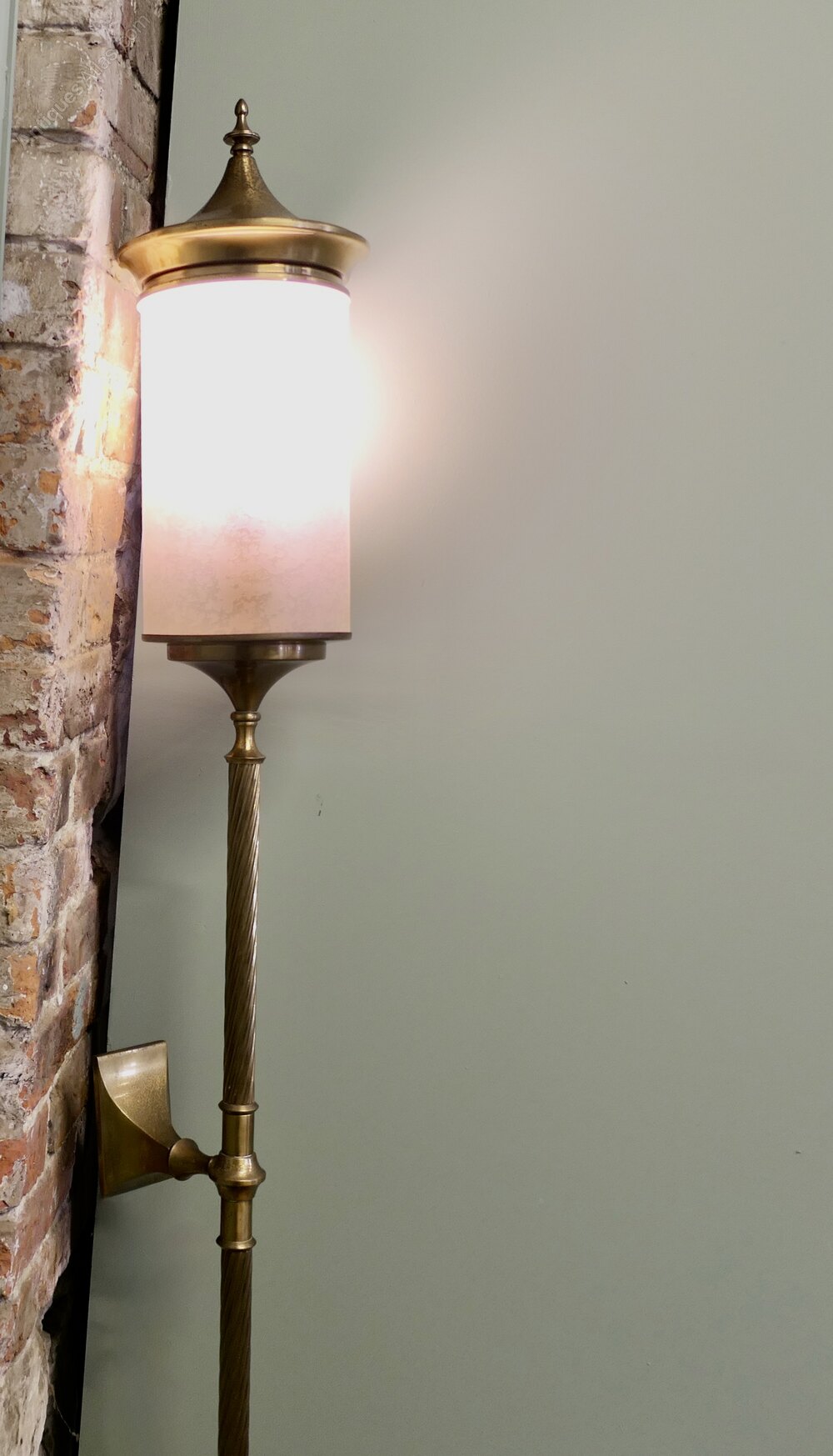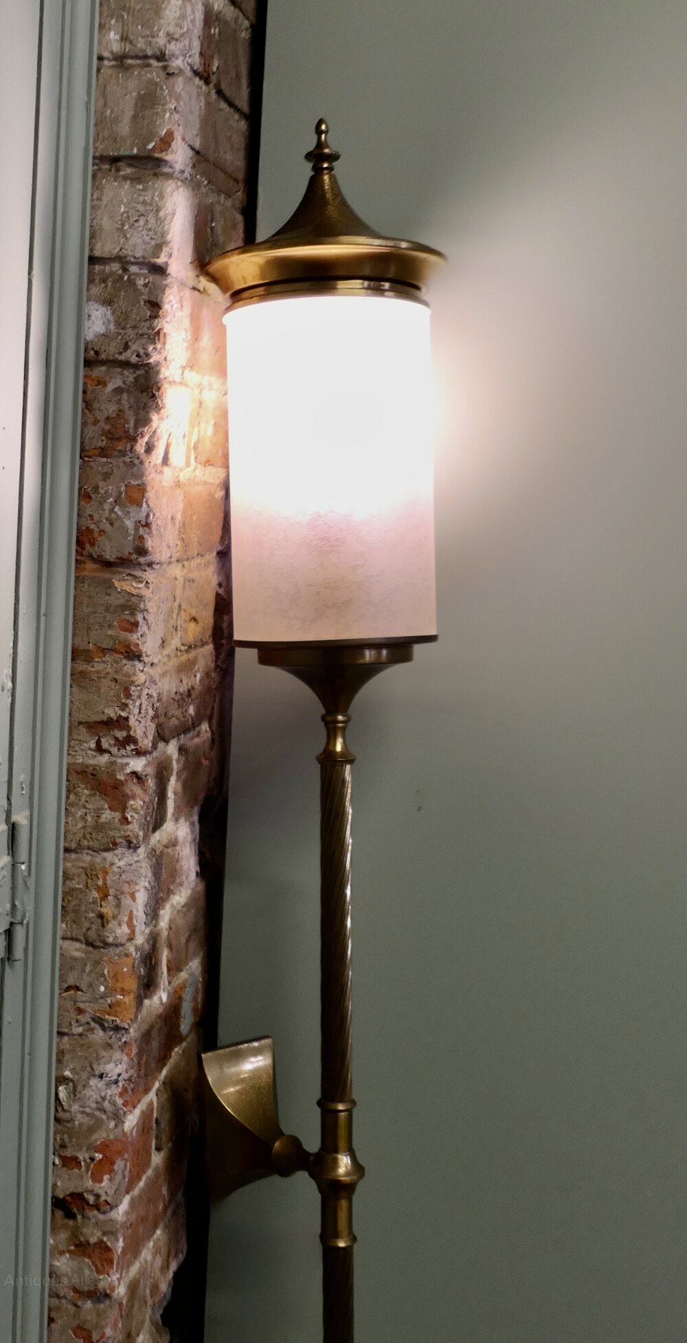 This is a very tall brass wall light in the style of a tall carriage light, the light is wall hanging, it has a long central column with a cylindrical opaline glass shade giving good illumination, a fantastic piece for a entrance or hallway