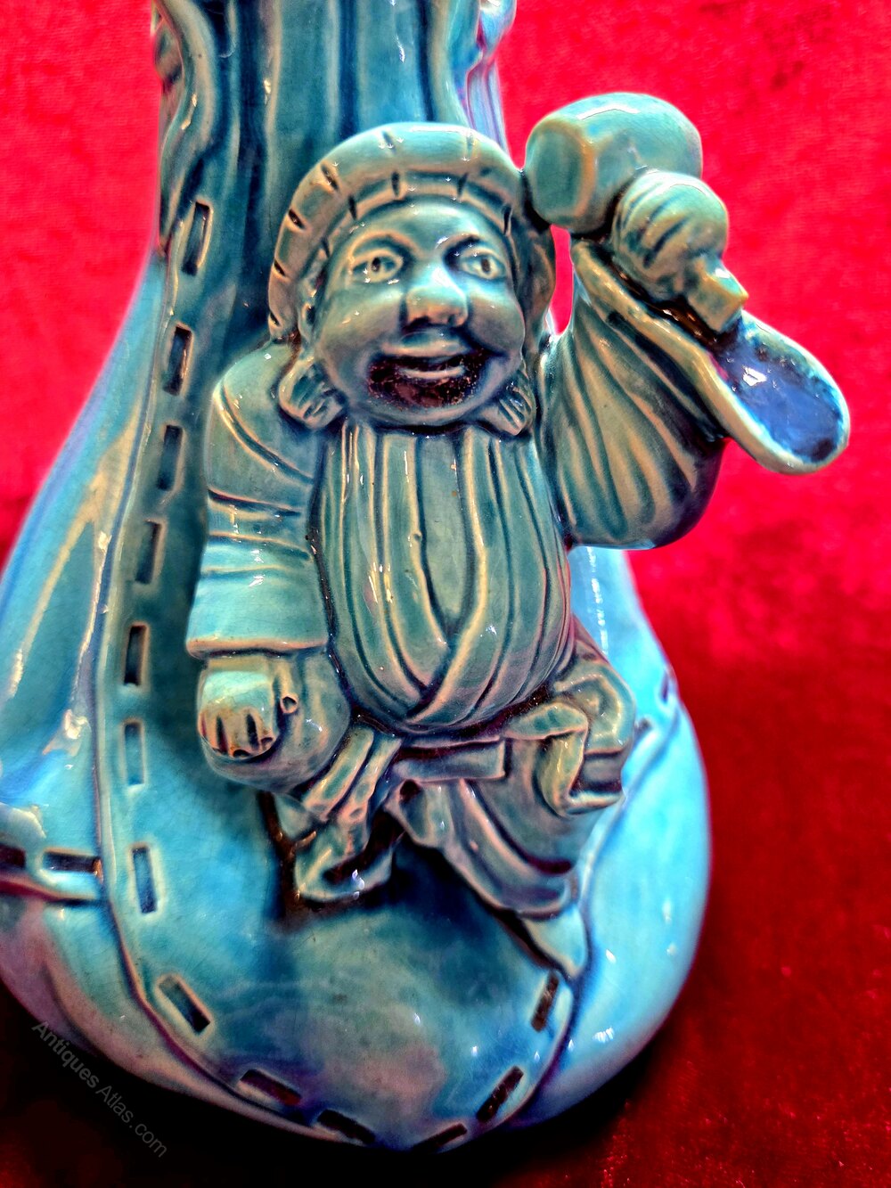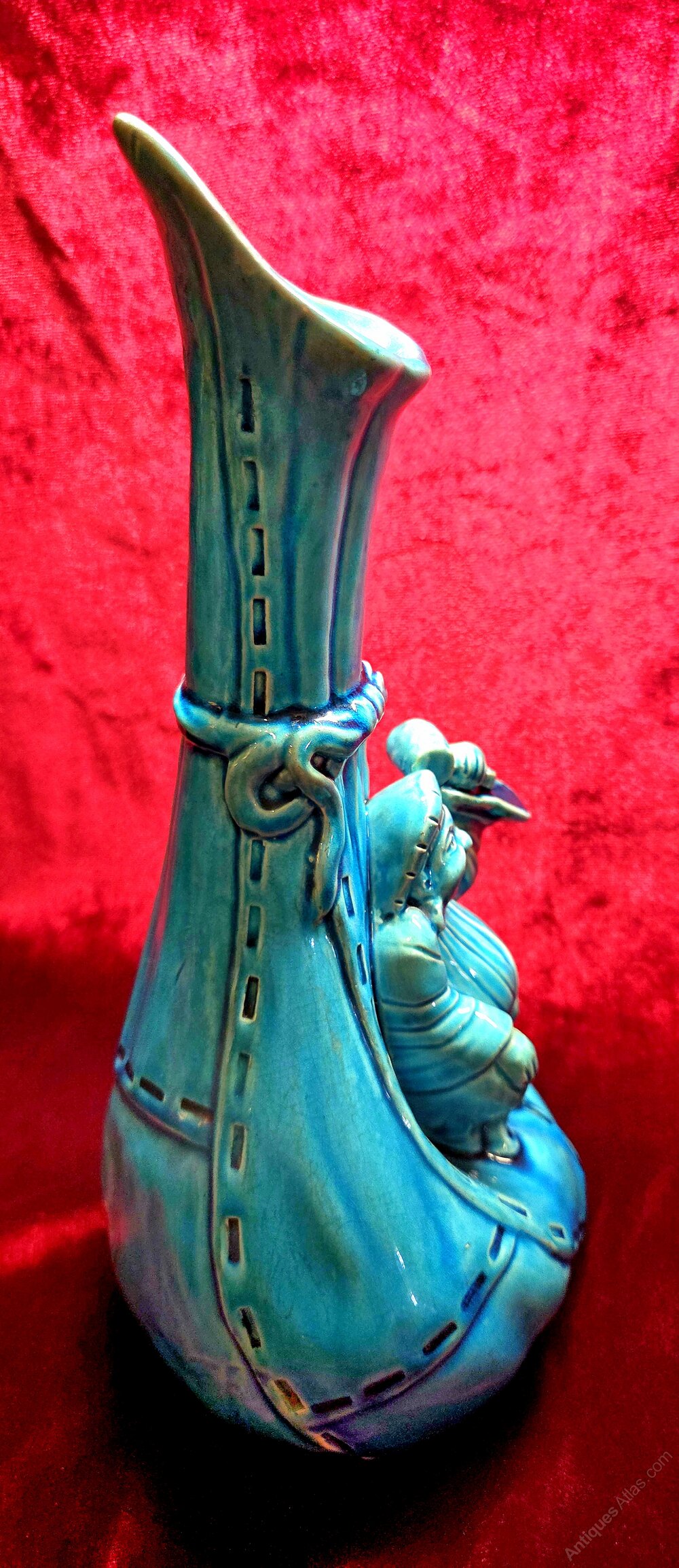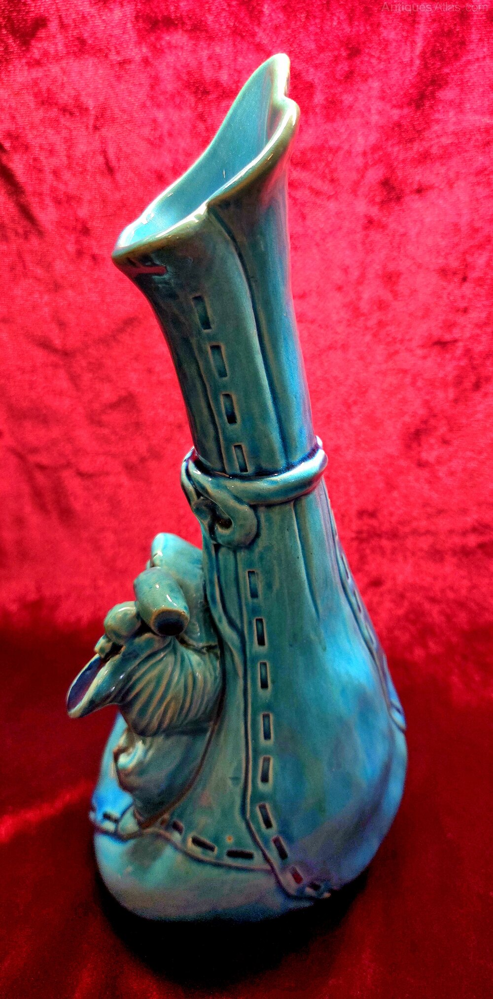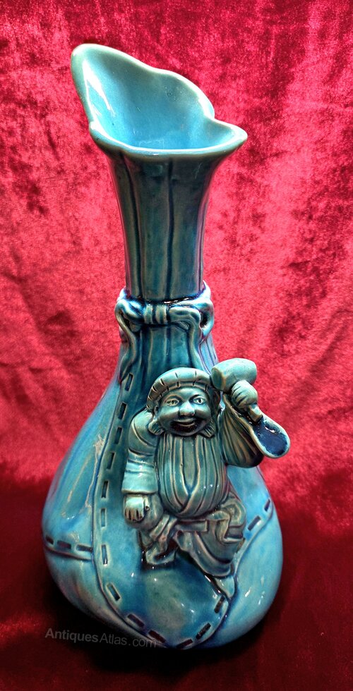 A rare Victorian Burmantofts Leeds pottery factory faience ware vase with Chinese man design in turquoise glaze. Stamped on base with factory marks. In excellent condition, no damage or restoration. Height 24.5cm. Width of base 10cm.
