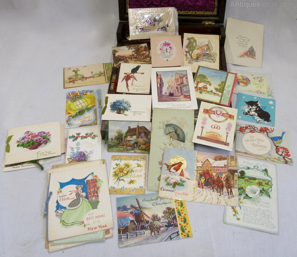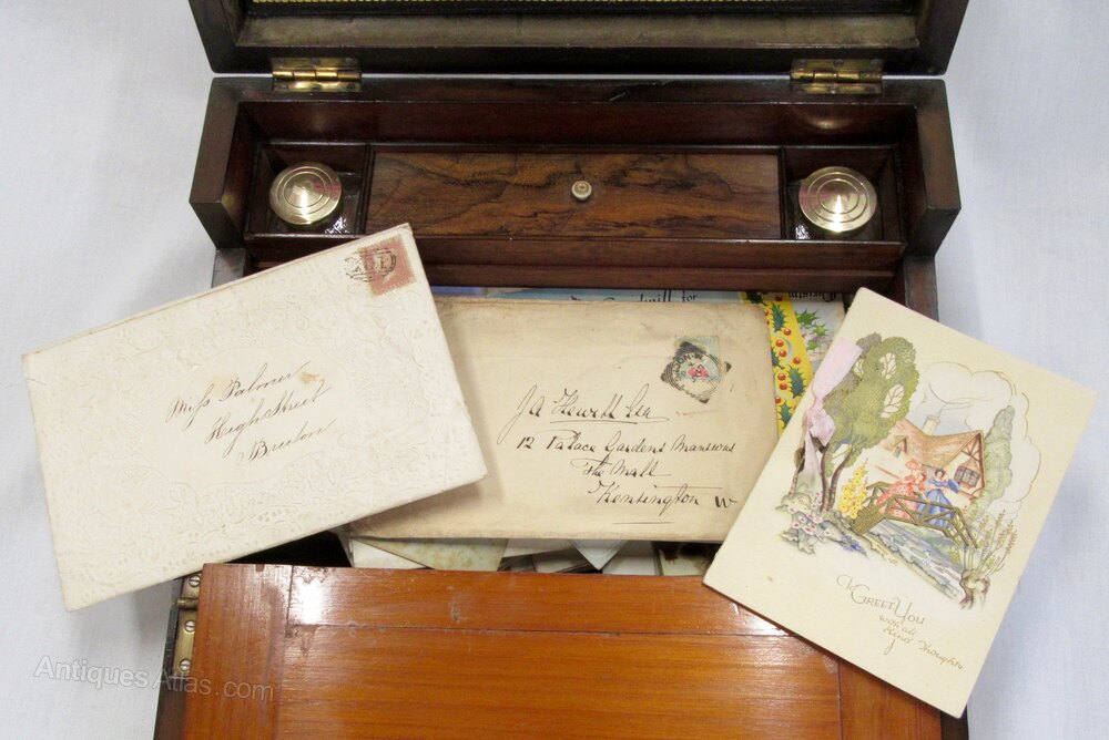 It has a lovely pair replacement inkwells, with various sealing waxes. It has a black leather in good condition. Probably the most interesting items are large abundance of interesting Christmas/birthday and good wishes cards still stored inside, some are late Victorian through to the twenties. There is also a large selection of correspondence some dating back to 1830, which is older than the box itself, all make for a fascinating reading. As these all came with slope so I'm keeping it all together.