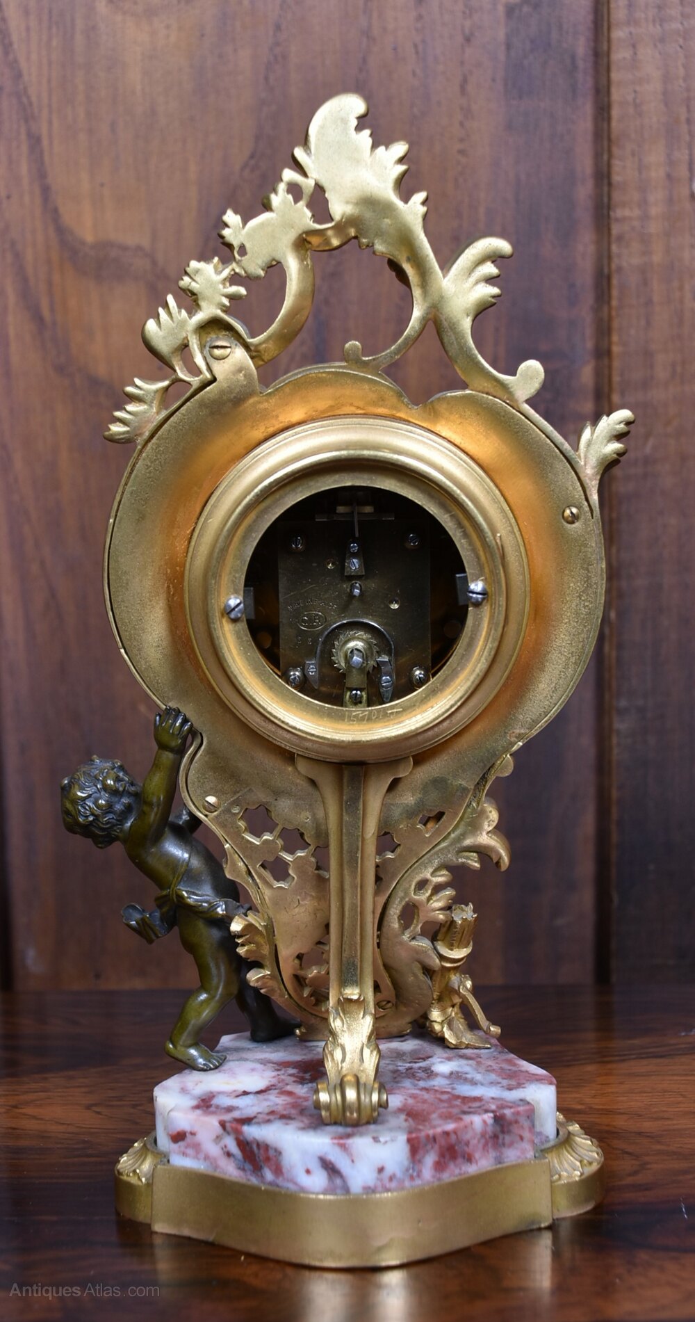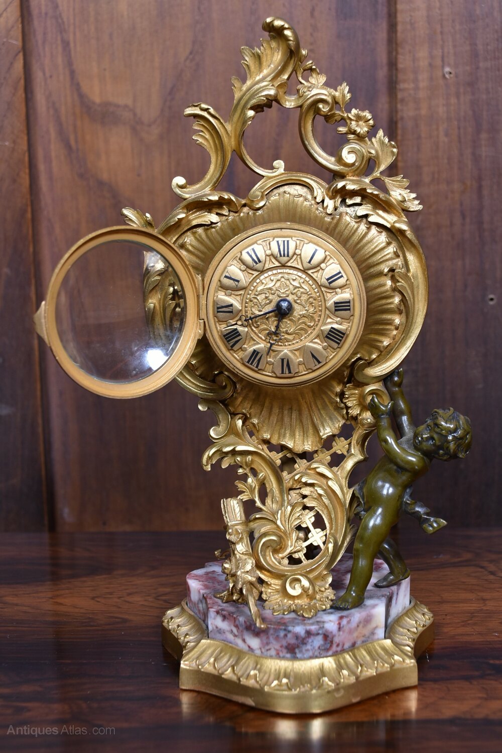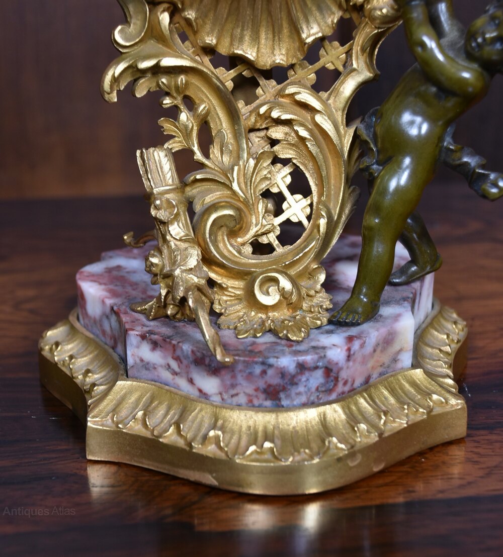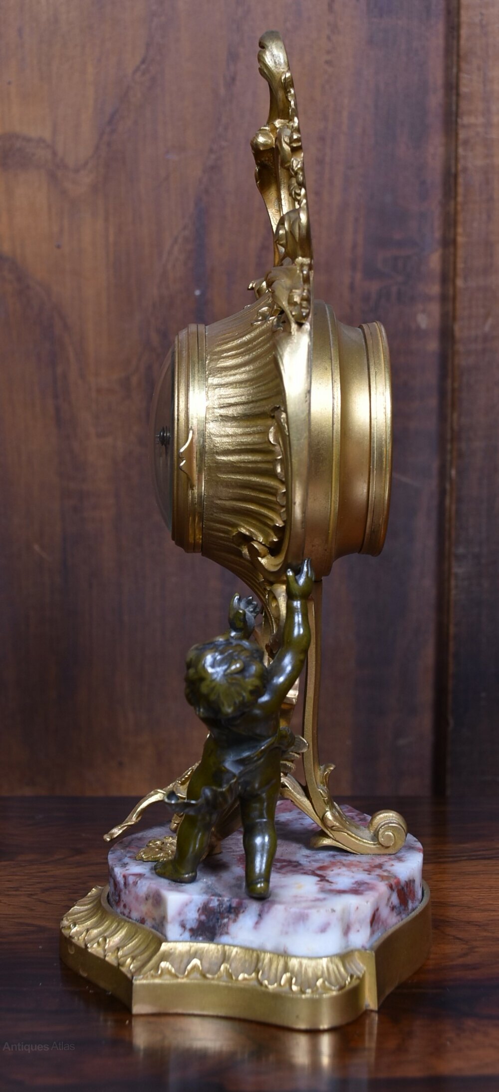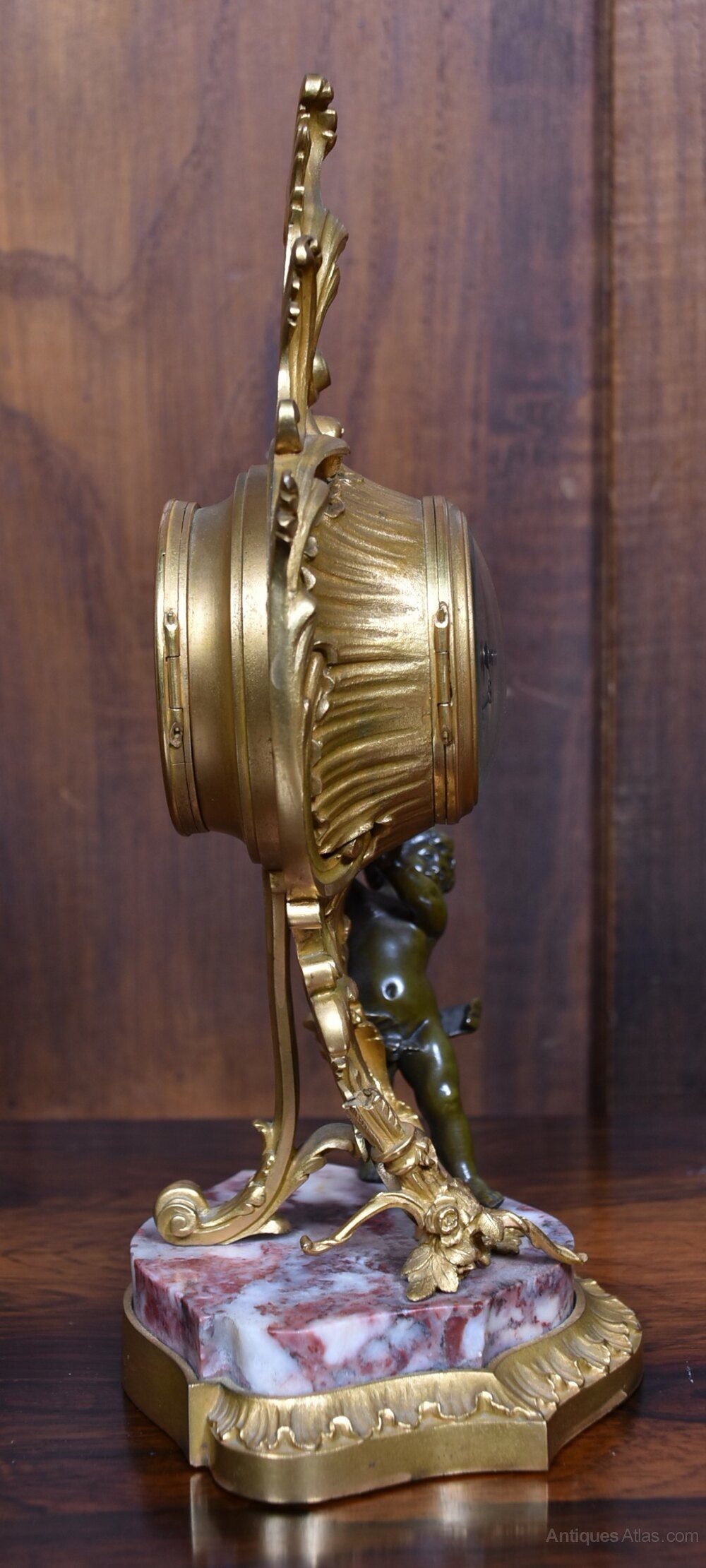 A richly decorative Victorian French mantel clock, brimming with character and period charm. The gilded bronze case is adorned with scrolling acanthus and floral motifs, framing a Roman numeral dial set above a finely cast cherub who appears to support the clock with serene grace. The base is a polished slab of pink and grey-veined marble, resting on a shaped gilt plinth that echoes the opulence of the design. A striking and sculptural timepiece, steeped in 19th-century elegance.